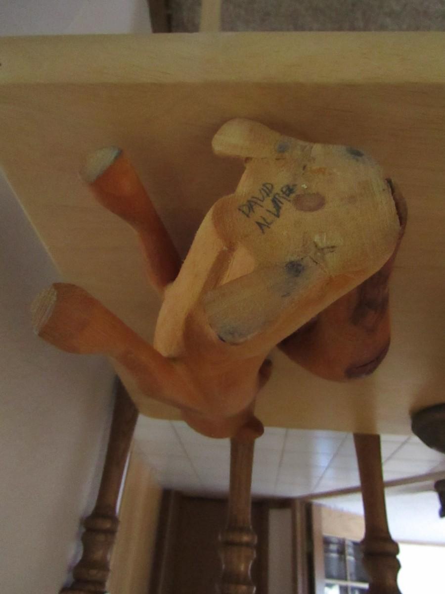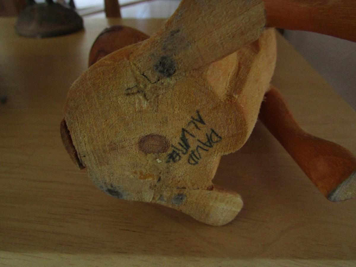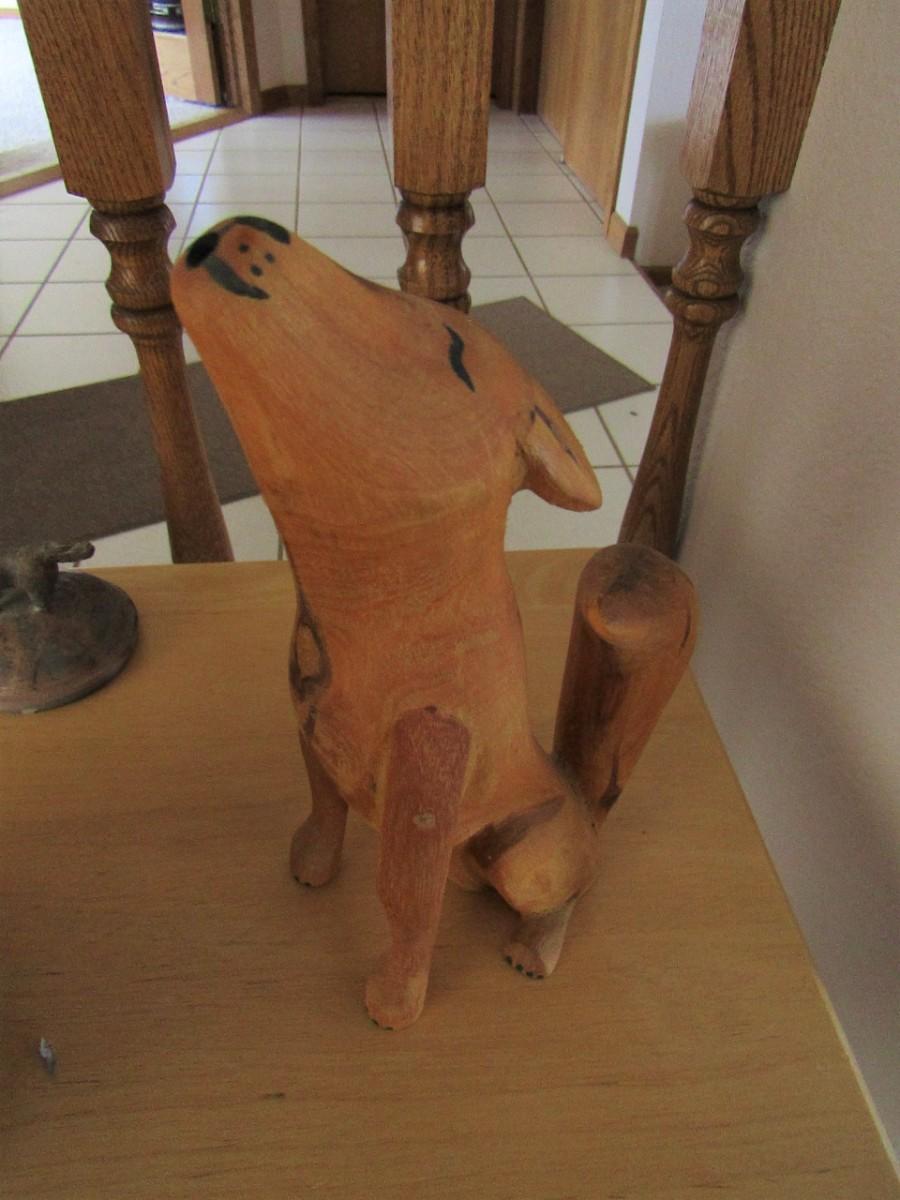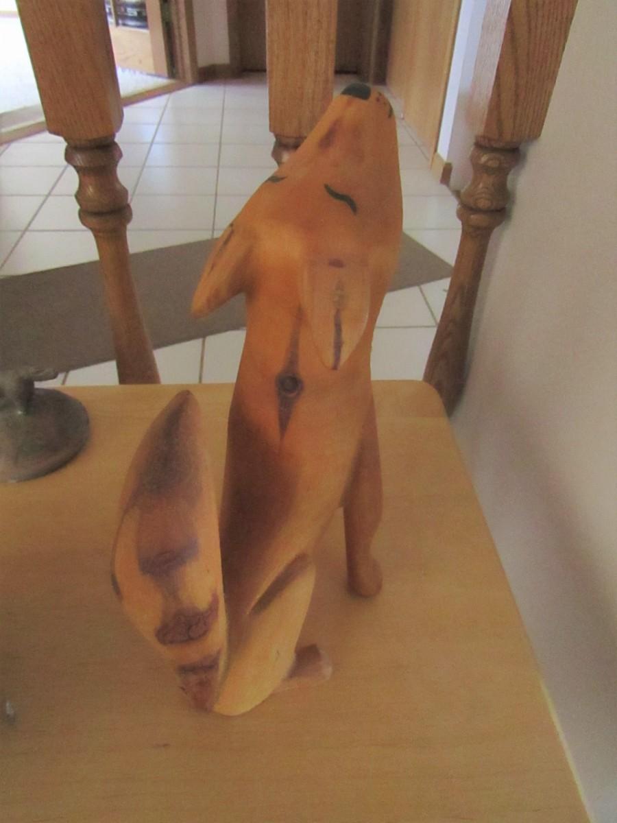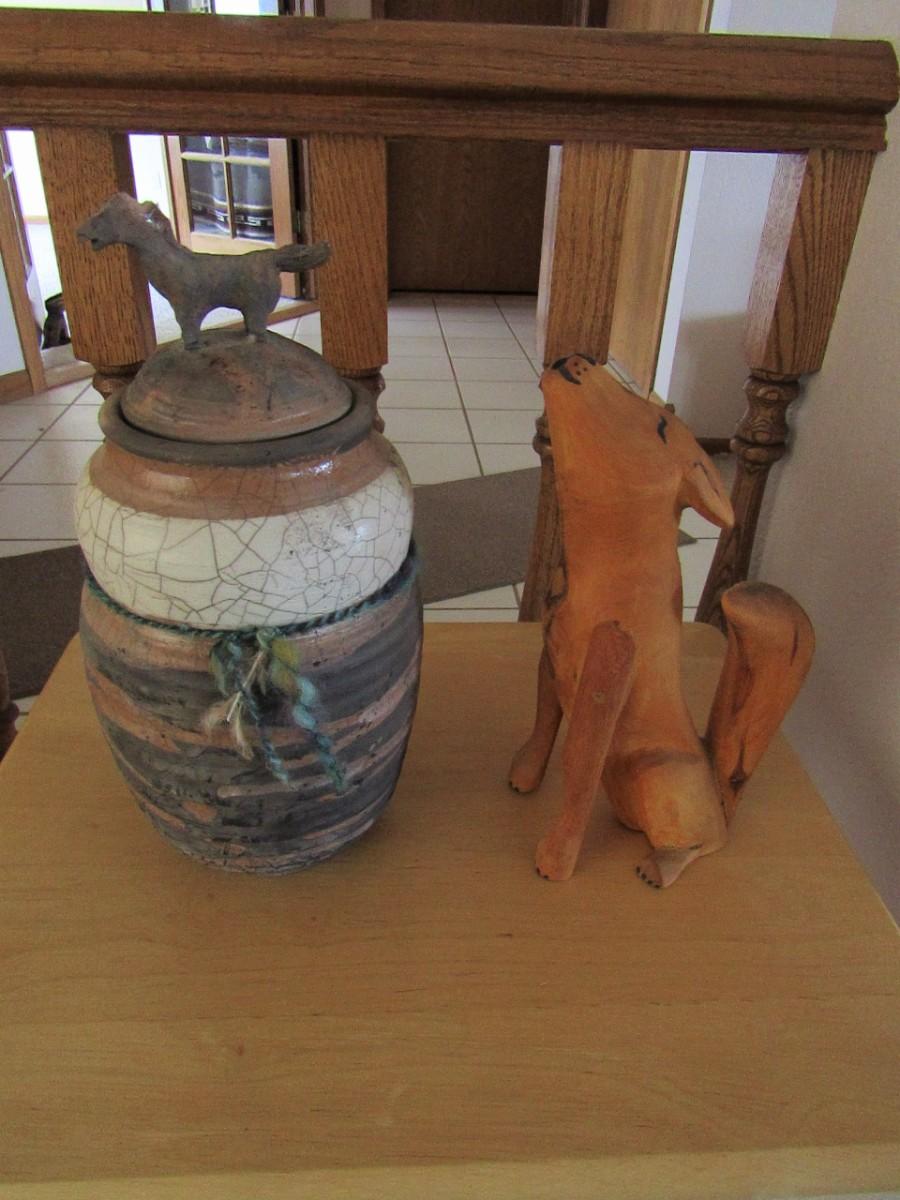 LOT 131  SIGNED CLAY POT AND SIGNED CARVE WOODEN COYOTE (E)