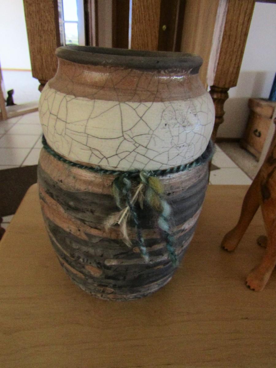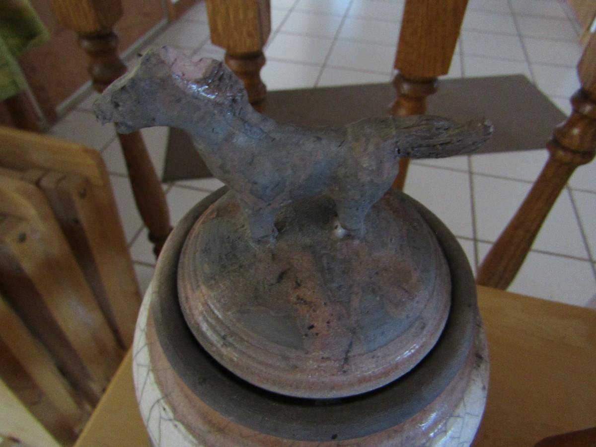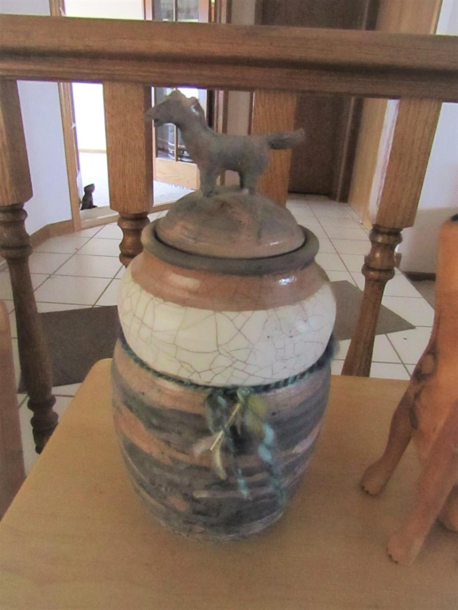 CLAY POT IS APPROX 12" TALL THE HORSE ON TOP OF THE LID HAS LOST PART OF ITS MANE