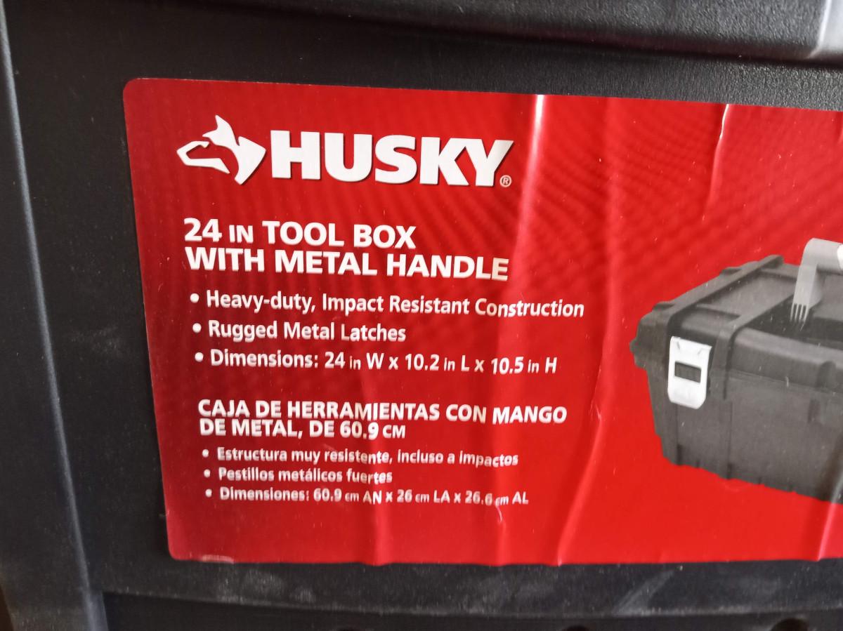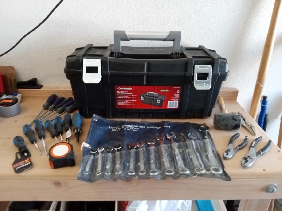 LOT 131  HUSKY PLASTIC TOOL BOX, WRENCH SET AND HAND TOOLS