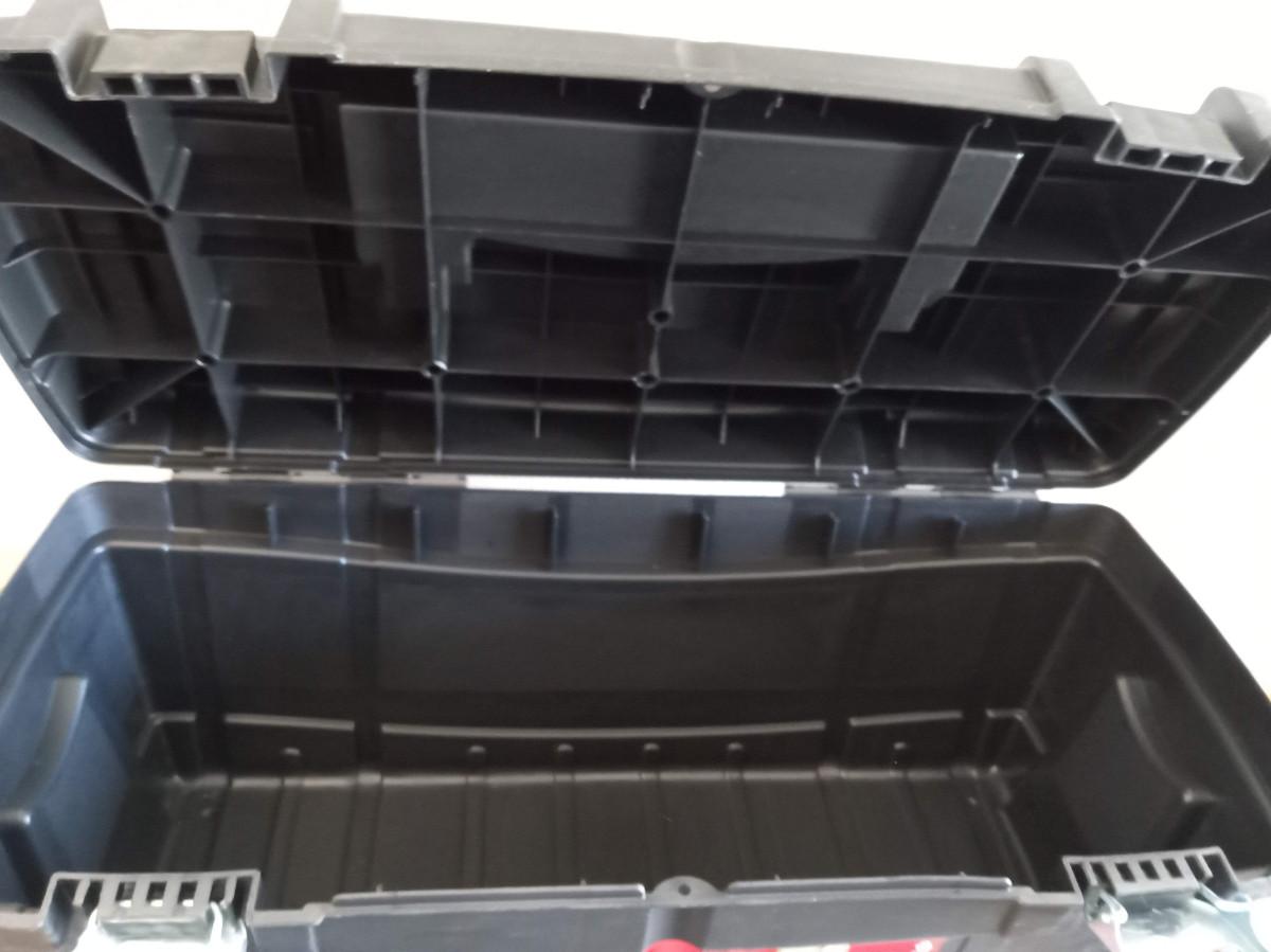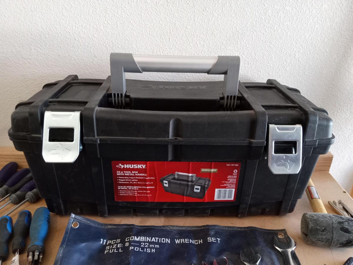 LOT 131 HUSKY PLASTIC TOOL BOX, WRENCH SET AND HAND TOOLS