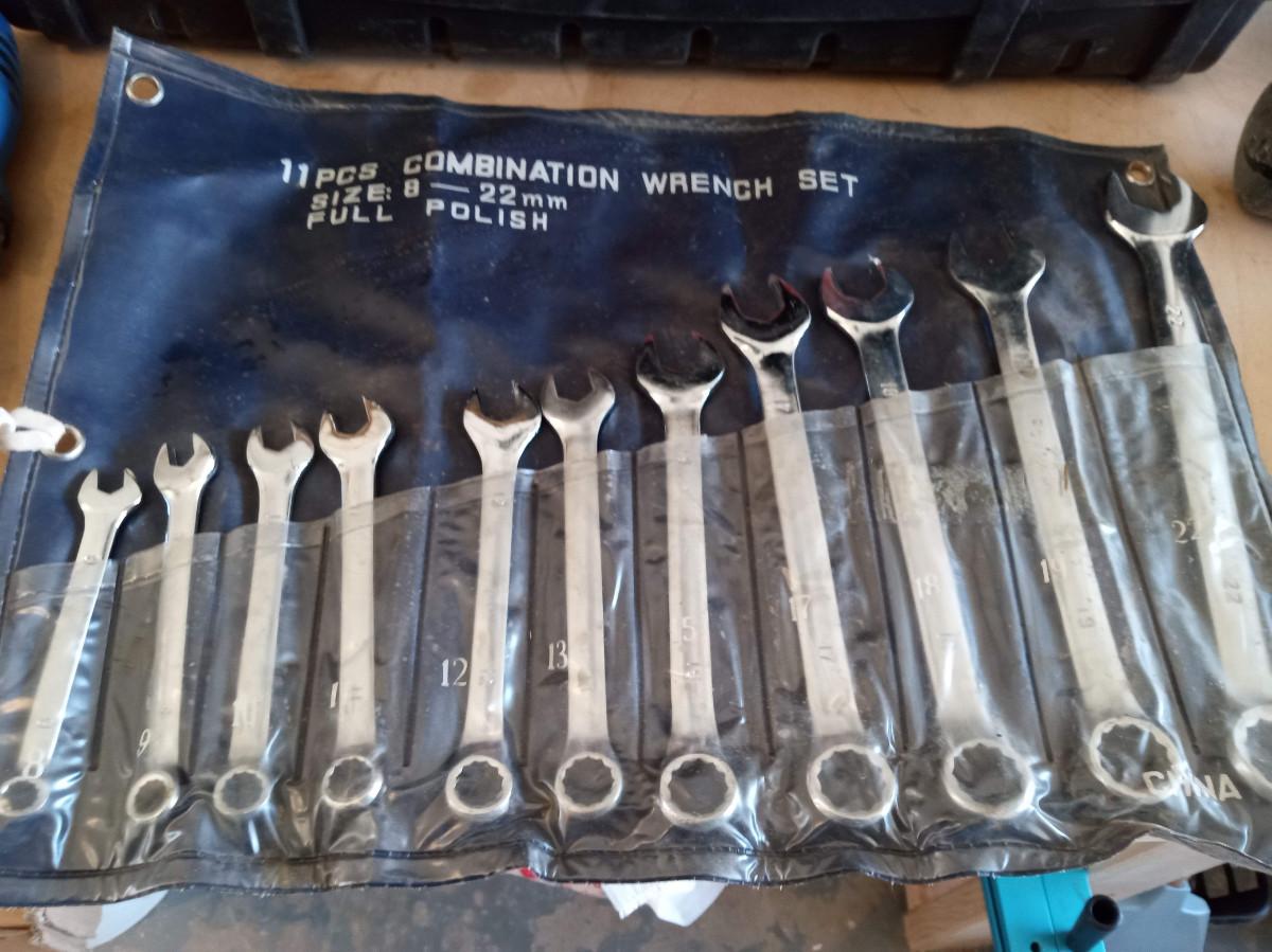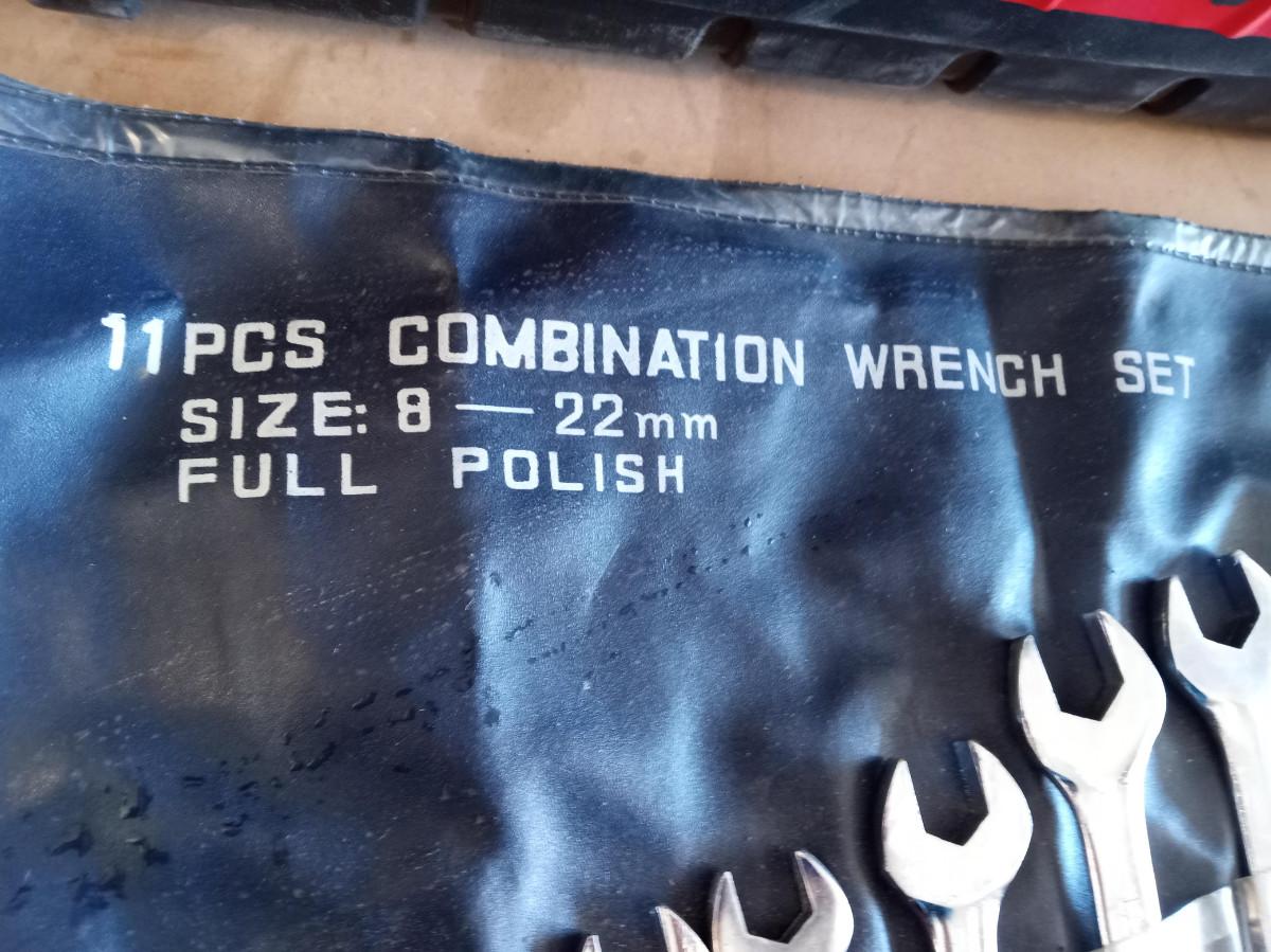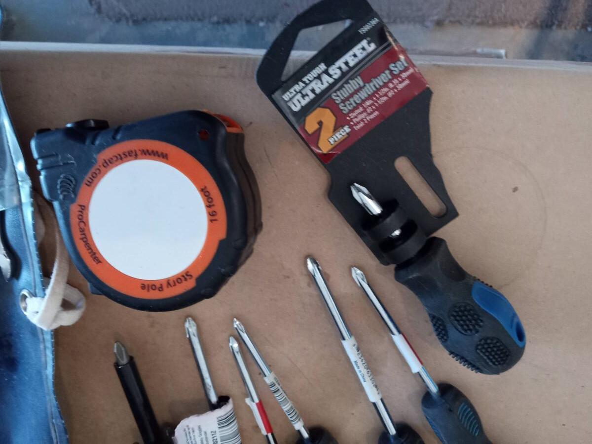 11 PC COMBINATION WRENCH SET, SCREWDRIVERS, TAPE MEASURE, PLIERS, VISE GRIPS, RUBBER MALLET AND A 24" TOOL BOX