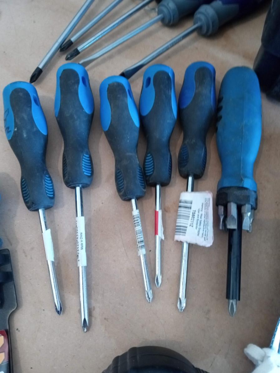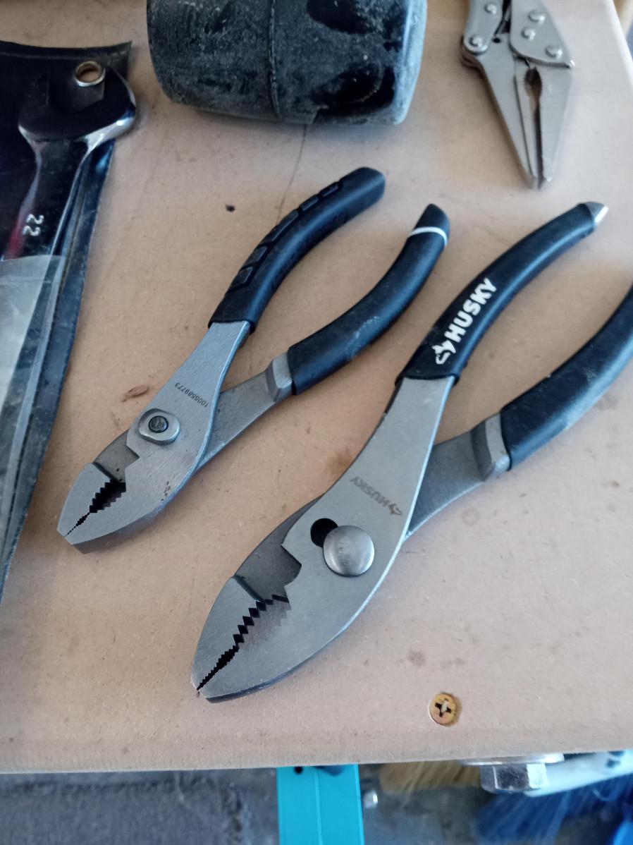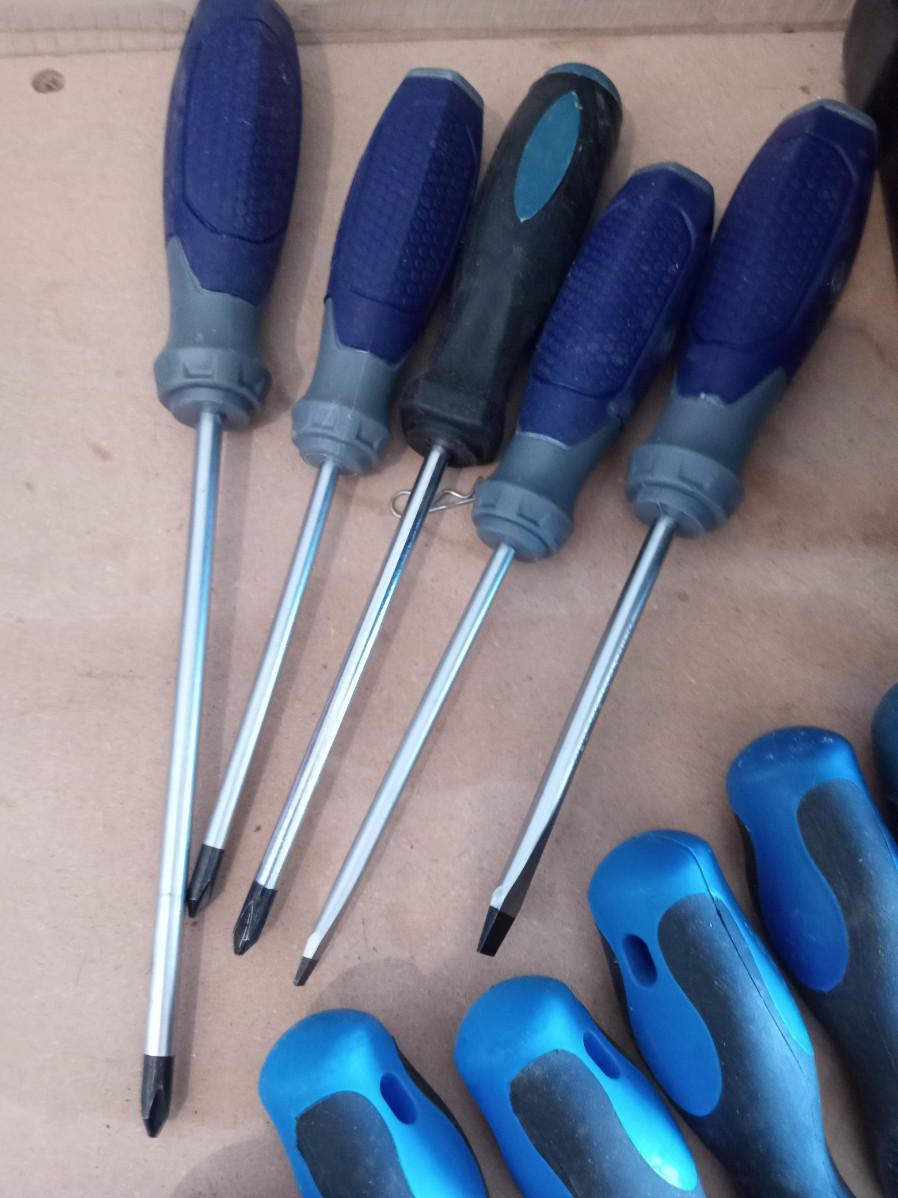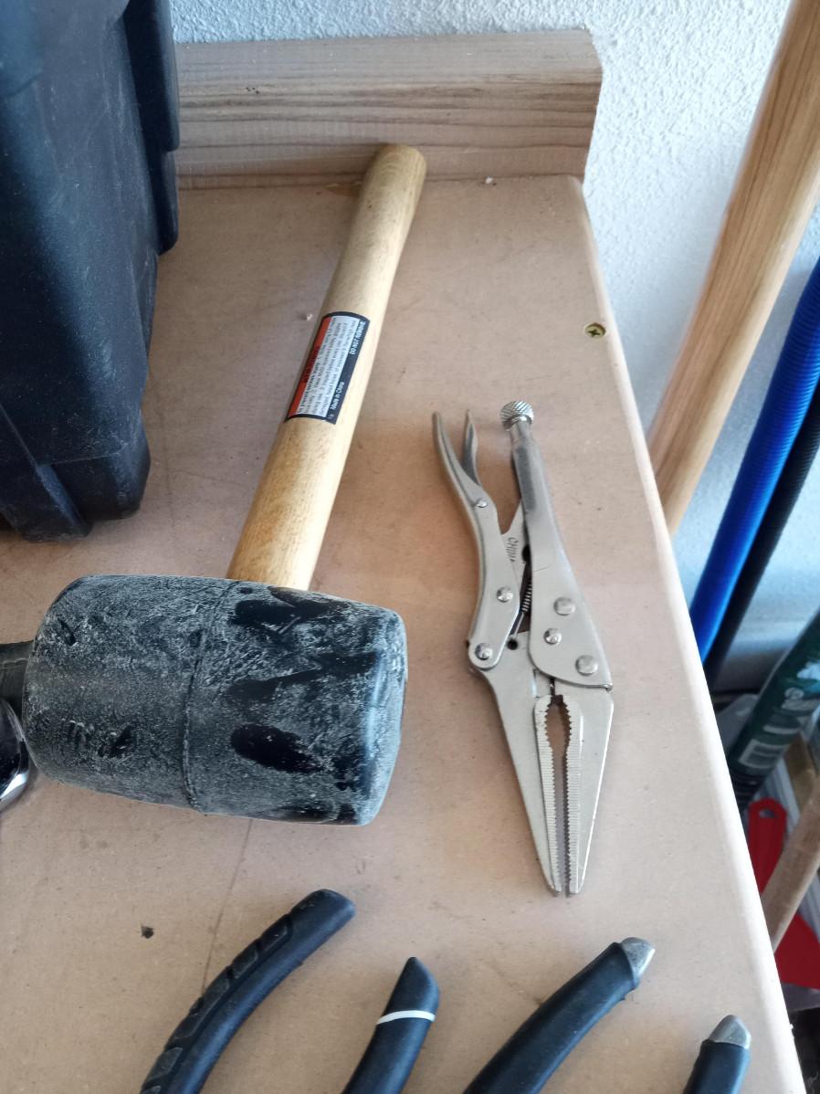 11 PC COMBINATION WRENCH SET, SCREWDRIVERS, TAPE MEASURE, PLIERS, VISE GRIPS, RUBBER MALLET AND A 24" TOOL BOX