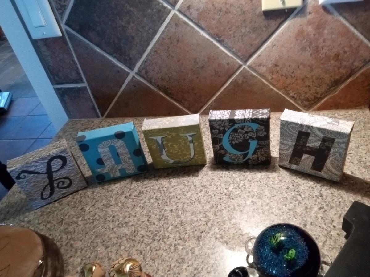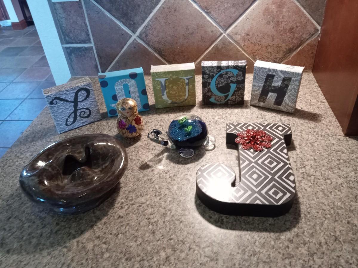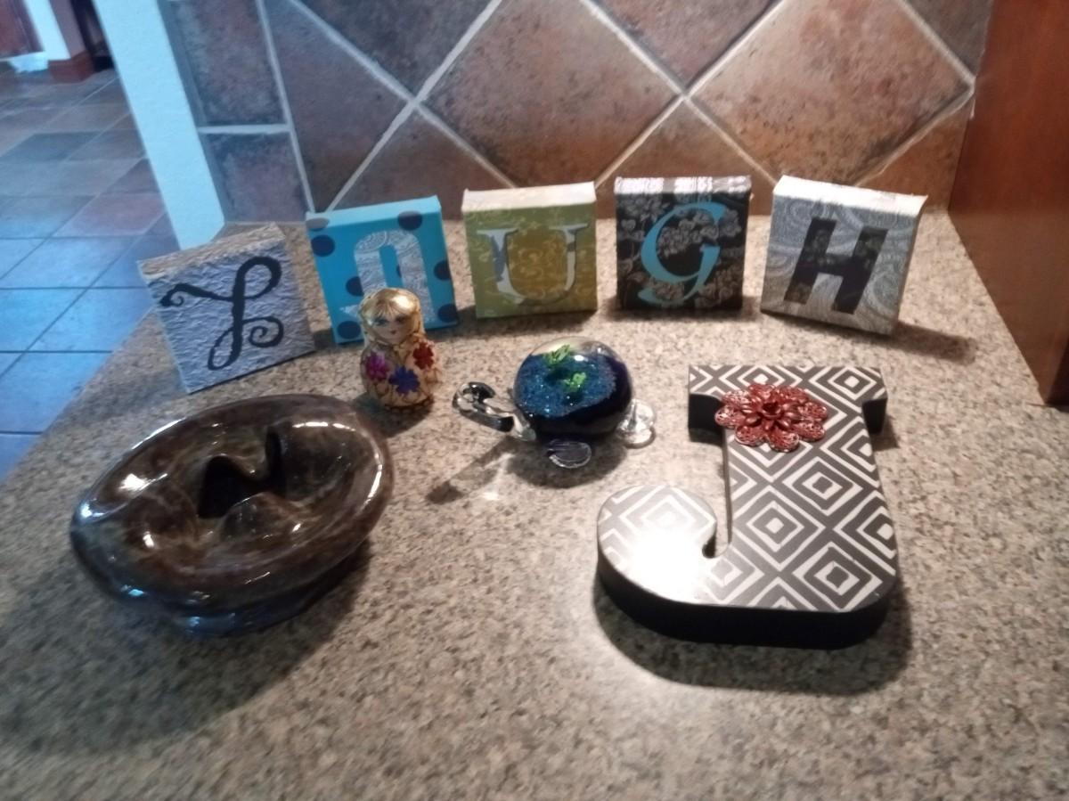 CANVAS "LAUGH" AND A "J" WALL DECOR, CLAY BOWL