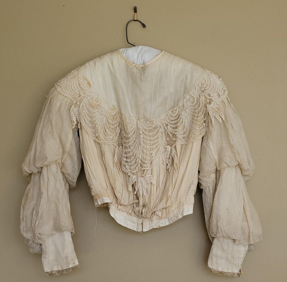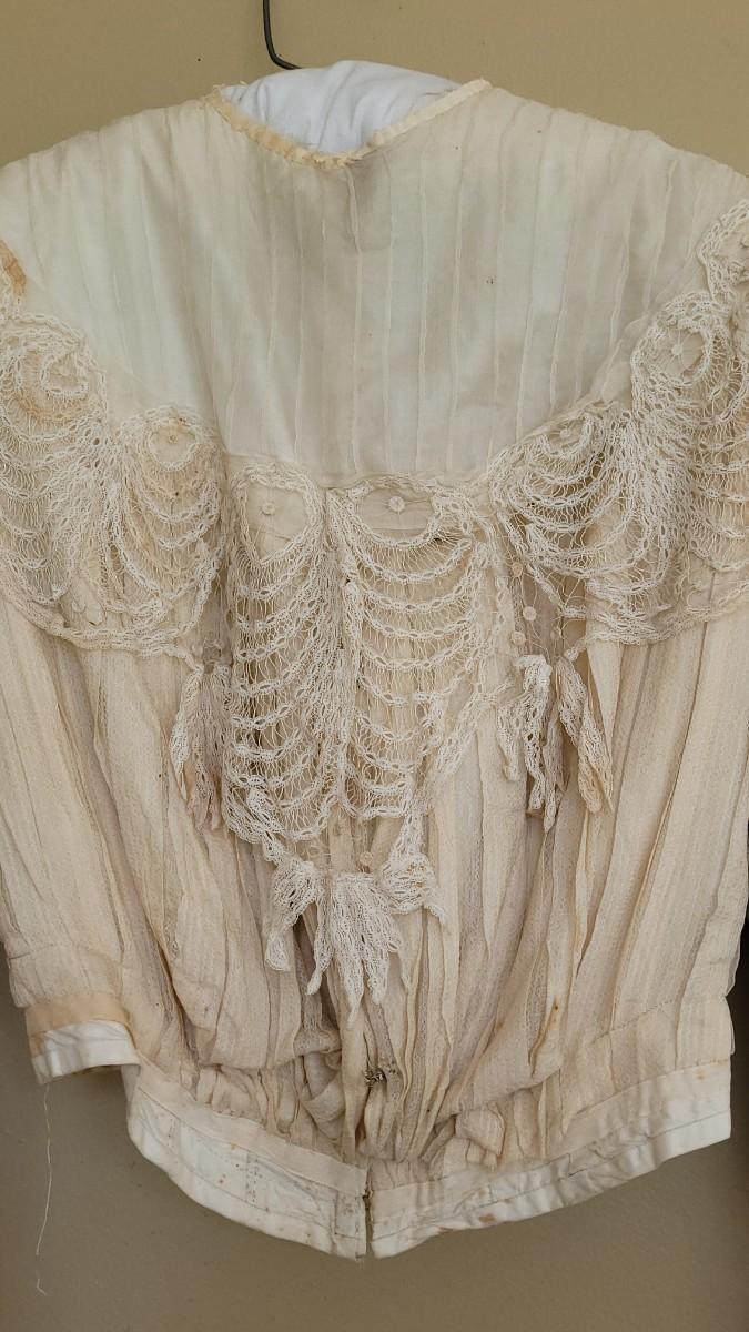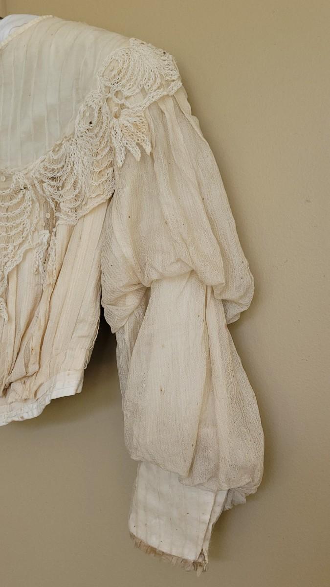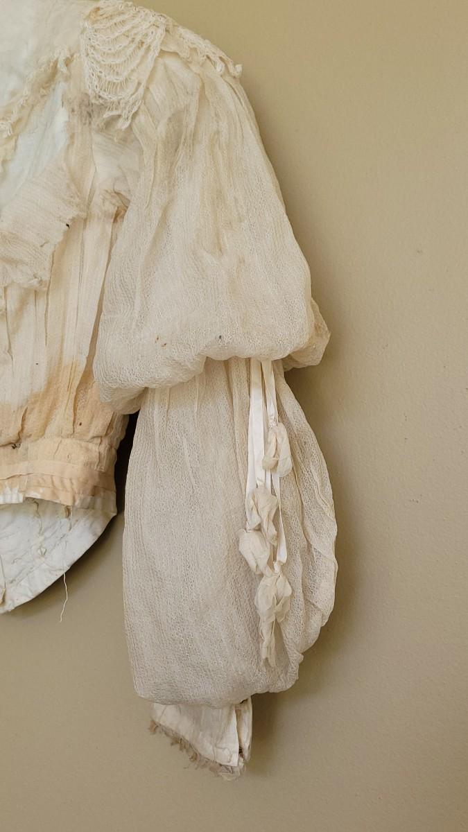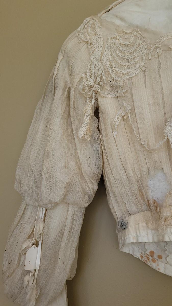 Puff sleeve blouse with ribbon tassels on the sleeves and lace trimmings. One side is much better condition that the other. This blouse is double fabric and the tears are to the top fabric. There are also some discoloration spots.
