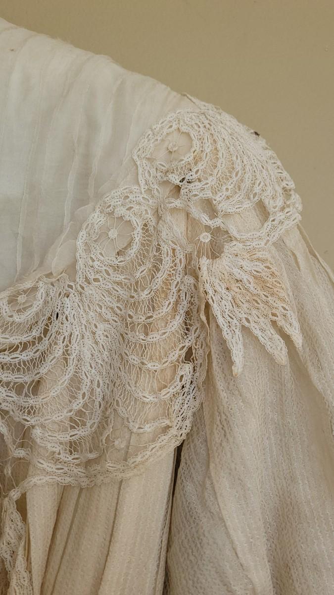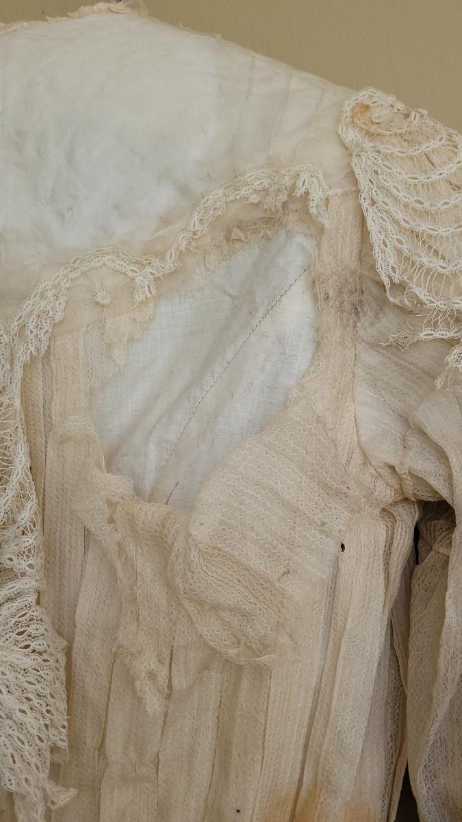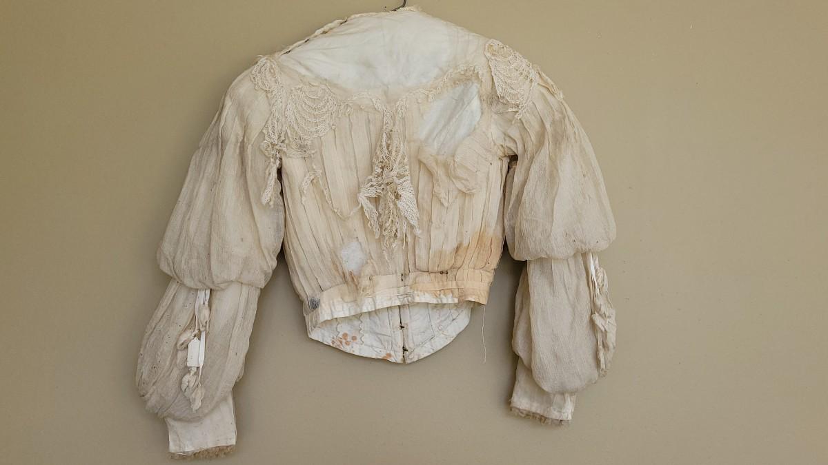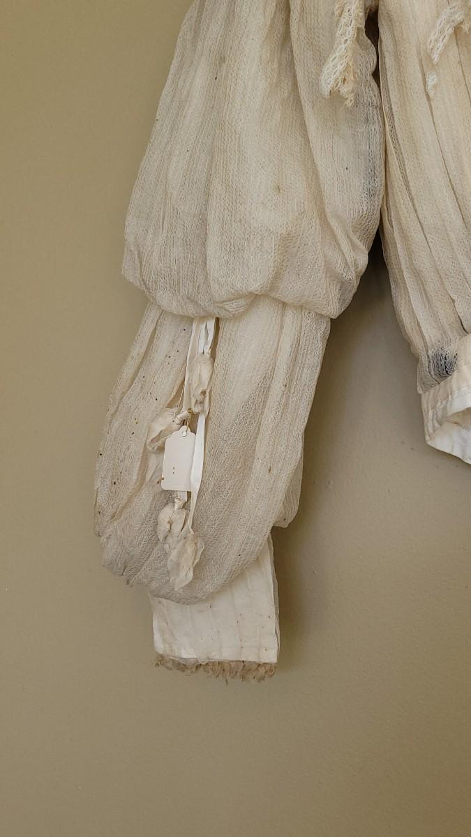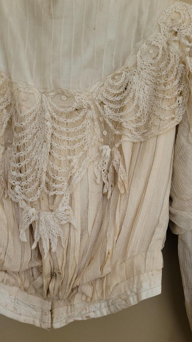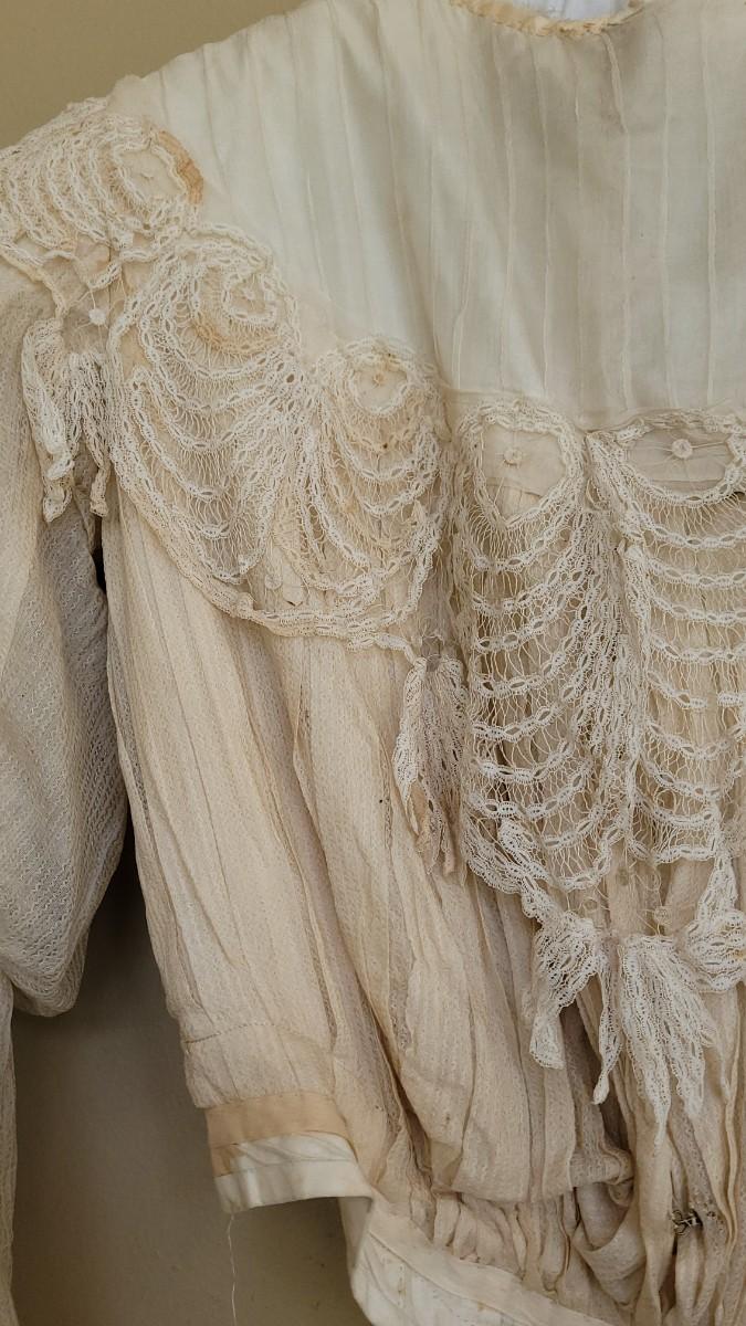 Puff sleeve blouse with ribbon tassels on the sleeves and lace trimmings. One side is much better condition that the other. This blouse is double fabric and the tears are to the top fabric. There are also some discoloration spots.