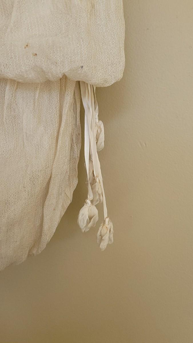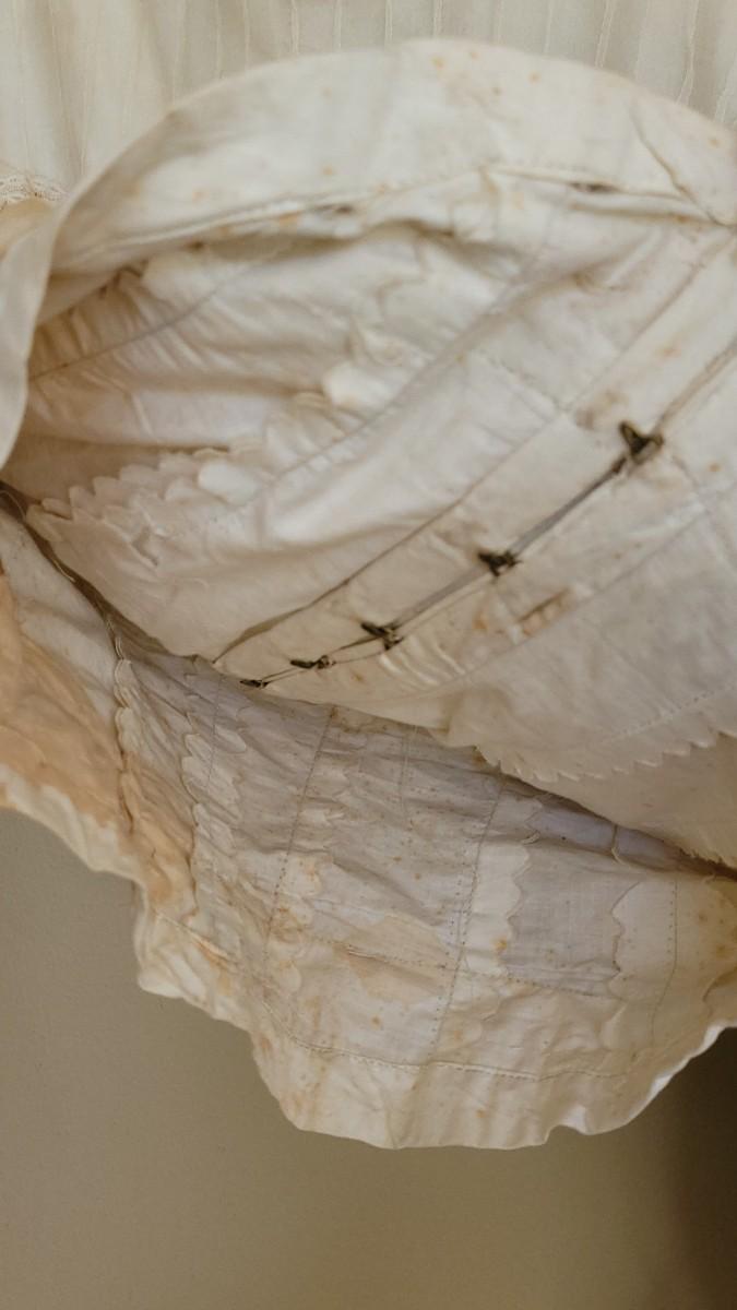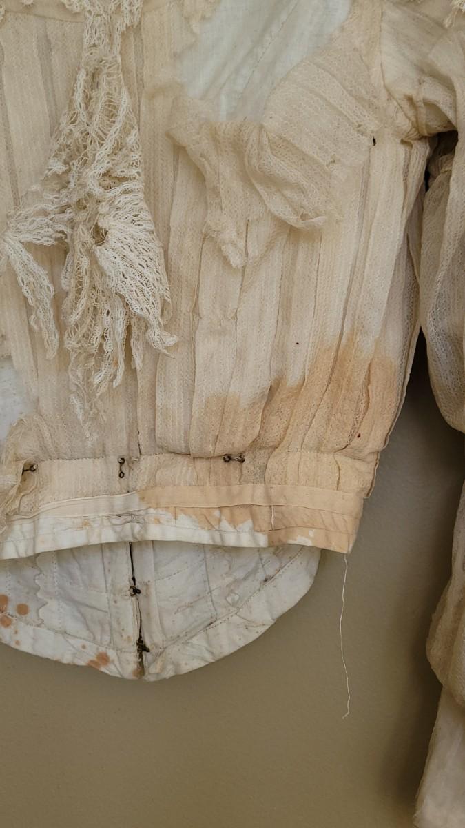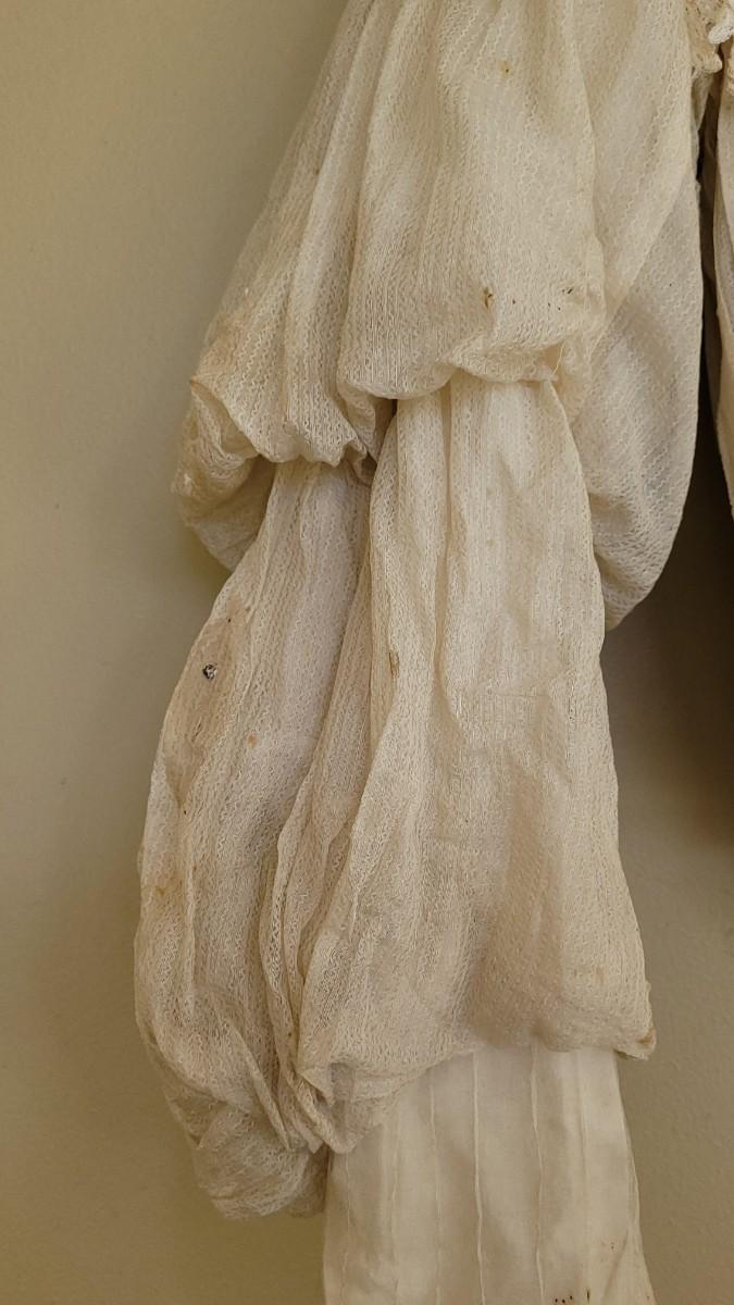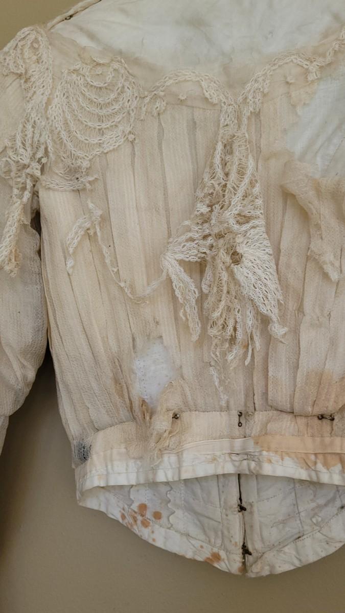 Puff sleeve blouse with ribbon tassels on the sleeves and lace trimmings. One side is much better condition that the other. This blouse is double fabric and the tears are to the top fabric. There are also some discoloration spots.