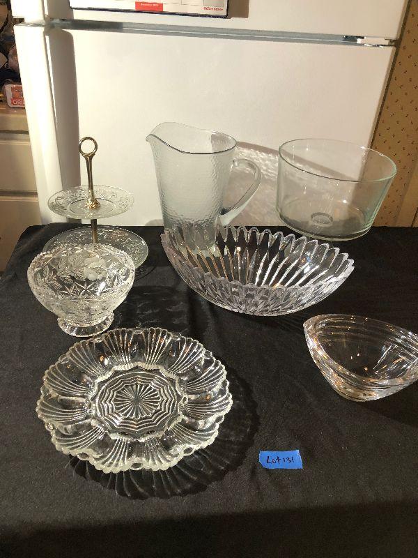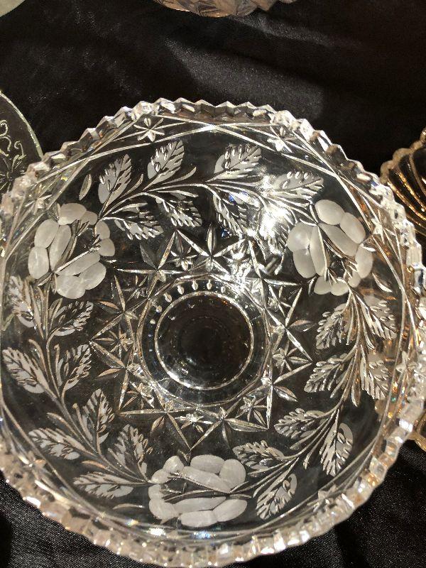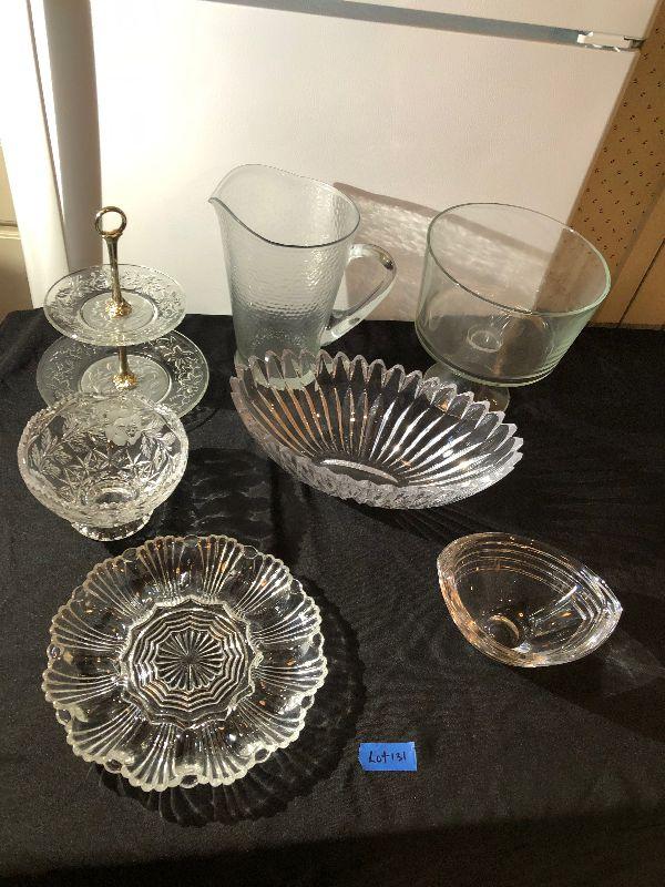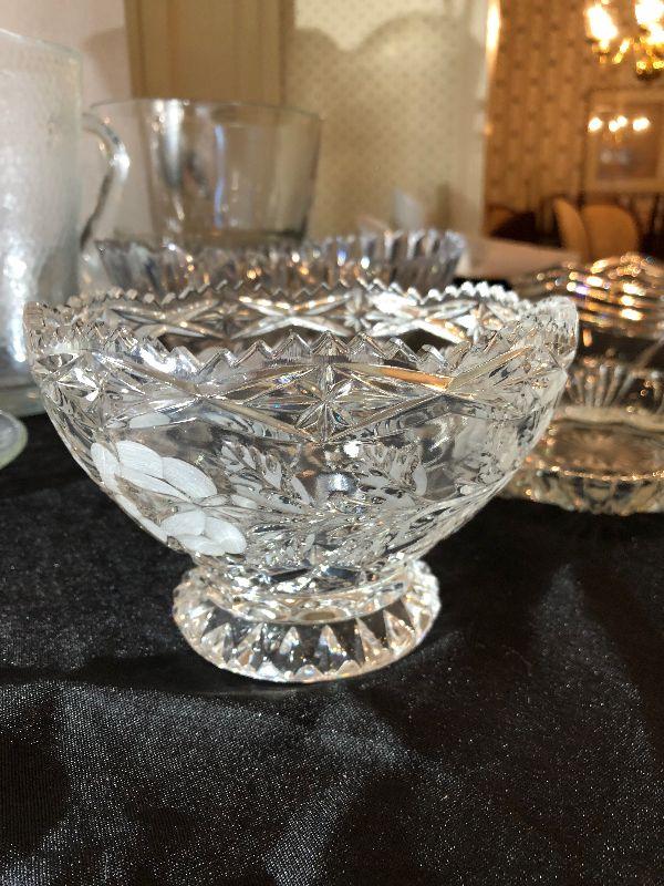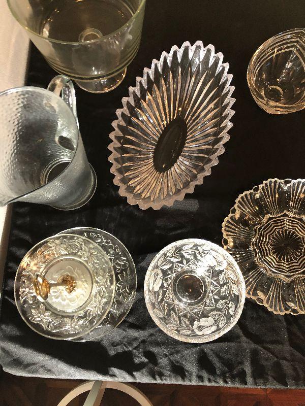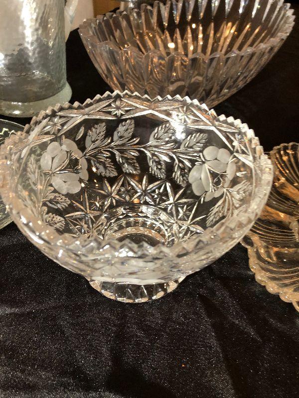 Assortment of Crystal and Glass Pieces (Some Vintage) including an American Brilliant Bowl, a 2 Tier Tray, a Truffle Bowl, a Pitcher and Other Fine Decorative Serving Pieces..