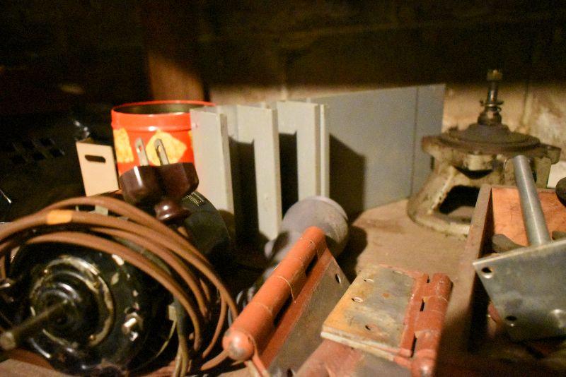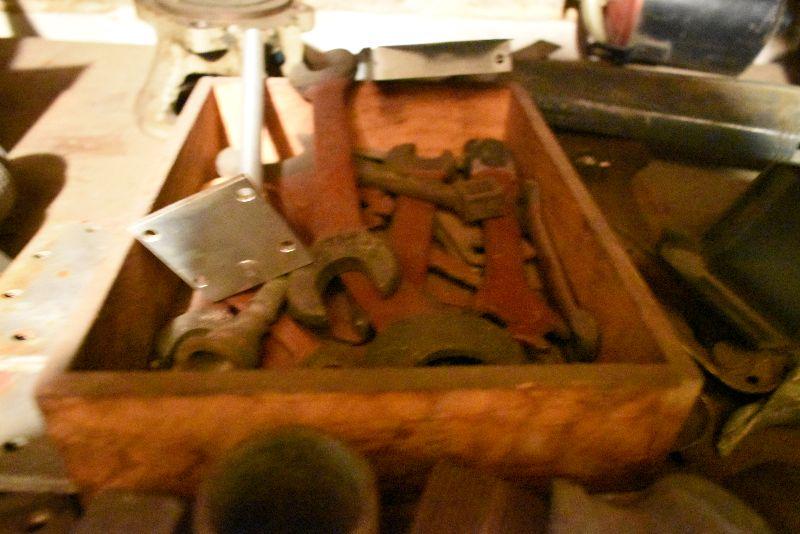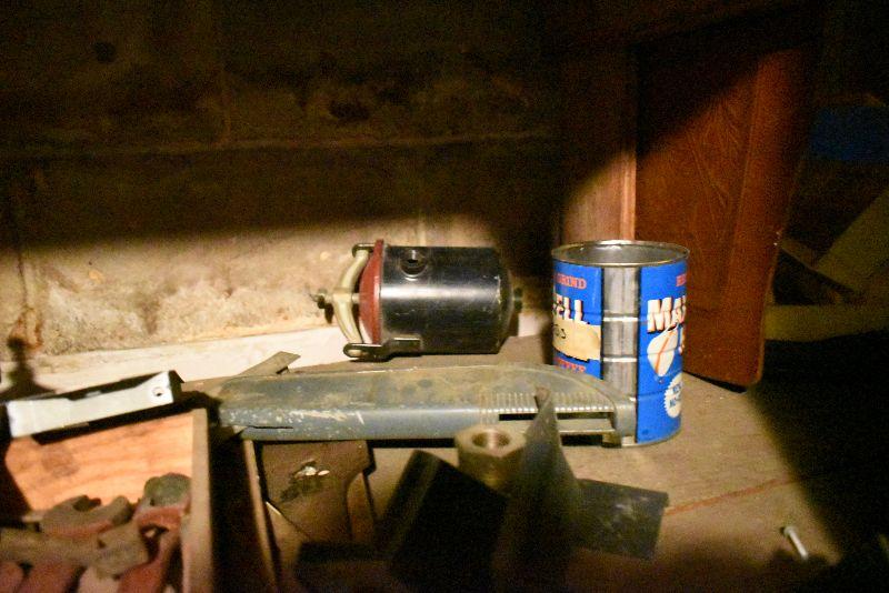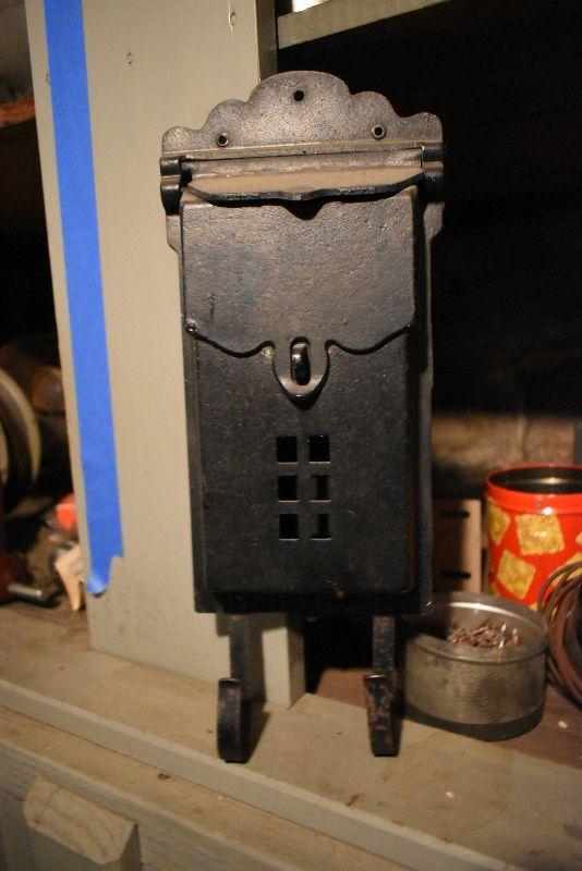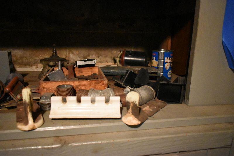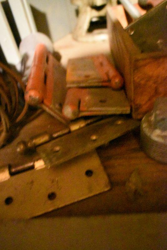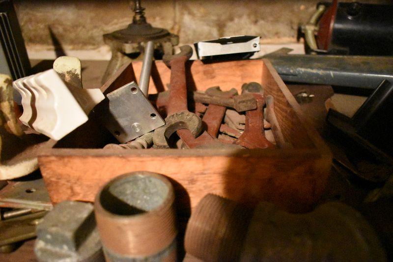 Metal mailbox, antique toothbrush holder, box of wrenches, nails, hinges, and more.
