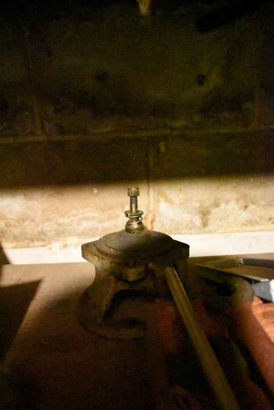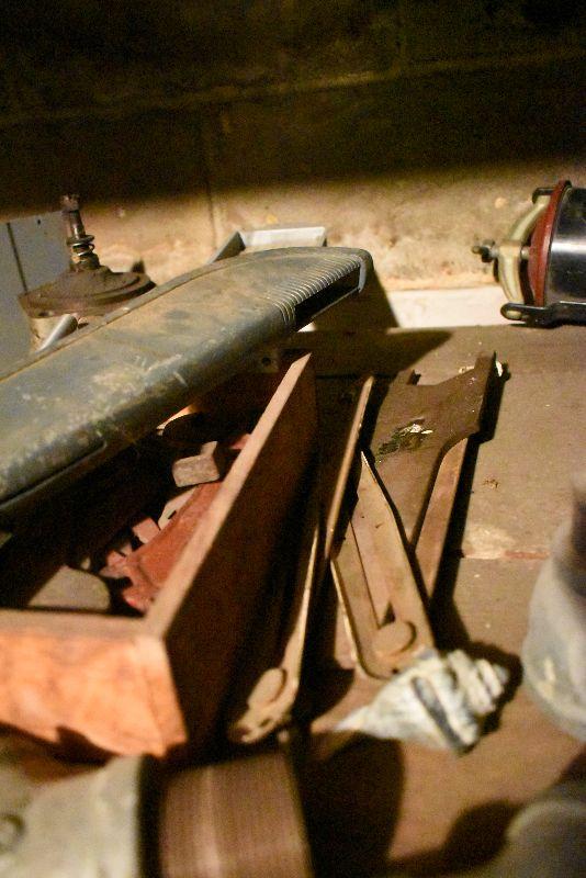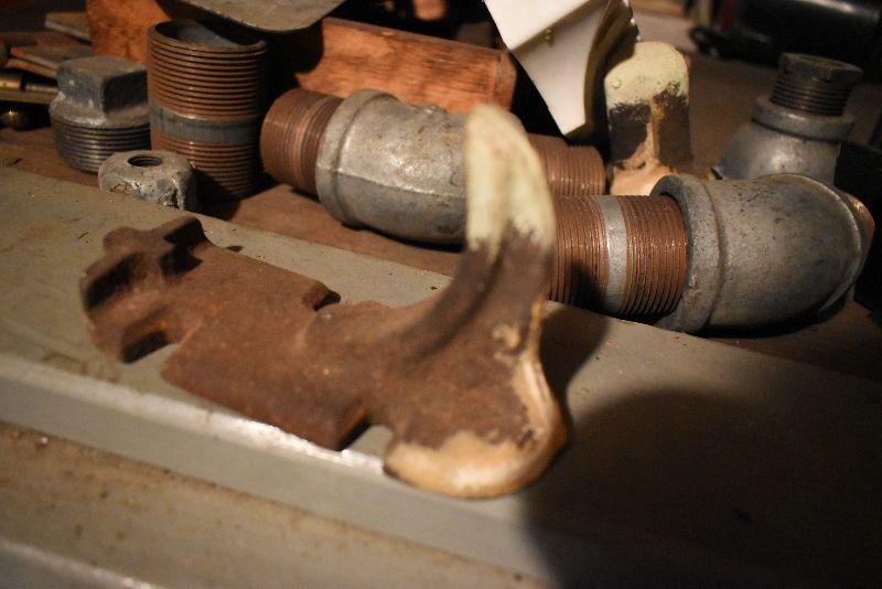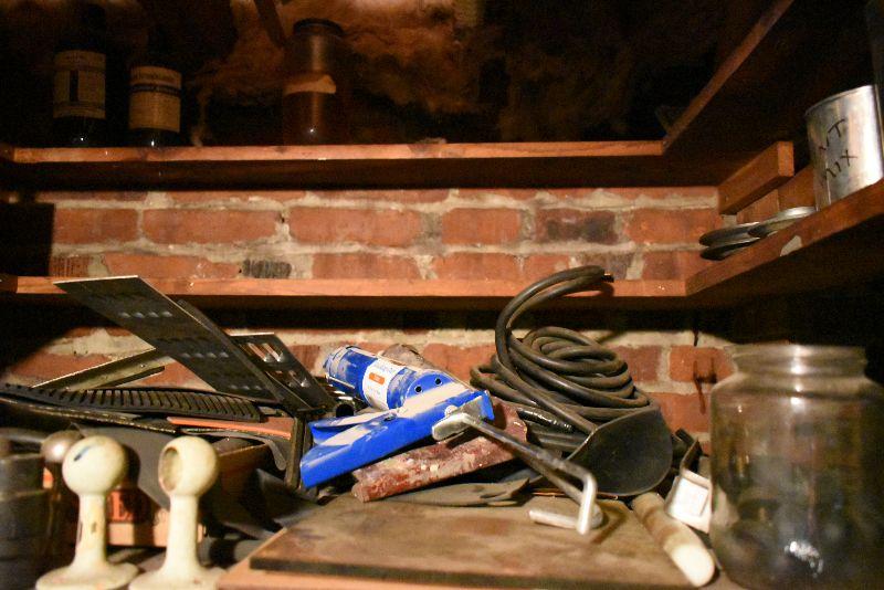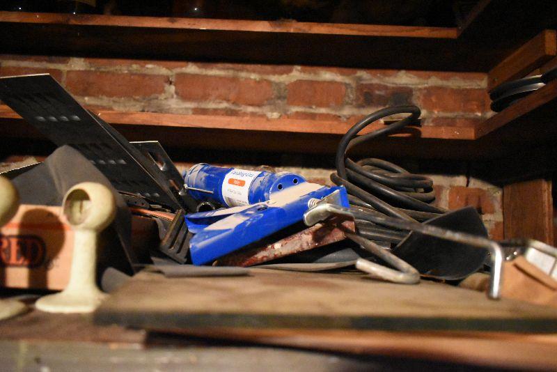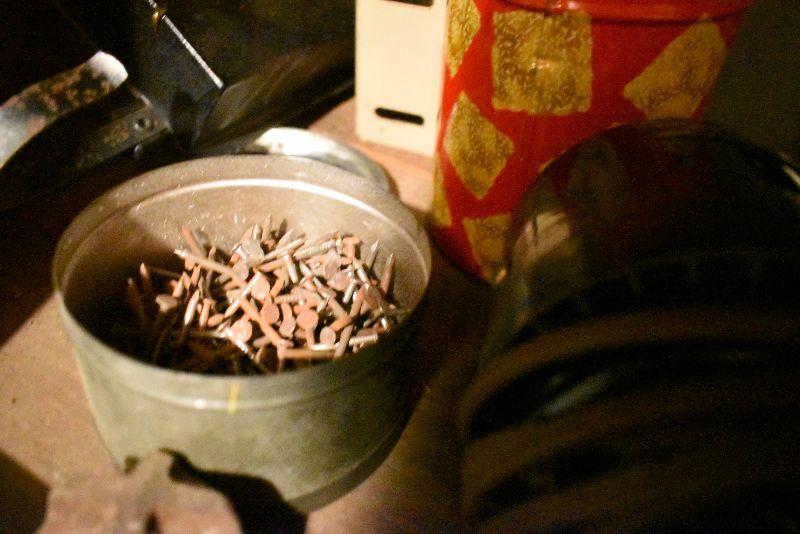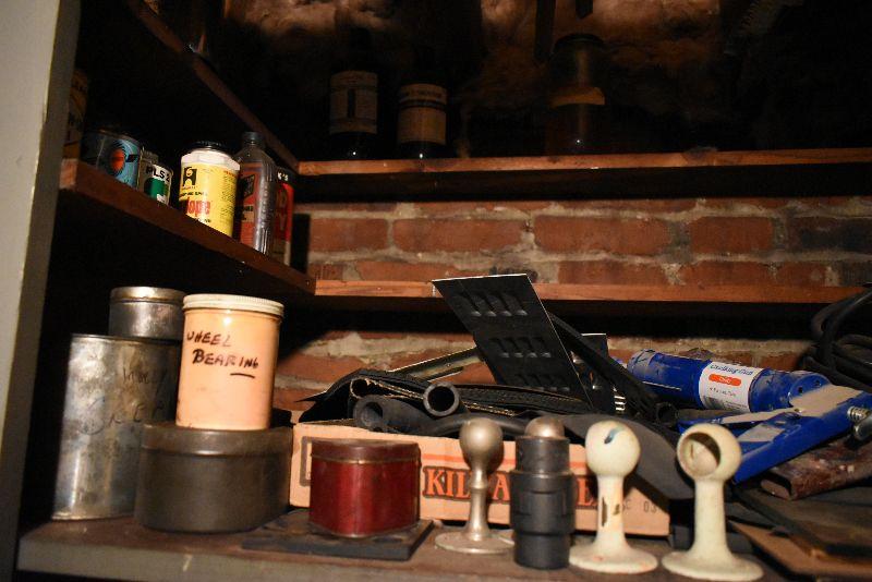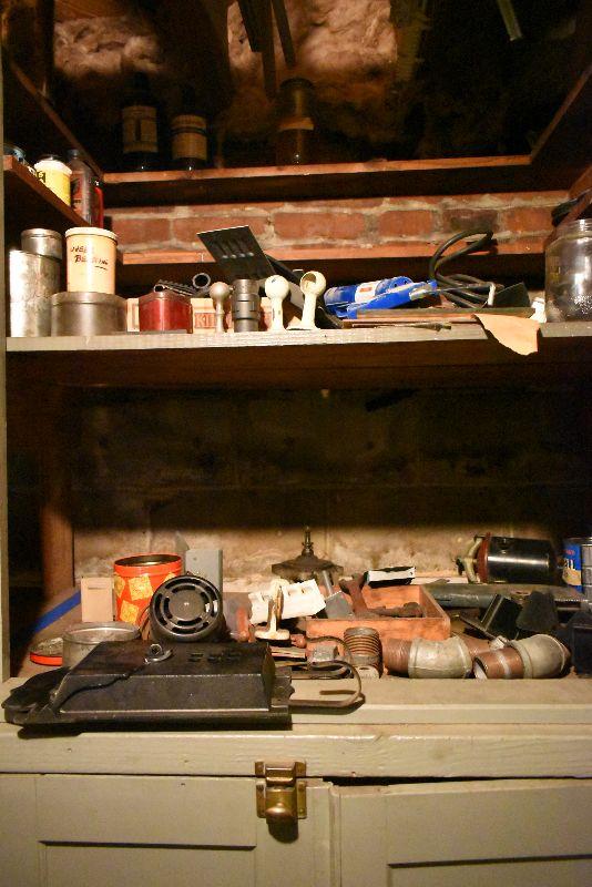 Metal mailbox, antique toothbrush holder, box of wrenches, nails, hinges, and more.
