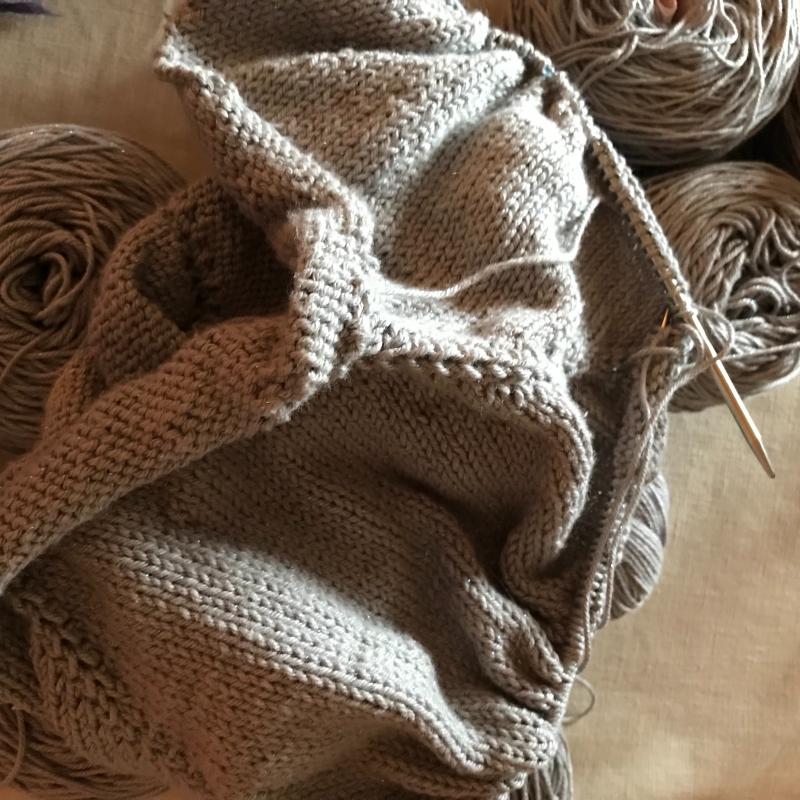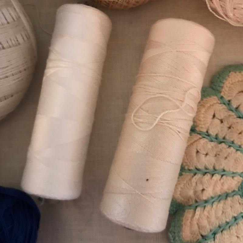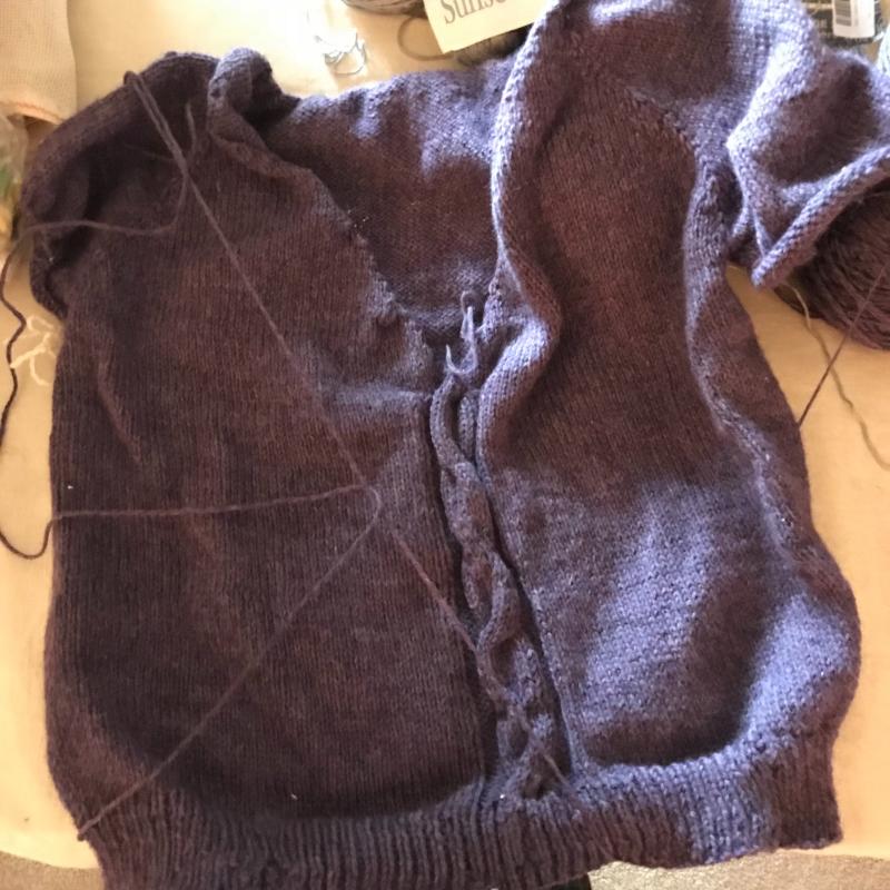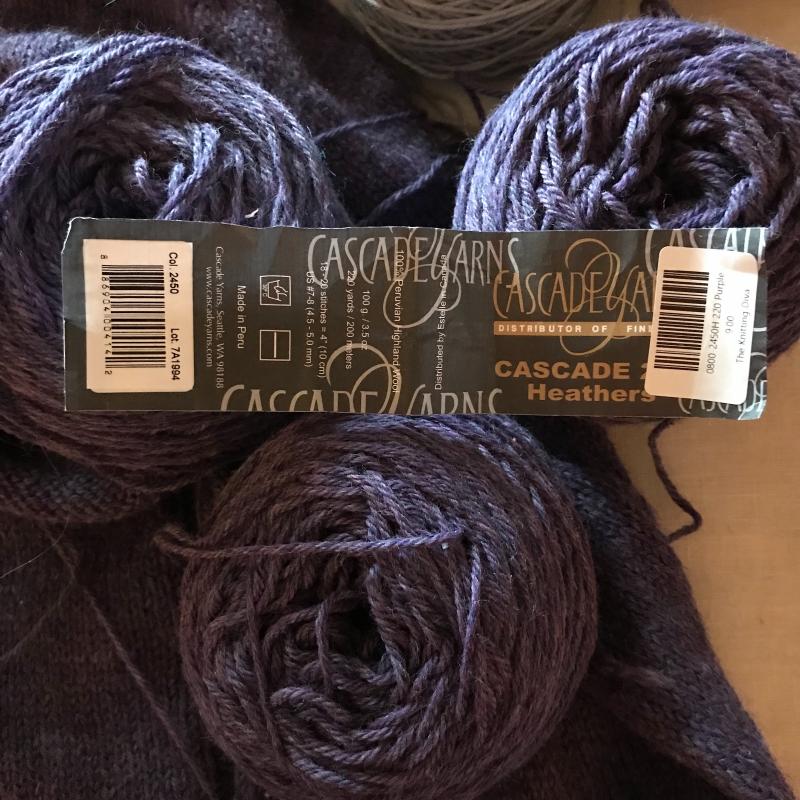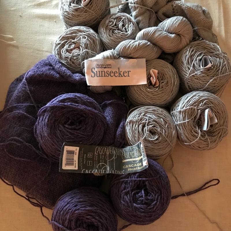 Love to Knit? Appreciate high-quality yarn and a fun challenge? These two gorgeous sweaters are almost complete and in need of a skilled knitter to finish them. Both are made of Cascade yarn. The gray is Sunseeker cotton and acrylic with 5% metallic shimmer, 8 full skeins. The purple is Cascade Heathers, 100% Peruvian highland wool, 3 full skeins. No patterns included. Lot also includes box of cotton lace-weight crochet thread, perfect for making doilies.