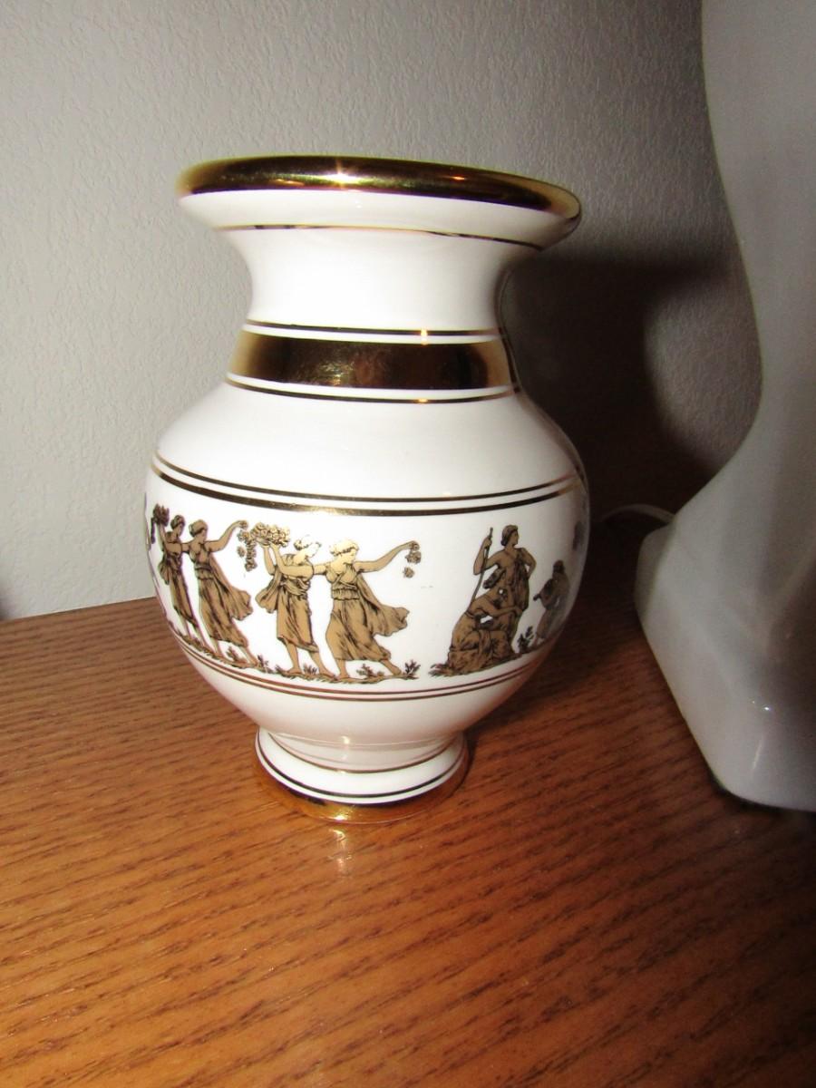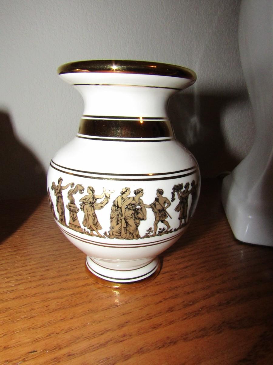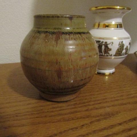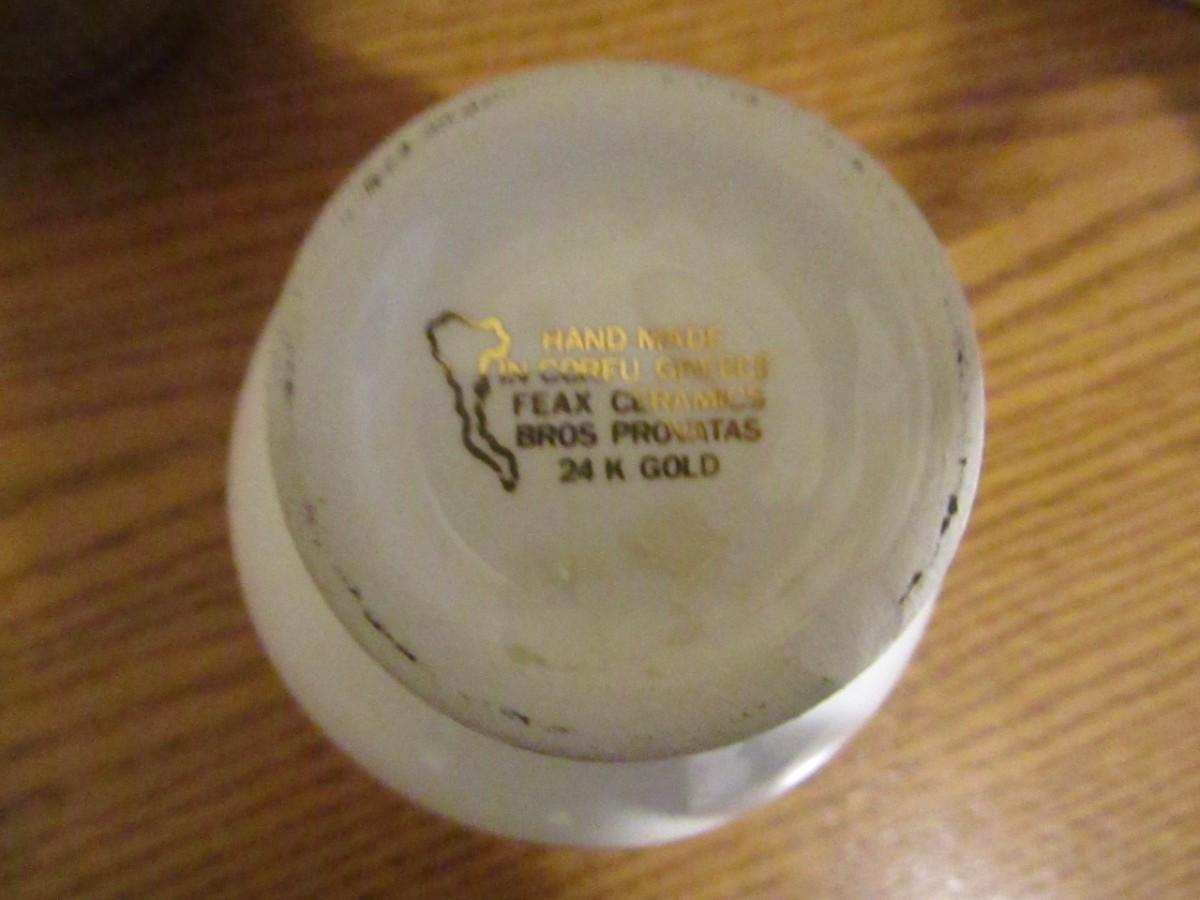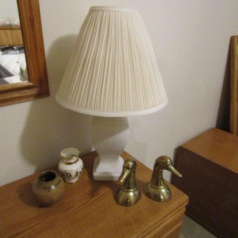 SOLID BRASS DUCK BOOKENDS, CLAY POT, PORCELAIN 24K GOLD POT FROM GREECE AND A CERAMIC BASE TABLE LAMP