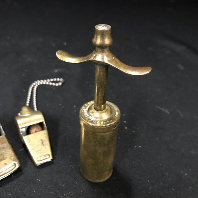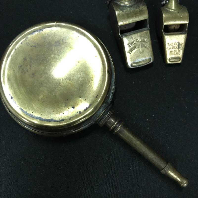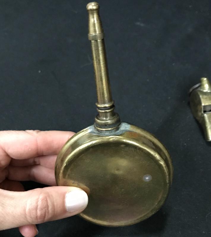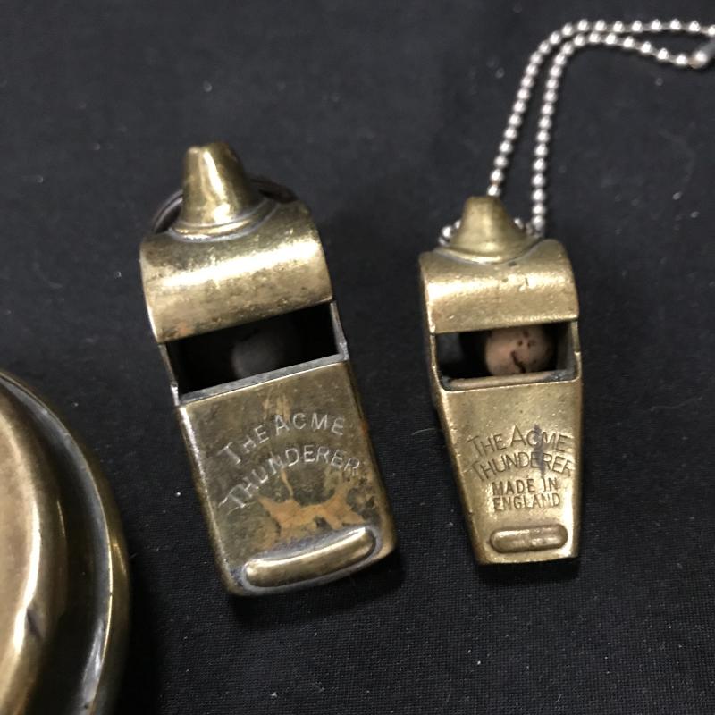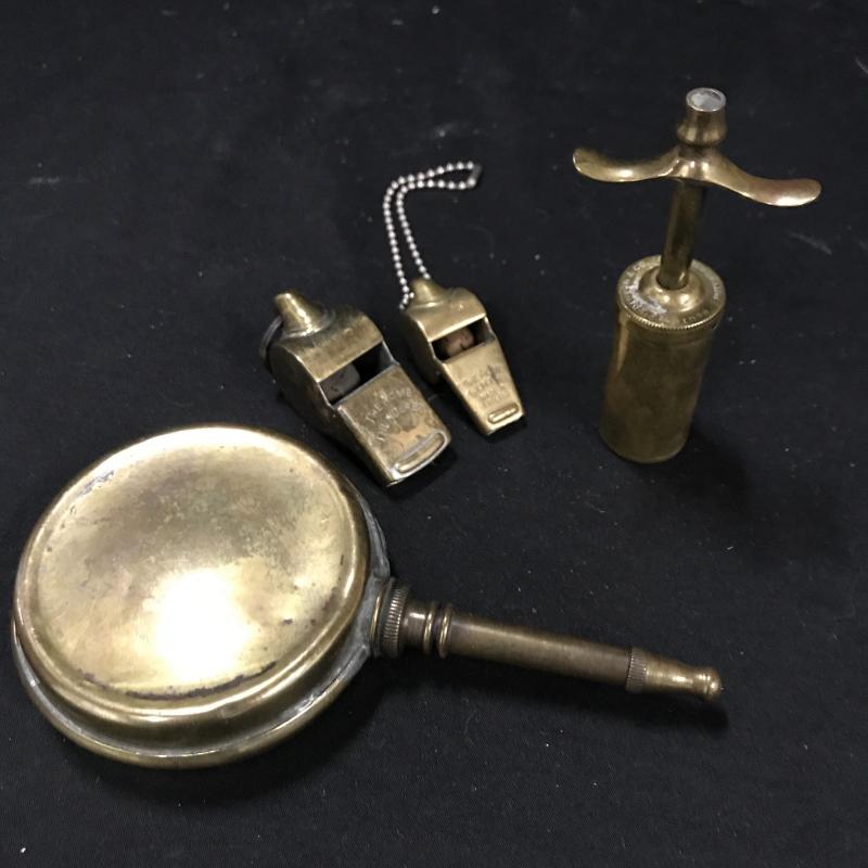 Two brass Acme Thunderer Whistles in two different sizes. Also two oil pumps. Largest oil piece is 6”long. Shipping or local pick up in Asheville