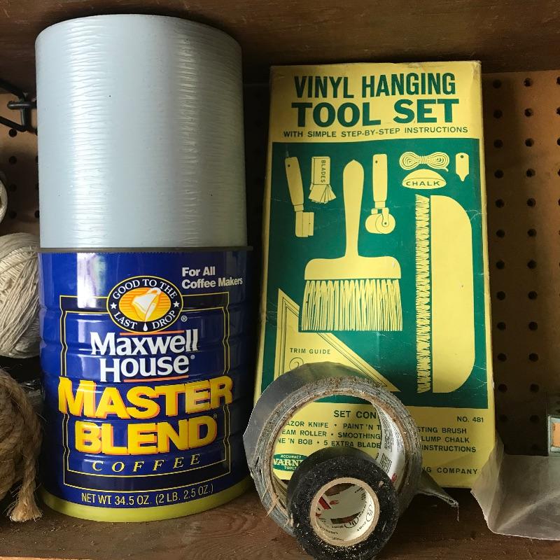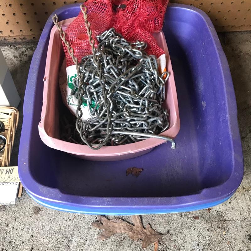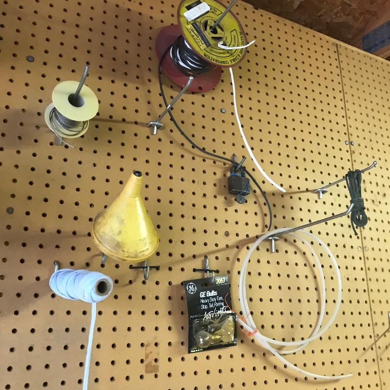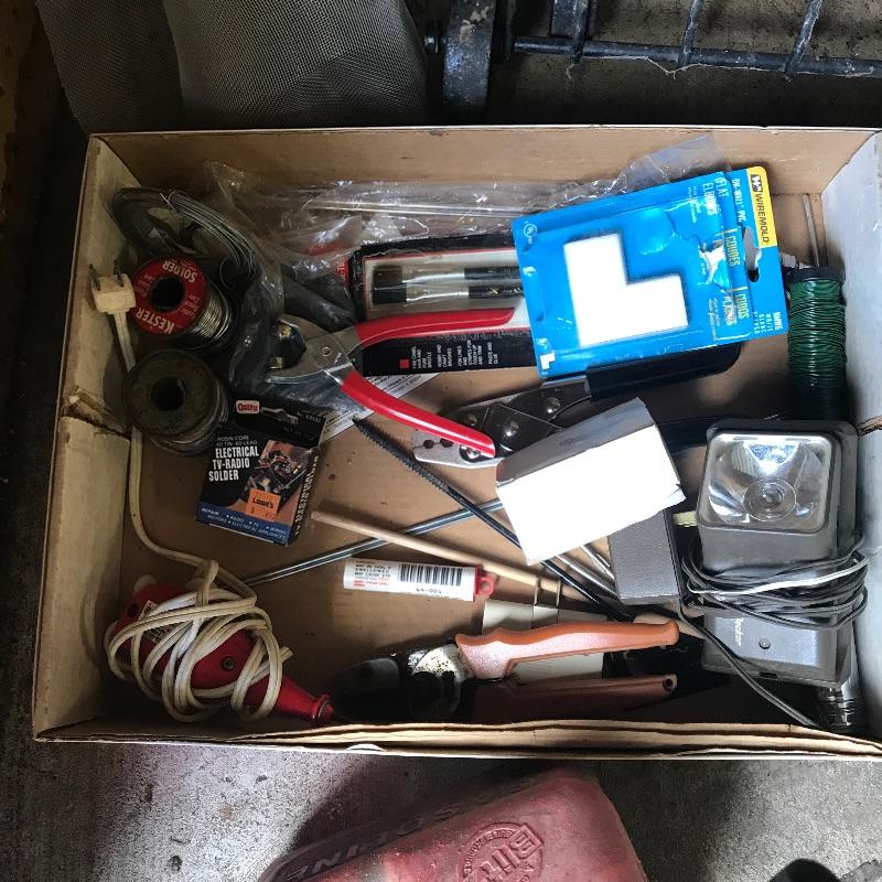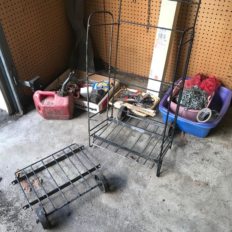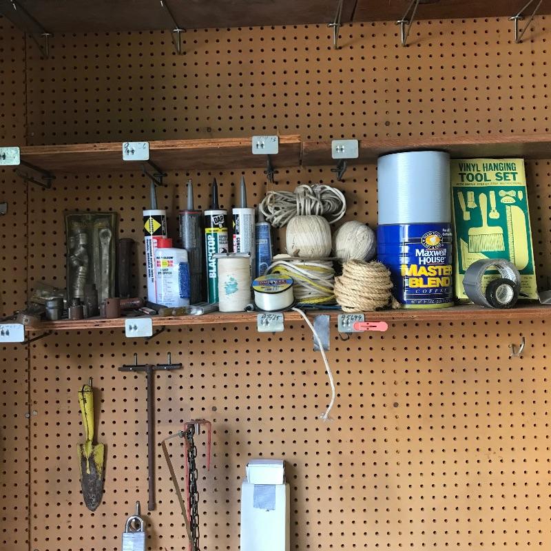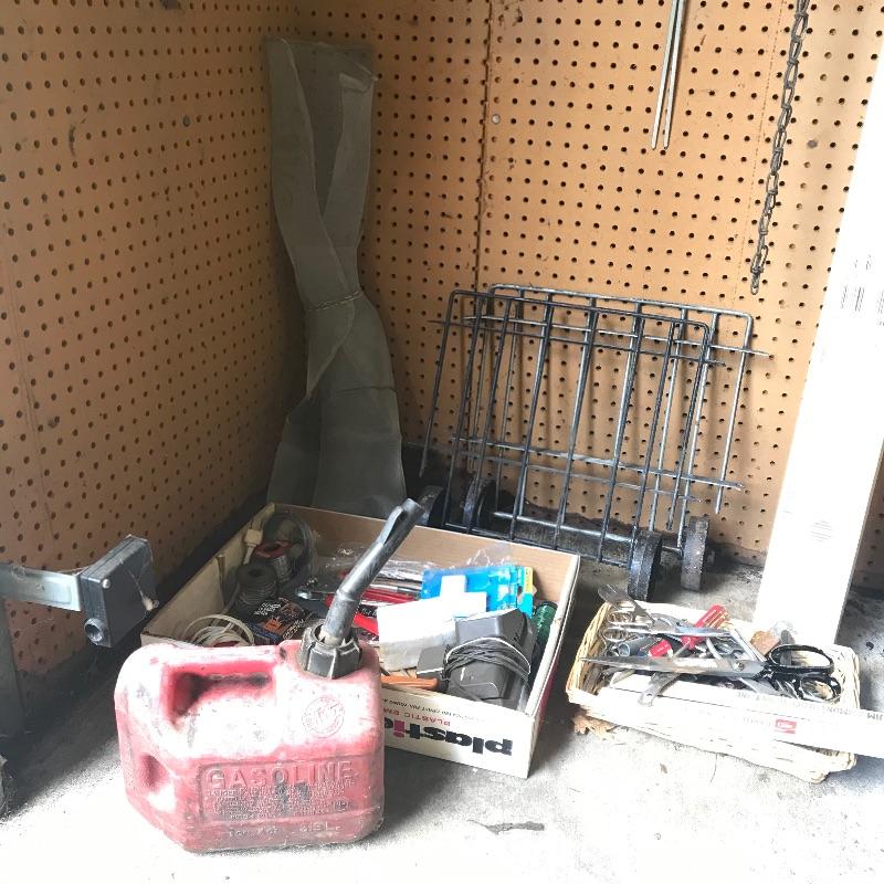 Wow! So much here to help maintain your home or perfect for a person who works in maintenance. This lot offers hand tools like screwdrivers and sockets, scissors and a pocket leveler. Spare screen, gas can, gray vinyl with a vinyl hanging tool set. Wire, twine, rope and chains too! See photos for lot inventory, pegboard and hooks not included, some can be found in lot 130. All chemical bottles are mostly full, but we cannot verify contents. Wire cart is approximately 17” x 15” x 32” and has a spare set of wheels. Local pick up only.
