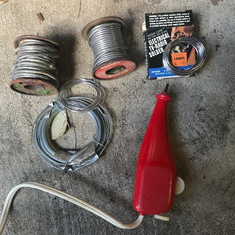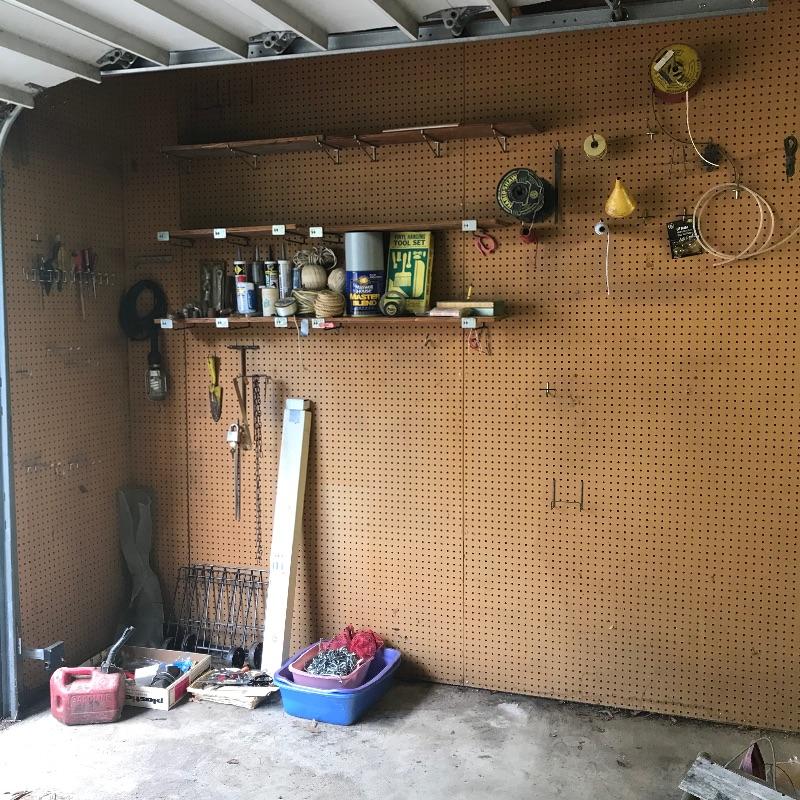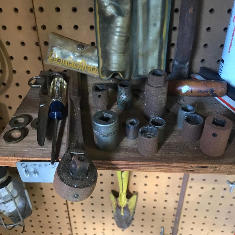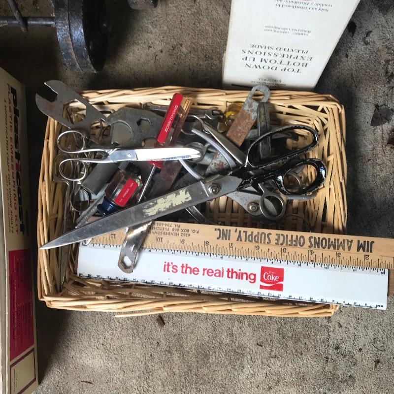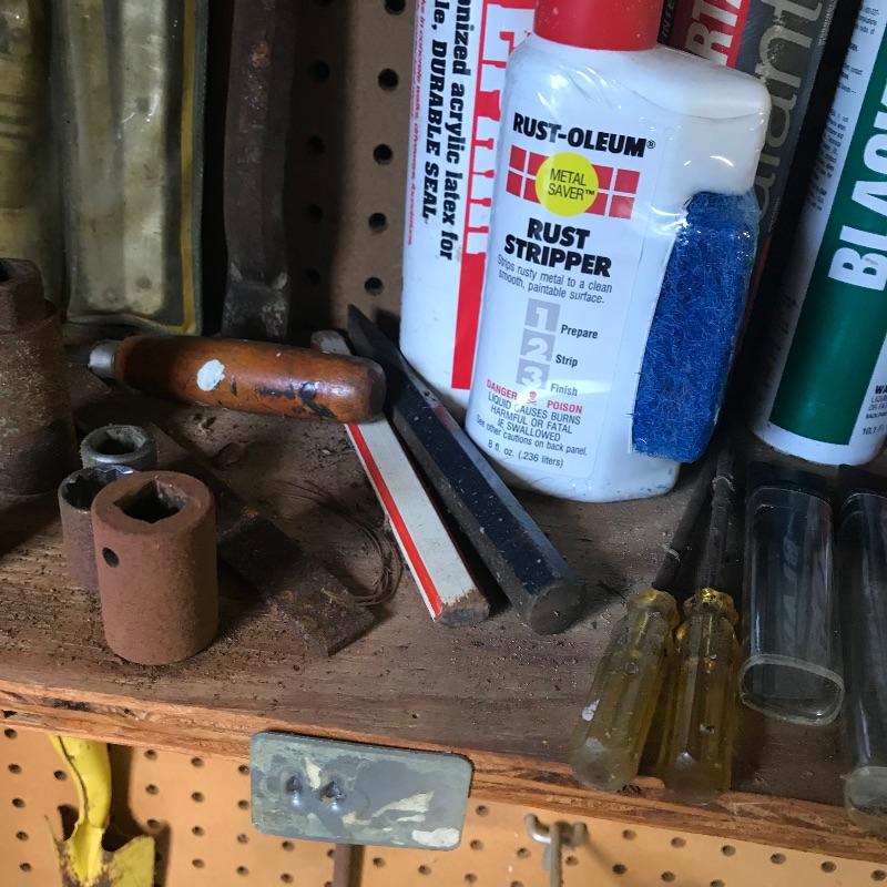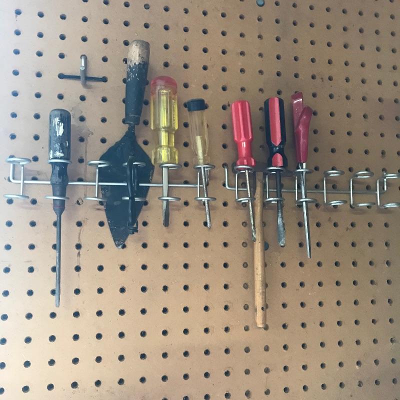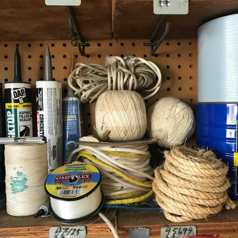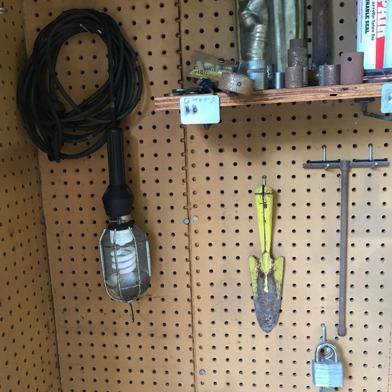 Wow! So much here to help maintain your home or perfect for a person who works in maintenance. This lot offers hand tools like screwdrivers and sockets, scissors and a pocket leveler. Spare screen, gas can, gray vinyl with a vinyl hanging tool set. Wire, twine, rope and chains too! See photos for lot inventory, pegboard and hooks not included, some can be found in lot 130. All chemical bottles are mostly full, but we cannot verify contents. Wire cart is approximately 17” x 15” x 32” and has a spare set of wheels. Local pick up only.