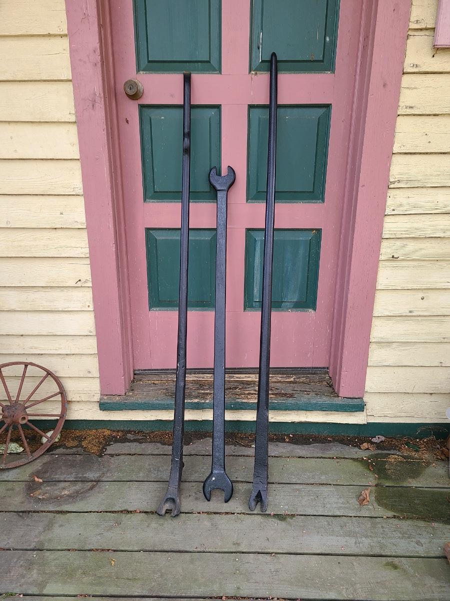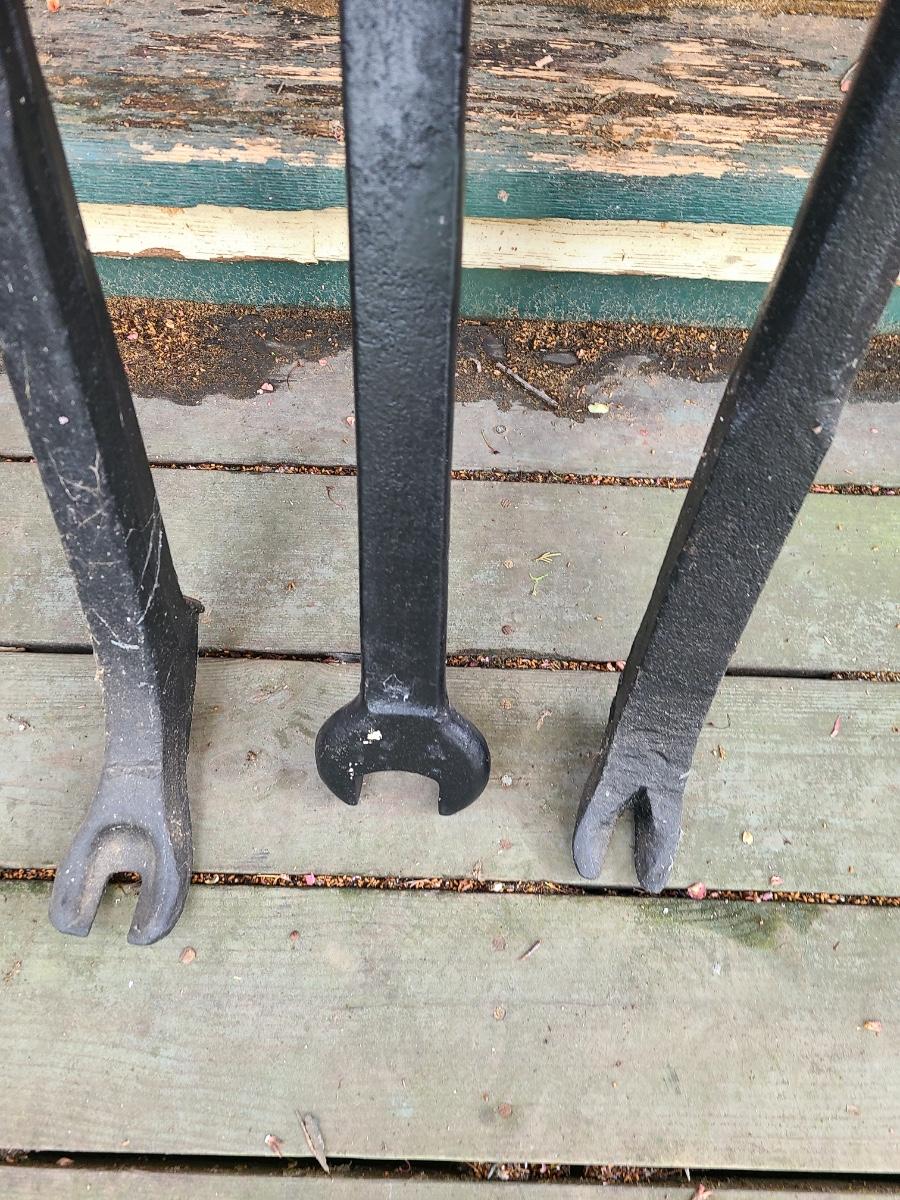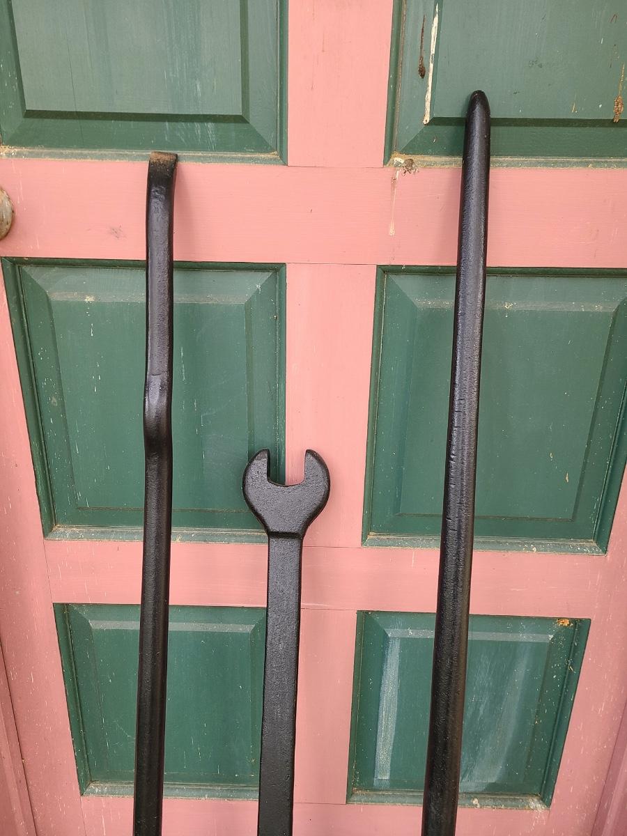This lot is for the three large black metal HEAVY railroad tools. Not sure of the age of these. The metal wheel is not included. Please see all pictures as they are the best representation of the items. The pictures show condition, measurements if taken, and what is included in the lot. Due to the large amount that we photograph and the time frame, we are not always able to take measurements. All items unless noted, are pre-owned and have been used. If you purchased furniture, you must bring help. We do not allow one person to carry large furniture out on their own. Bring help, tools and a truck for the safety of our client’s homes, and your personal safety. Any damages that result to the property including walls, and floors due to moving of the furniture will be charged to the buyer. Company policy. Thank you.
