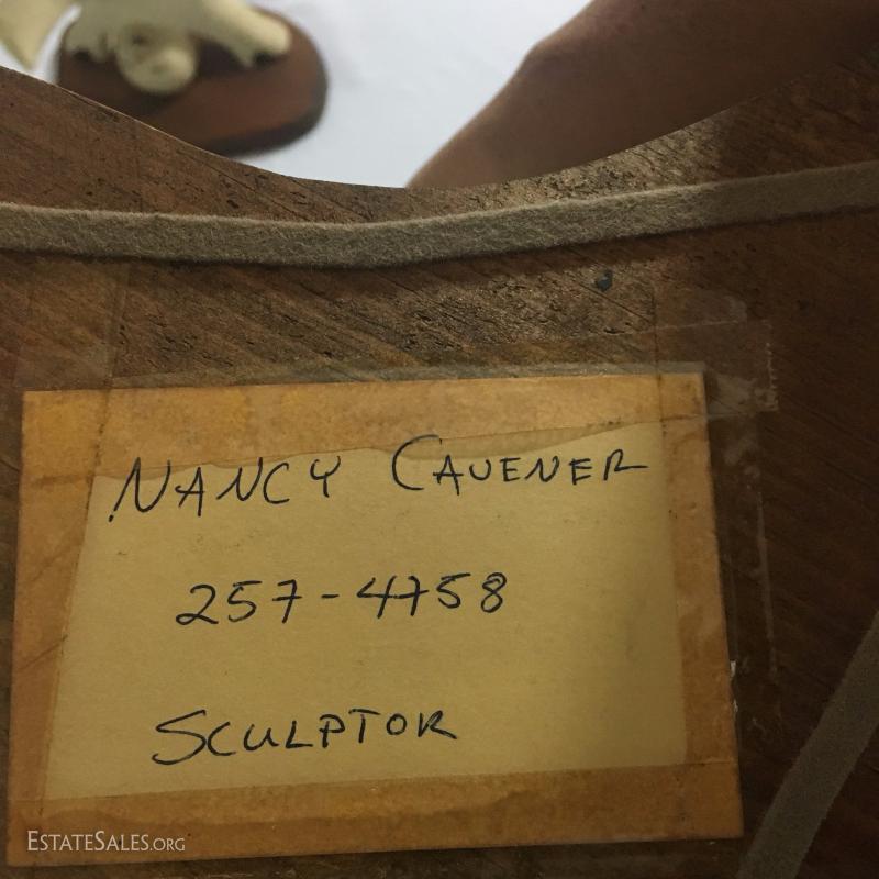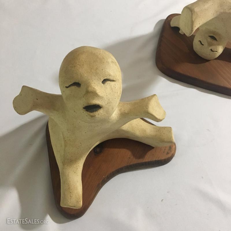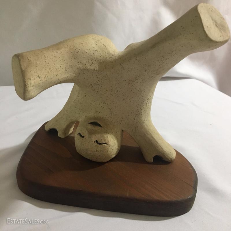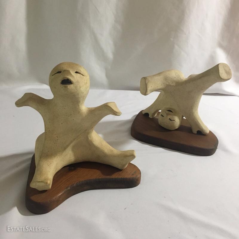 Pair of playful ceramic sculptures attached to wood base. Handwritten note attached to bottom says sculptor was Nancy Cavener. Tallest is 9" tall