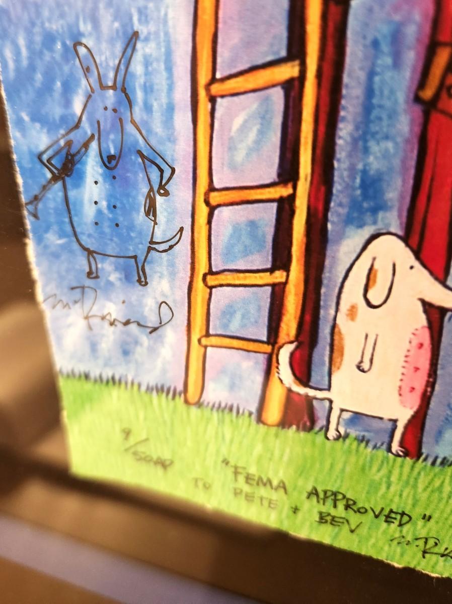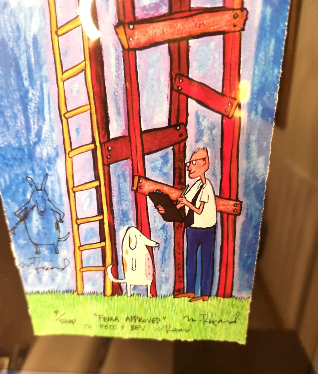 "Fema Approved" is the name of this print, and anyone who has lived in New Orleans any length of time can totally identify with this. Print by M. Rinard - Hand signed/numbered 9/50 - Artist's Proof. Personalized to "Pete and Bev", with a cute little extra doodle in the margin of a dog with a clarinet. 31" x 18" - well framed. You'll love it!