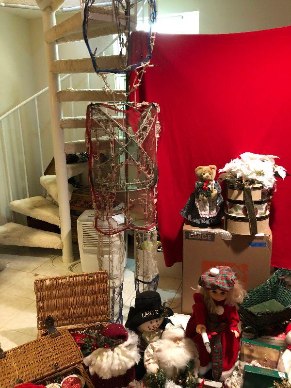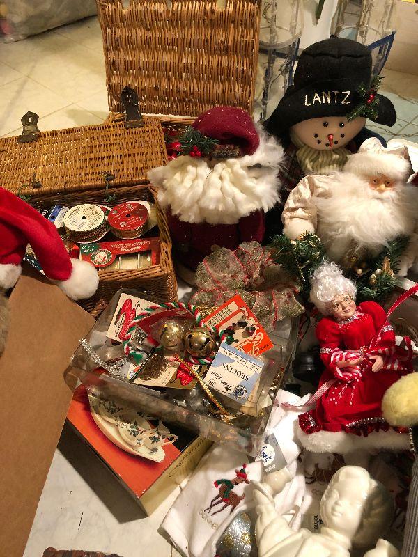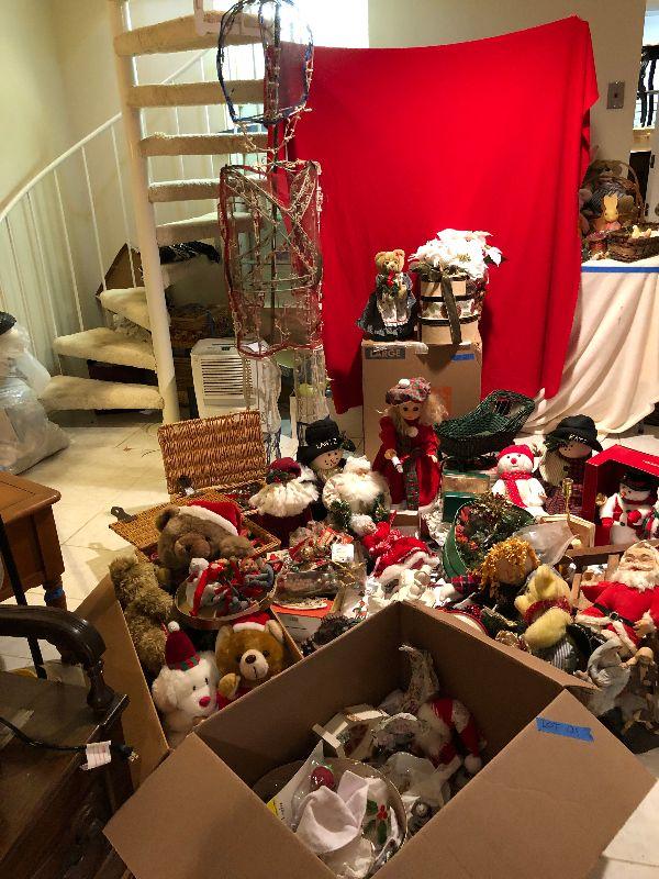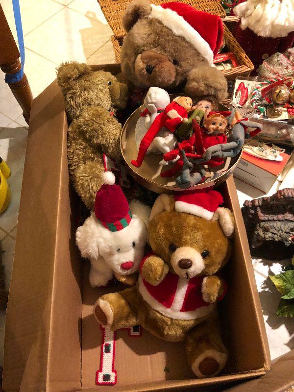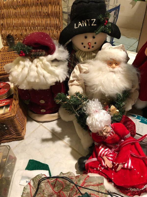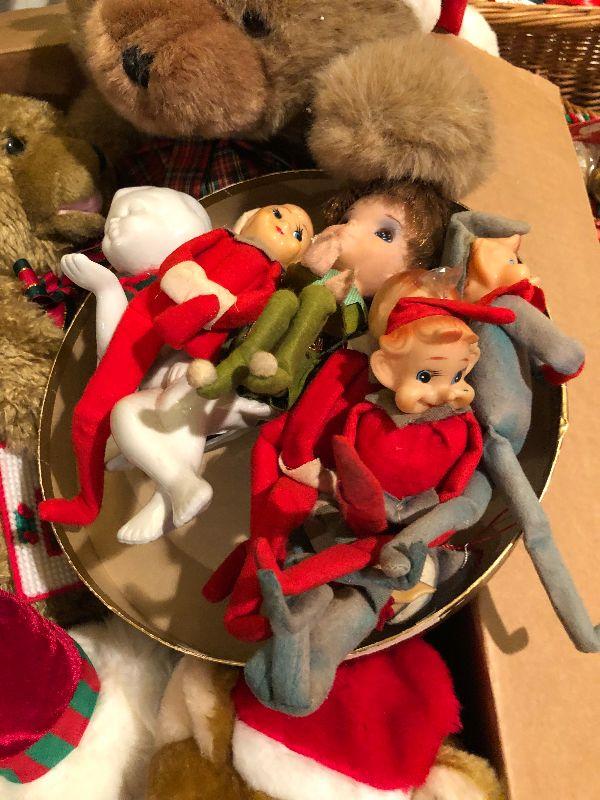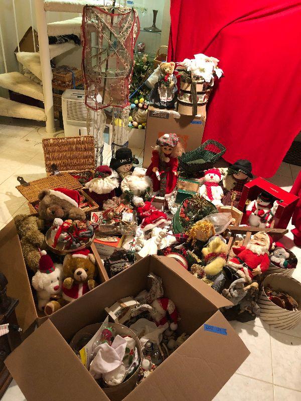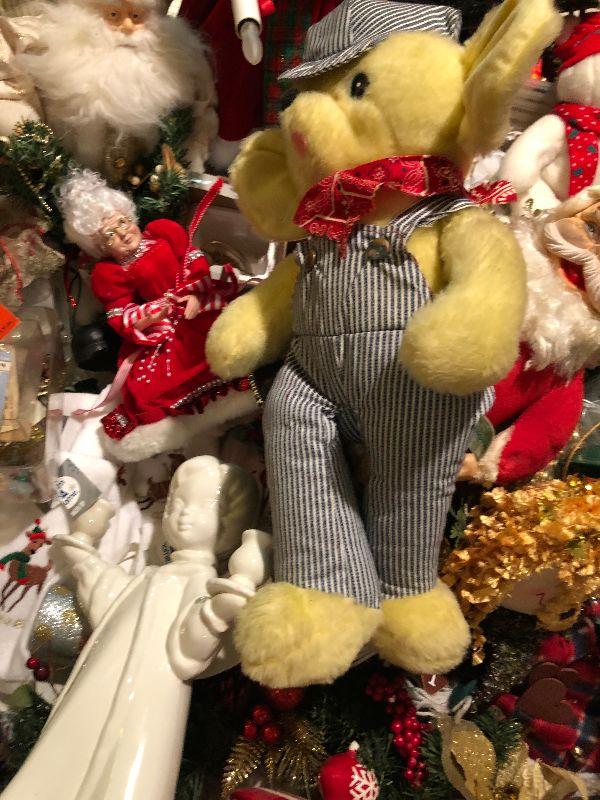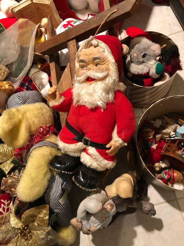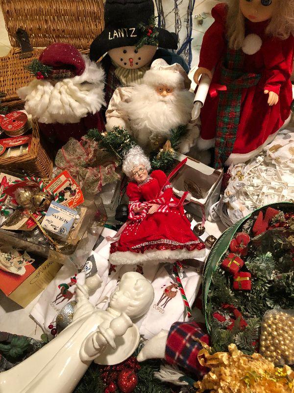 Vintage and new - Bears, Santa, Mrs Claus, elves, 6' lighted figure, cookie jar, sled, tea set and other miscellaneous items.