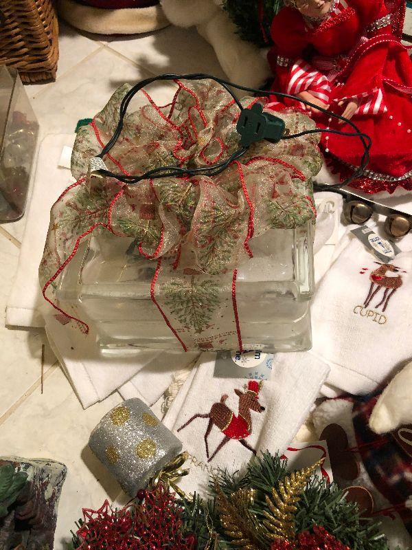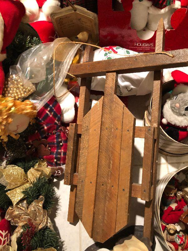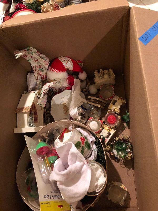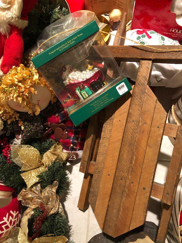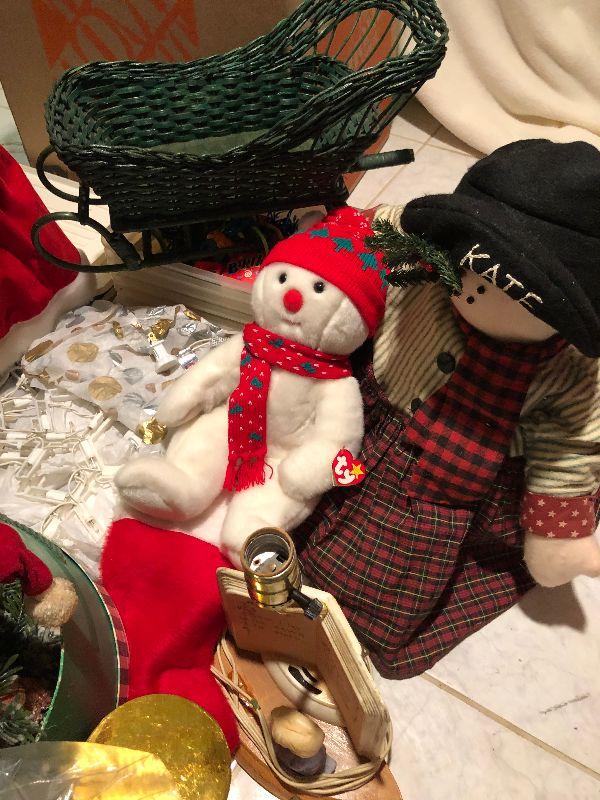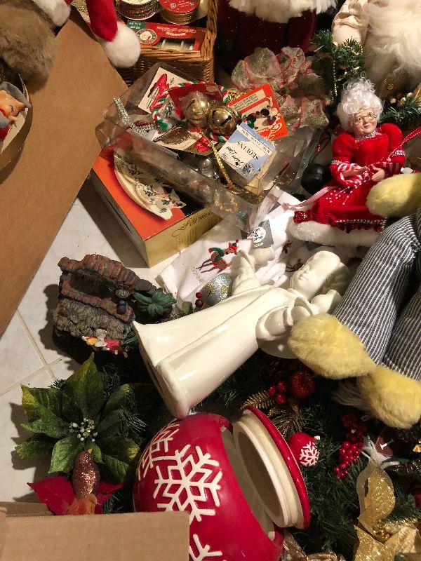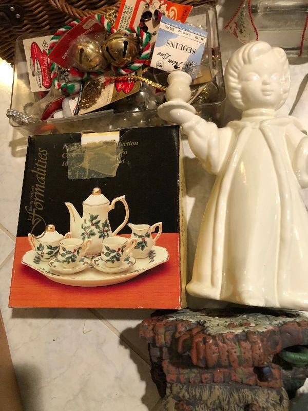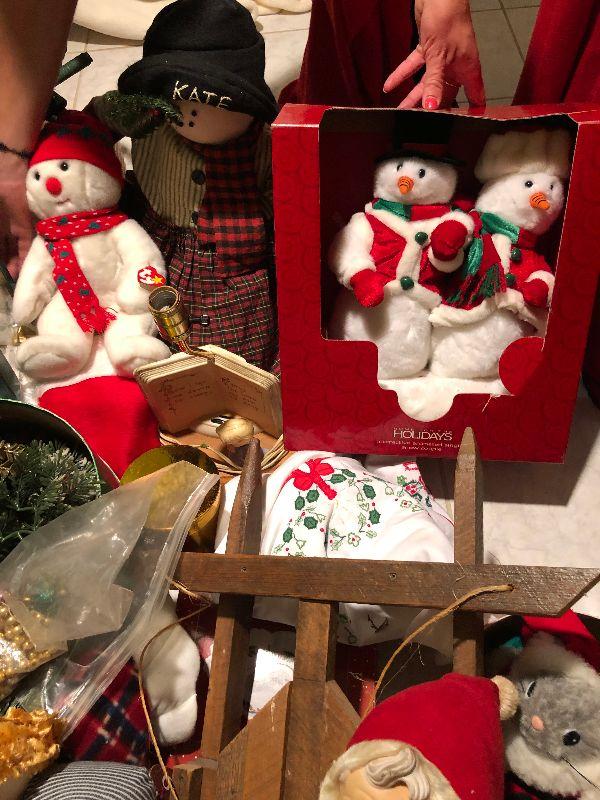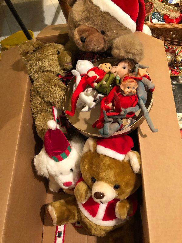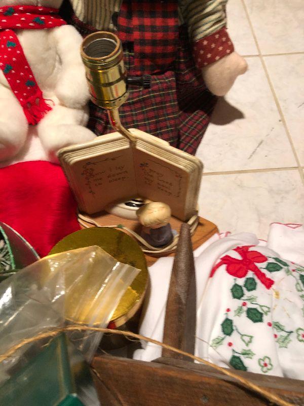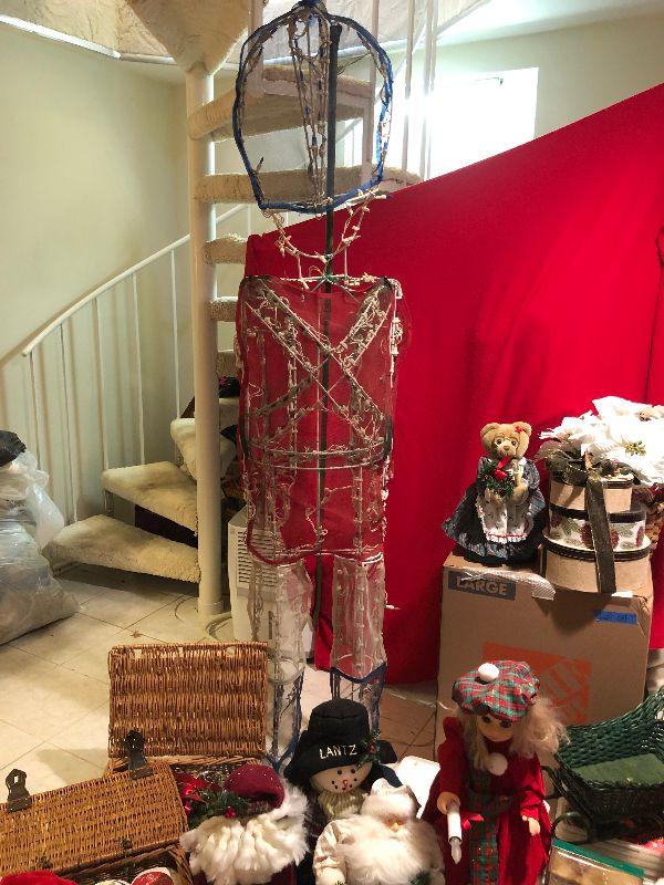 Vintage and new - Bears, Santa, Mrs Claus, elves, 6' lighted figure, cookie jar, sled, tea set and other miscellaneous items.