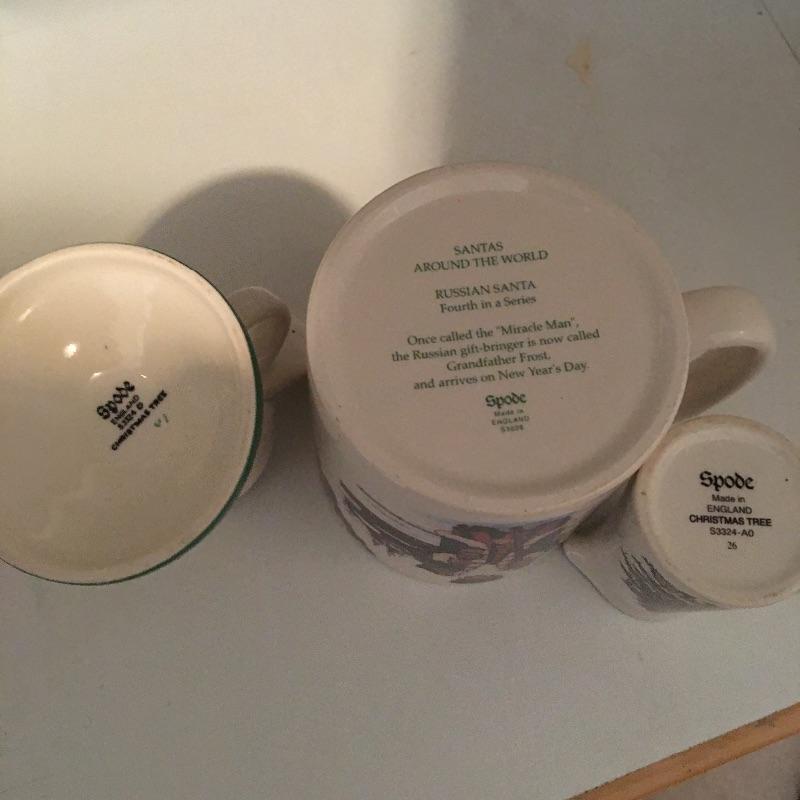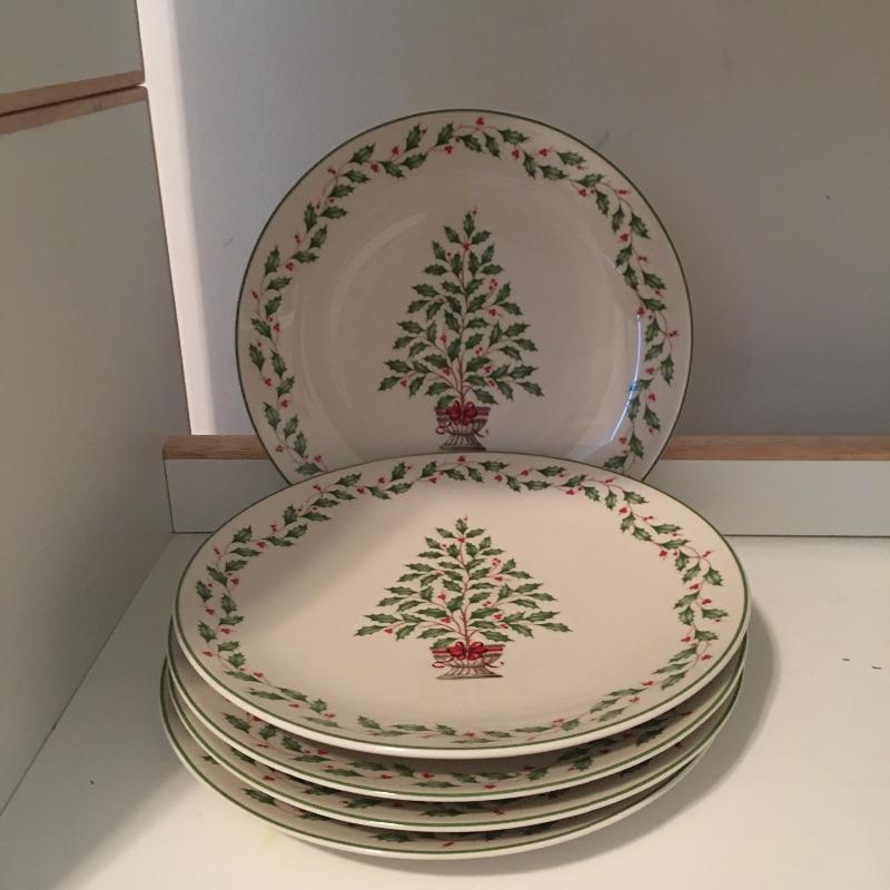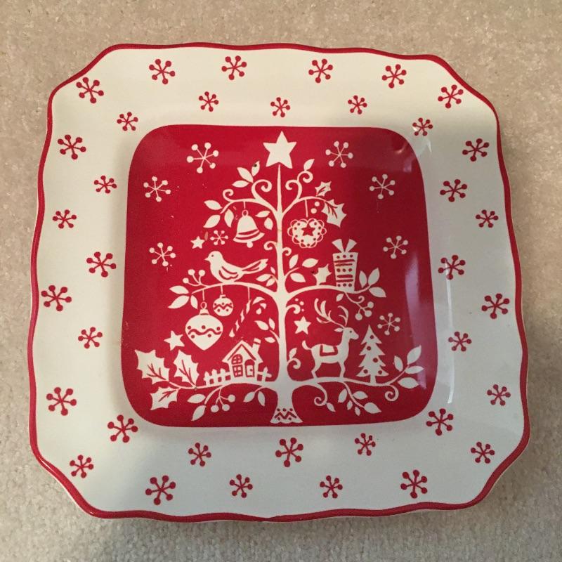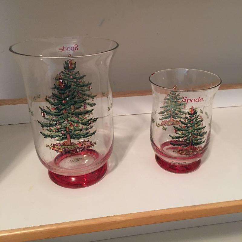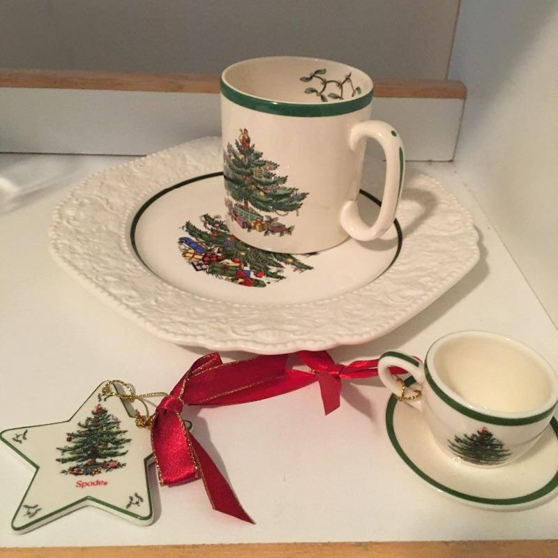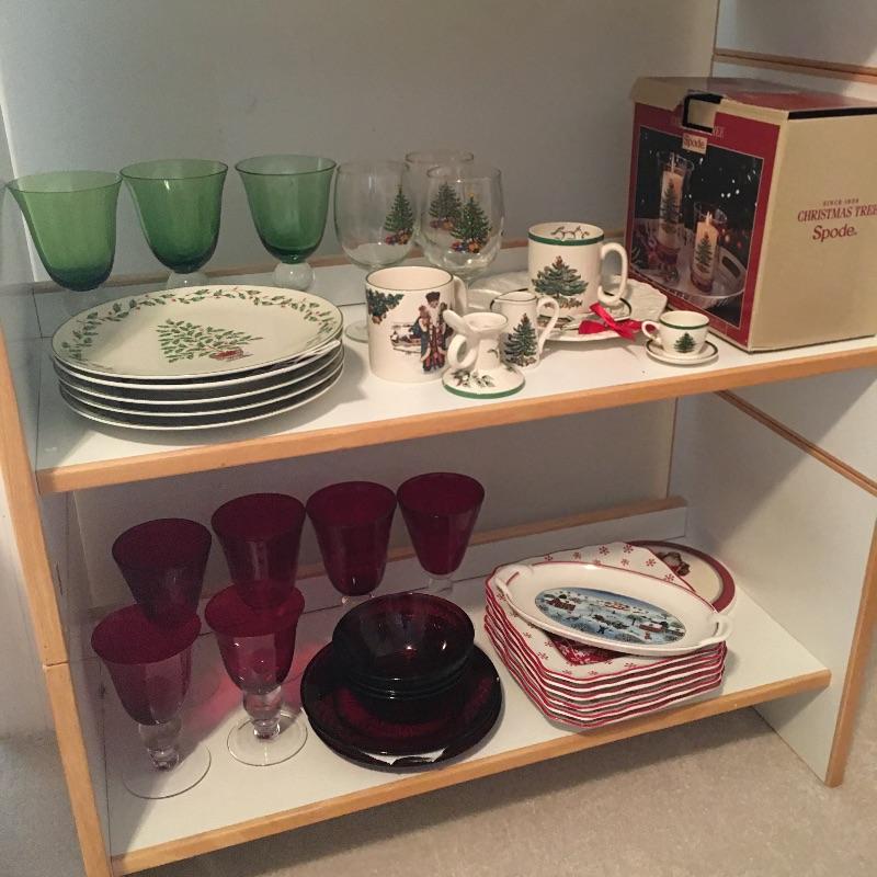 Christmas Dishware includes five Christmas tree plates that measure 9”D, Spode coffee cups, candle holders and decorations, twelve glasses, six red and white plates, small Villeroy & Boch platter, three red bowls and plates and more.