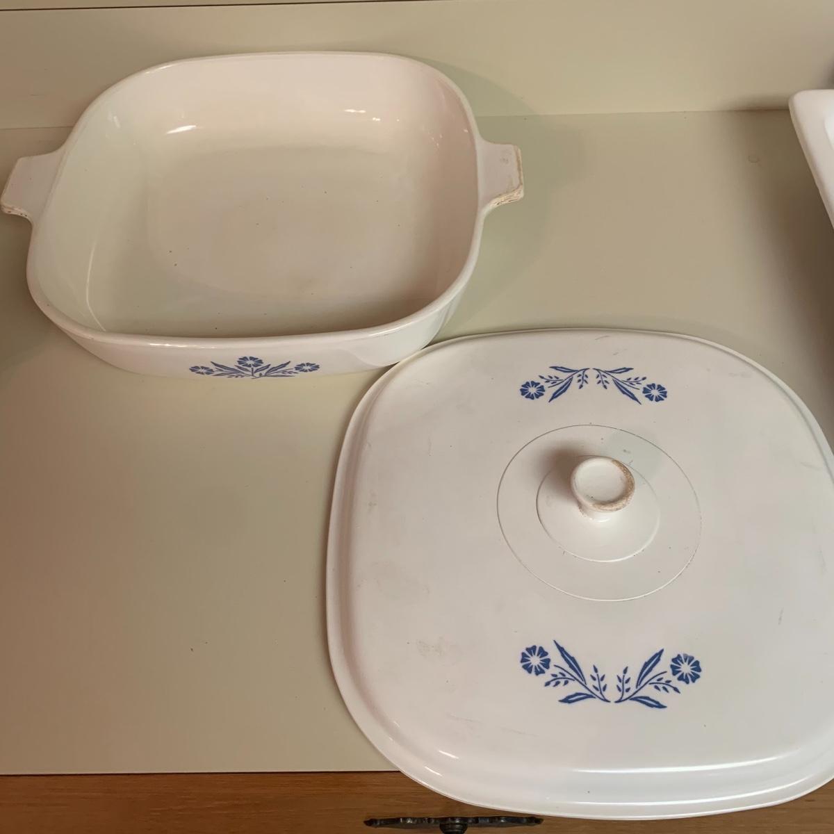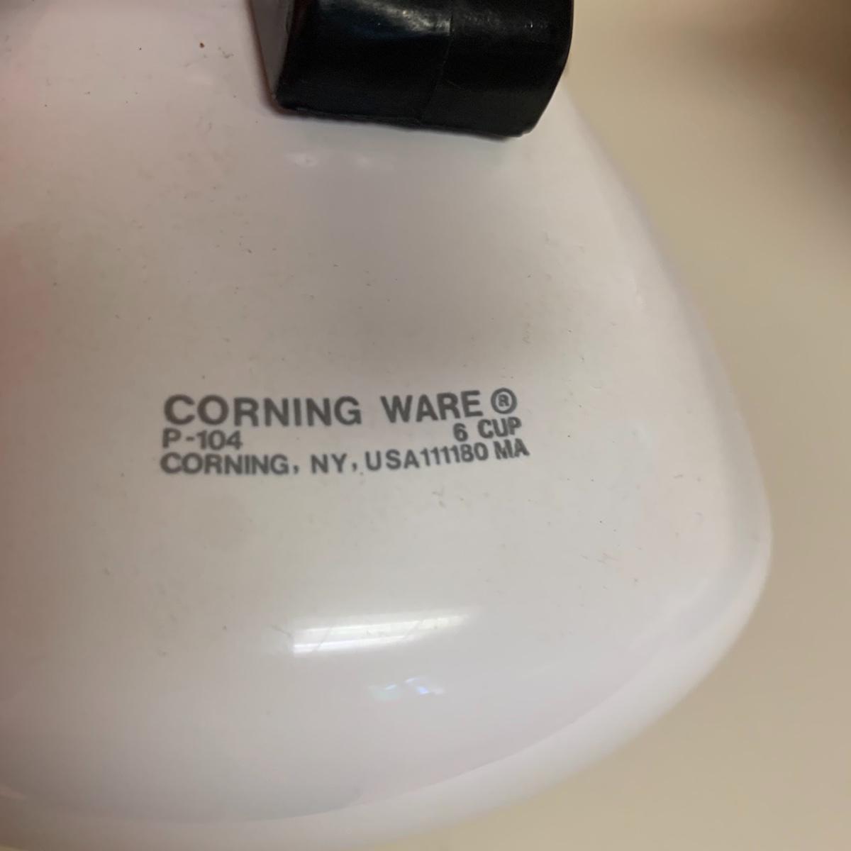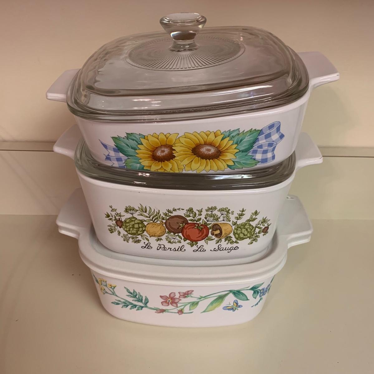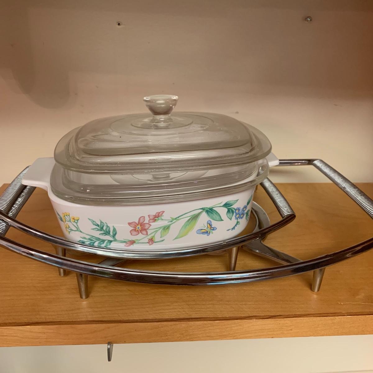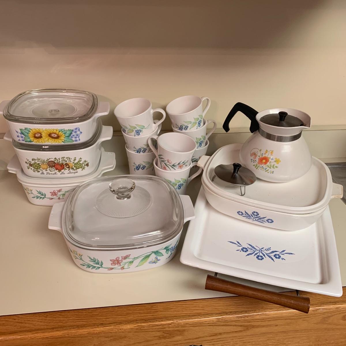 This lot includes 3 miscellaneous casserole dishes with lids, a set of 3 casserole dishes with lids, a set of 6 teacups, a set of 2 teacups, a coffee pot with two lids, casserole dish holders, and more. The coffee pot has staining at the bottom. Everything in this lot is Corning brand. The largest casserole dish measures about 12in x 10in. The serving plate measures about 16in x 10in without the holding rack.