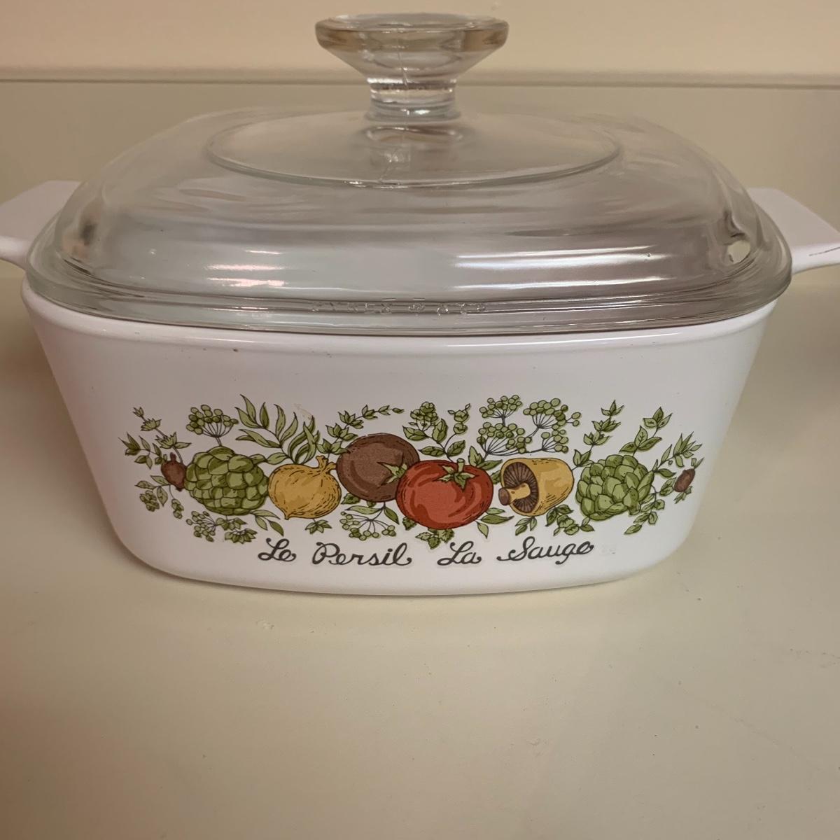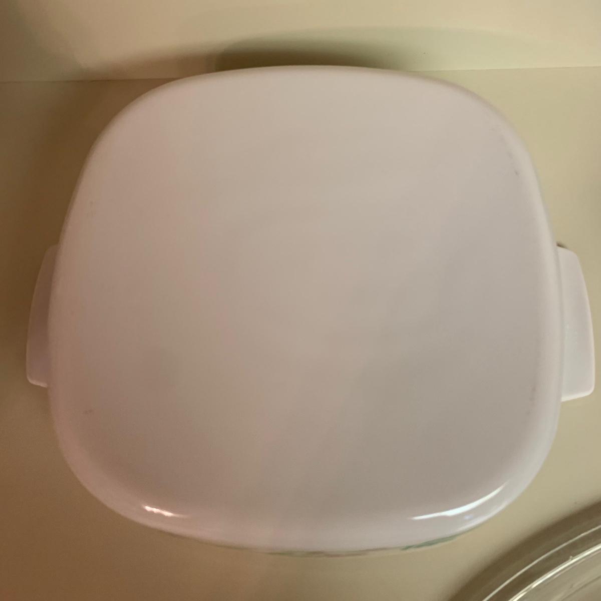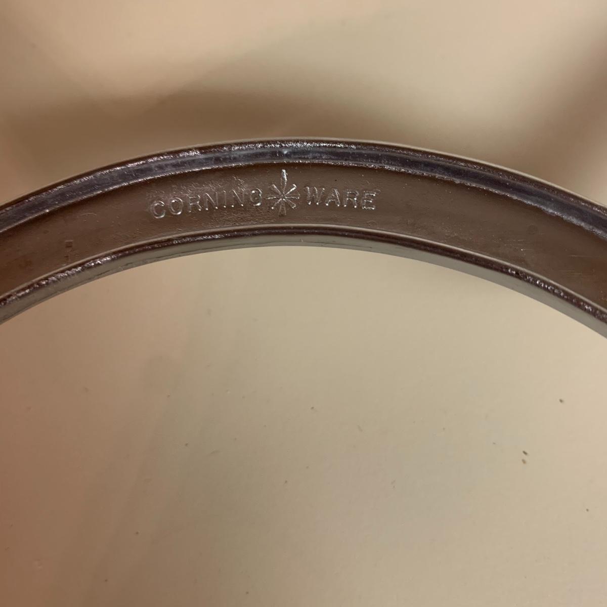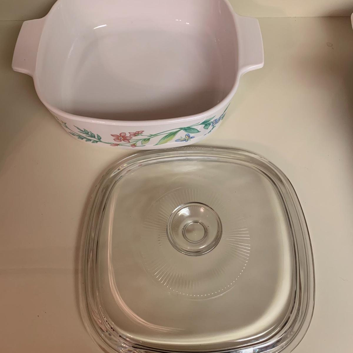 This lot includes 3 miscellaneous casserole dishes with lids, a set of 3 casserole dishes with lids, a set of 6 teacups, a set of 2 teacups, a coffee pot with two lids, casserole dish holders, and more. The coffee pot has staining at the bottom. Everything in this lot is Corning brand. The largest casserole dish measures about 12in x 10in. The serving plate measures about 16in x 10in without the holding rack.