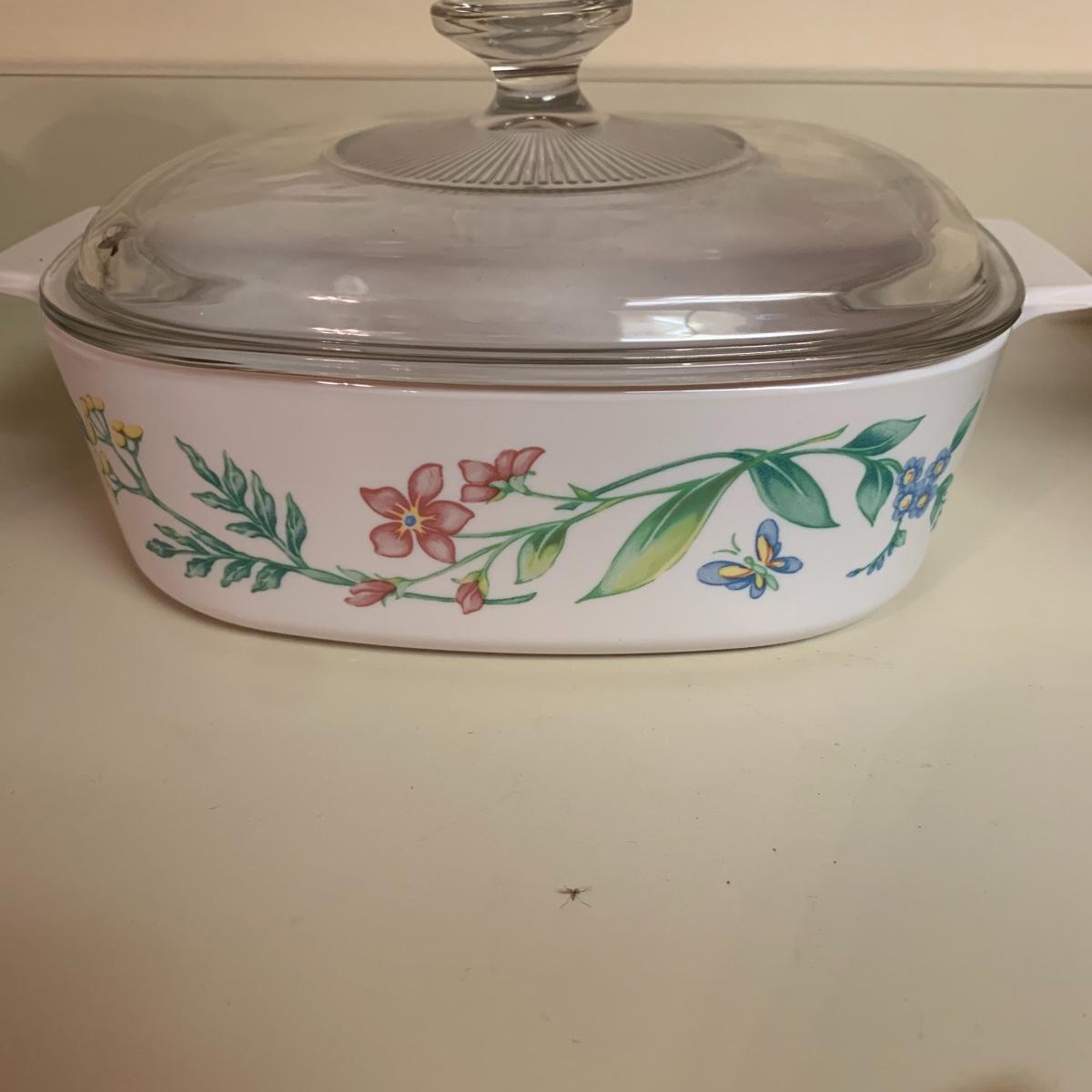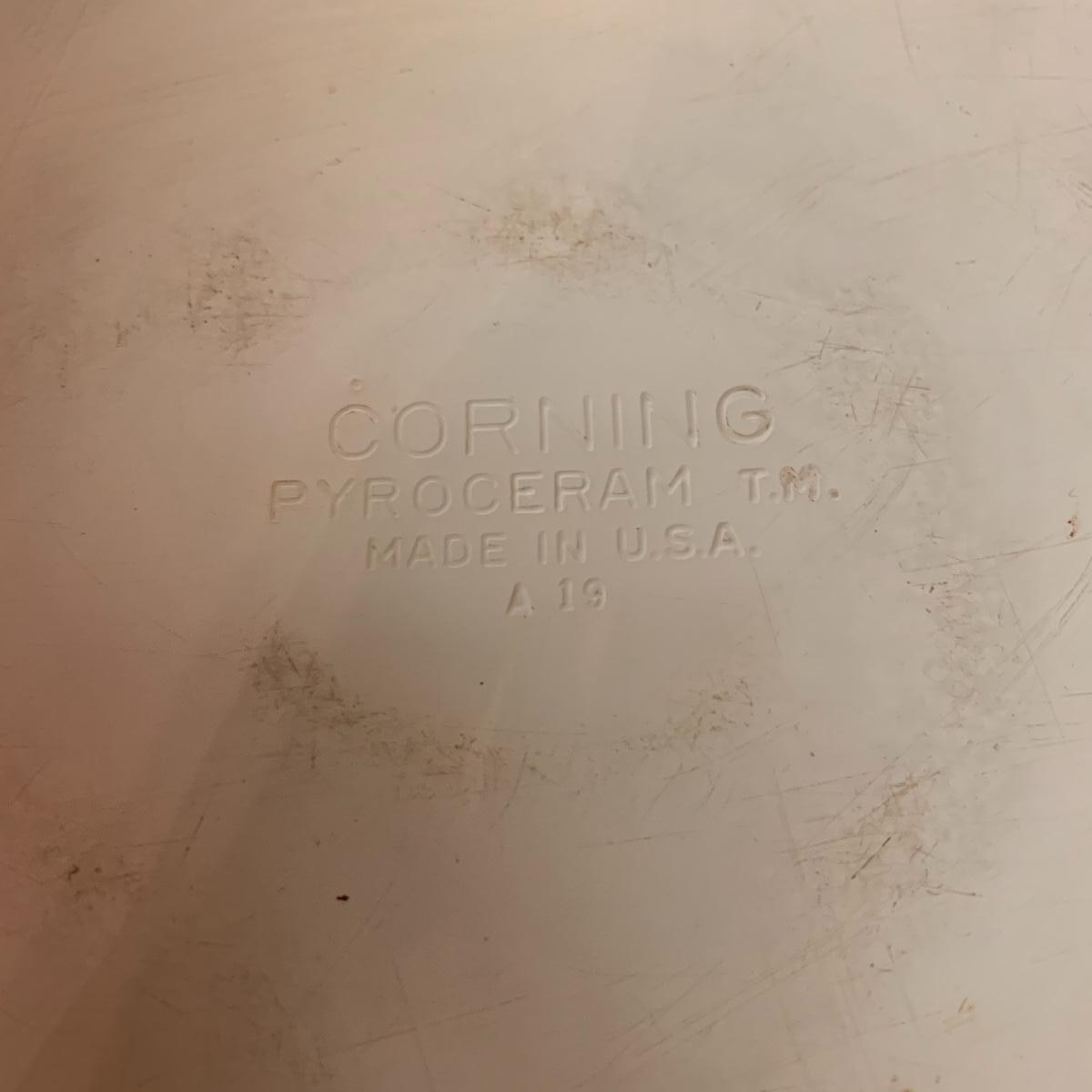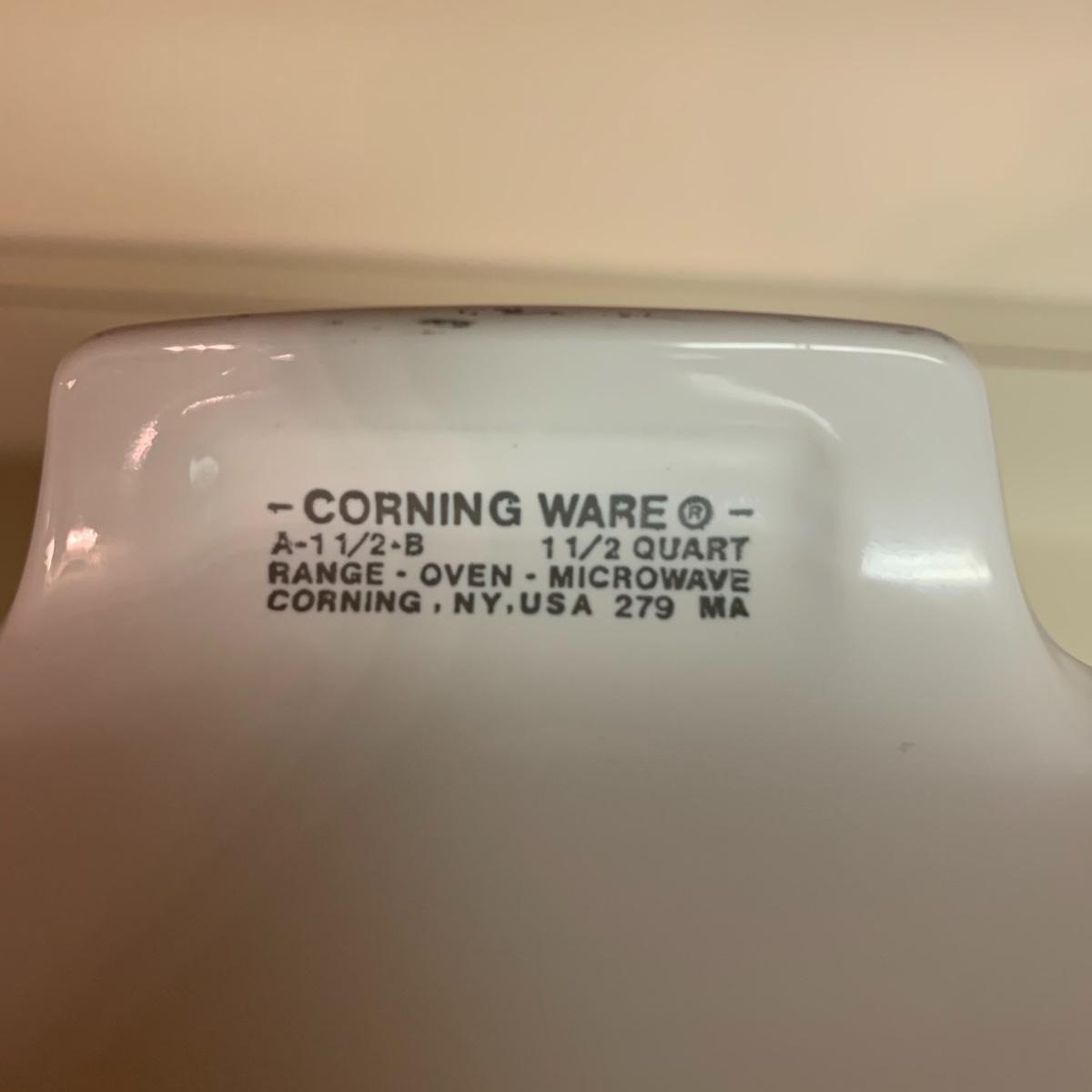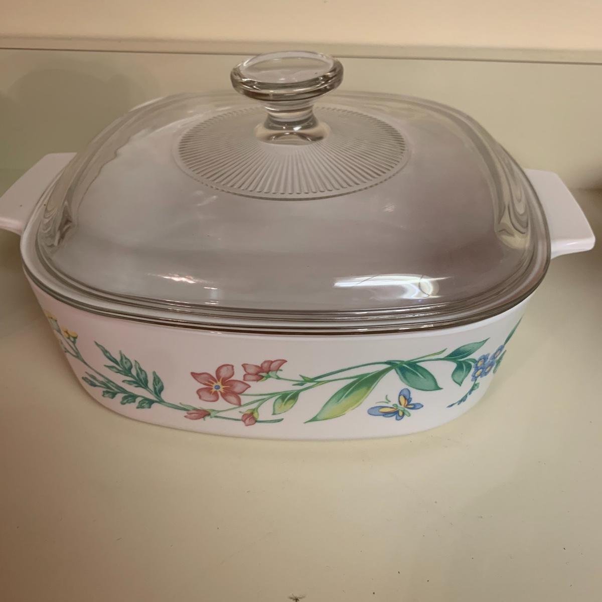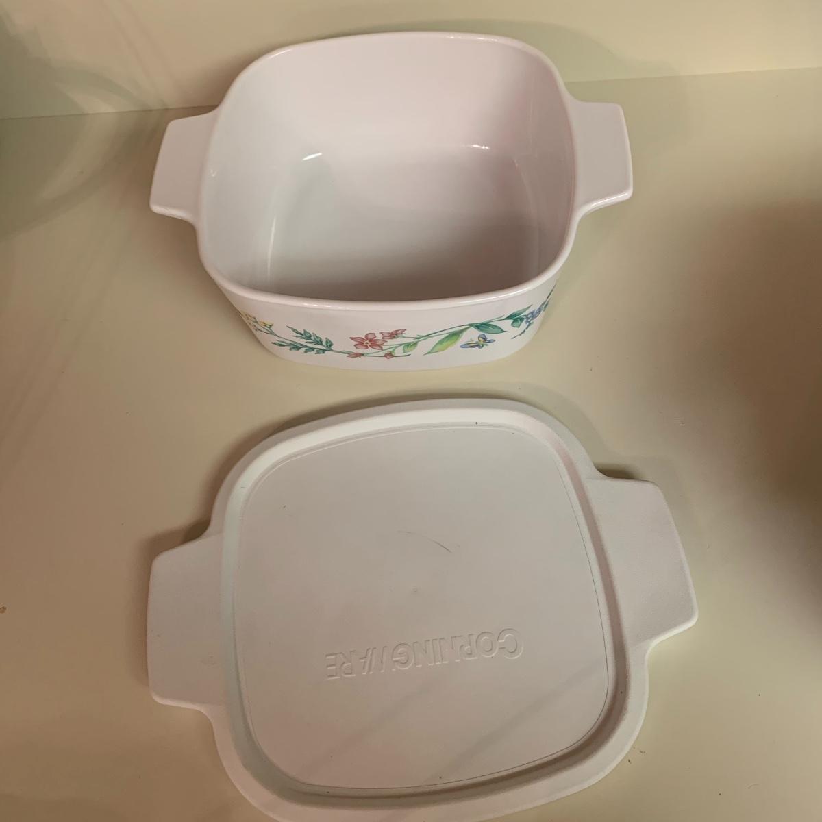 This lot includes 3 miscellaneous casserole dishes with lids, a set of 3 casserole dishes with lids, a set of 6 teacups, a set of 2 teacups, a coffee pot with two lids, casserole dish holders, and more. The coffee pot has staining at the bottom. Everything in this lot is Corning brand. The largest casserole dish measures about 12in x 10in. The serving plate measures about 16in x 10in without the holding rack.