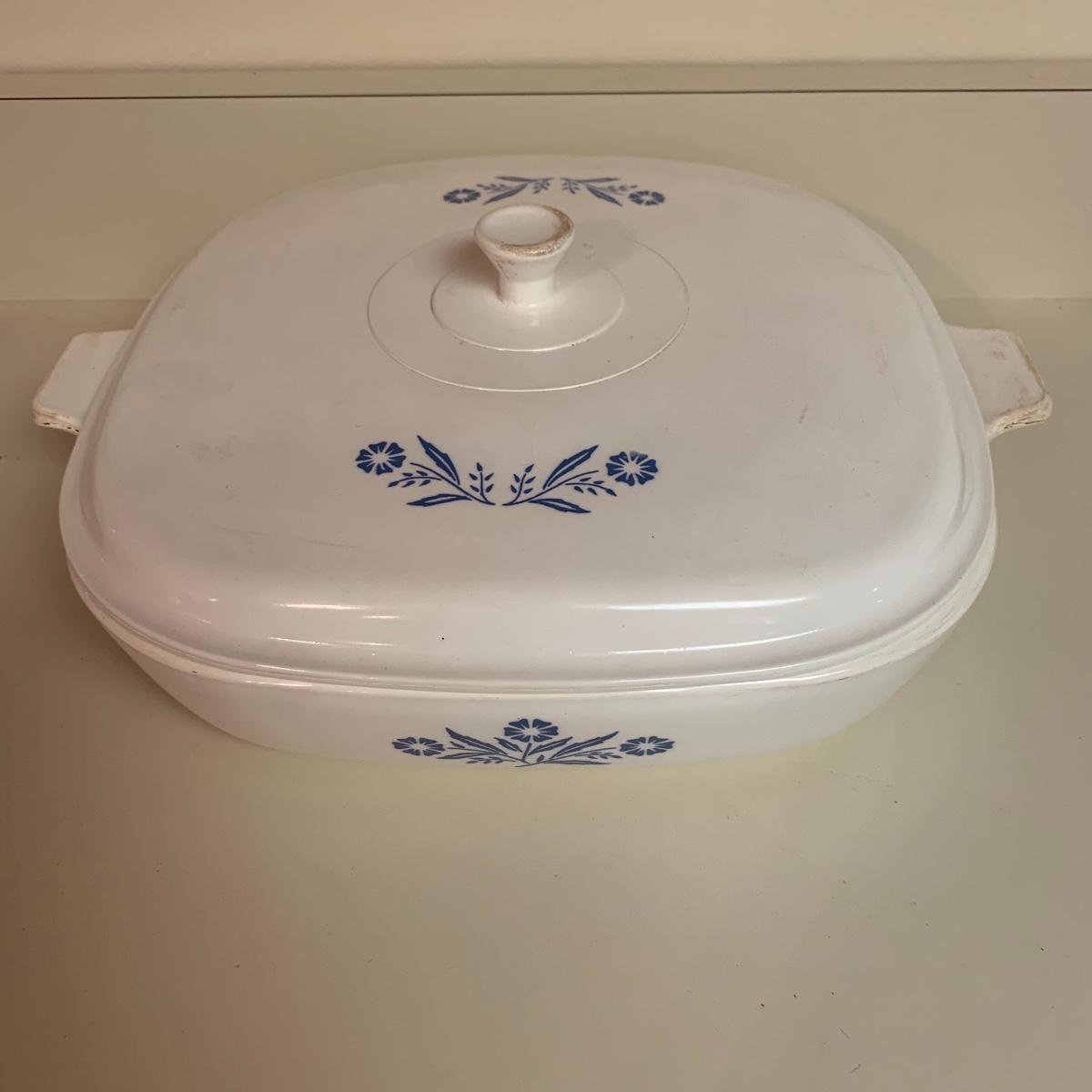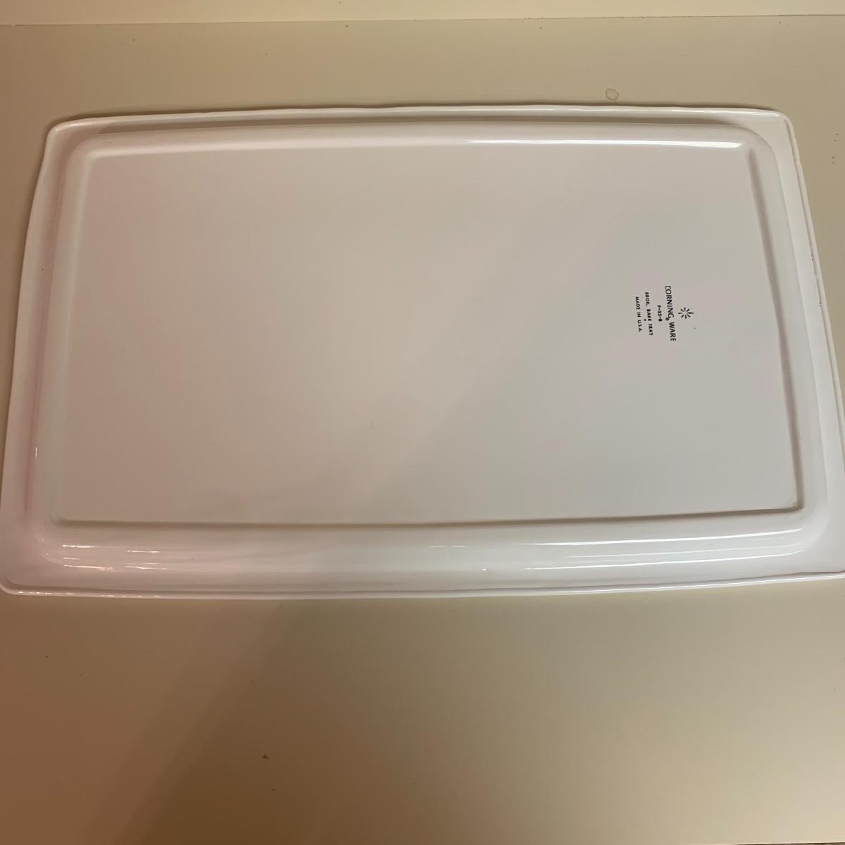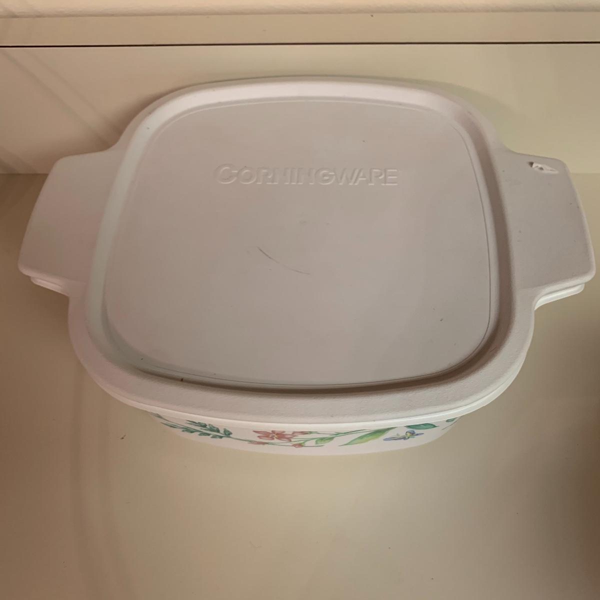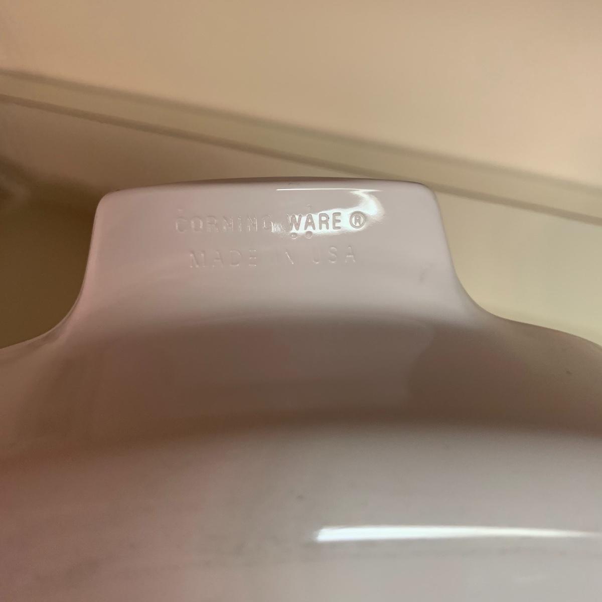 This lot includes 3 miscellaneous casserole dishes with lids, a set of 3 casserole dishes with lids, a set of 6 teacups, a set of 2 teacups, a coffee pot with two lids, casserole dish holders, and more. The coffee pot has staining at the bottom. Everything in this lot is Corning brand. The largest casserole dish measures about 12in x 10in. The serving plate measures about 16in x 10in without the holding rack.