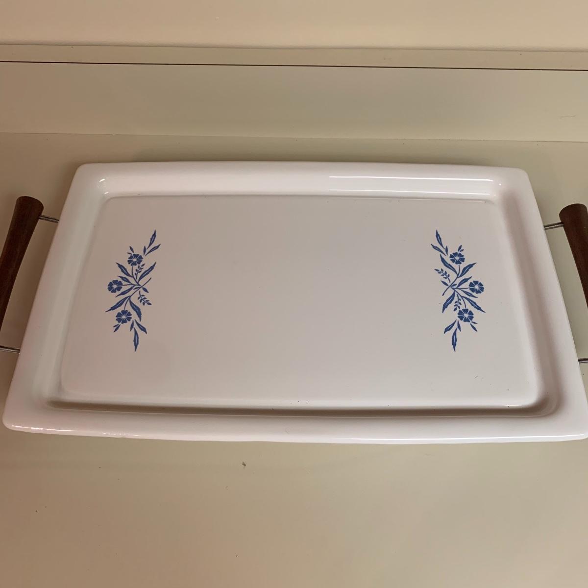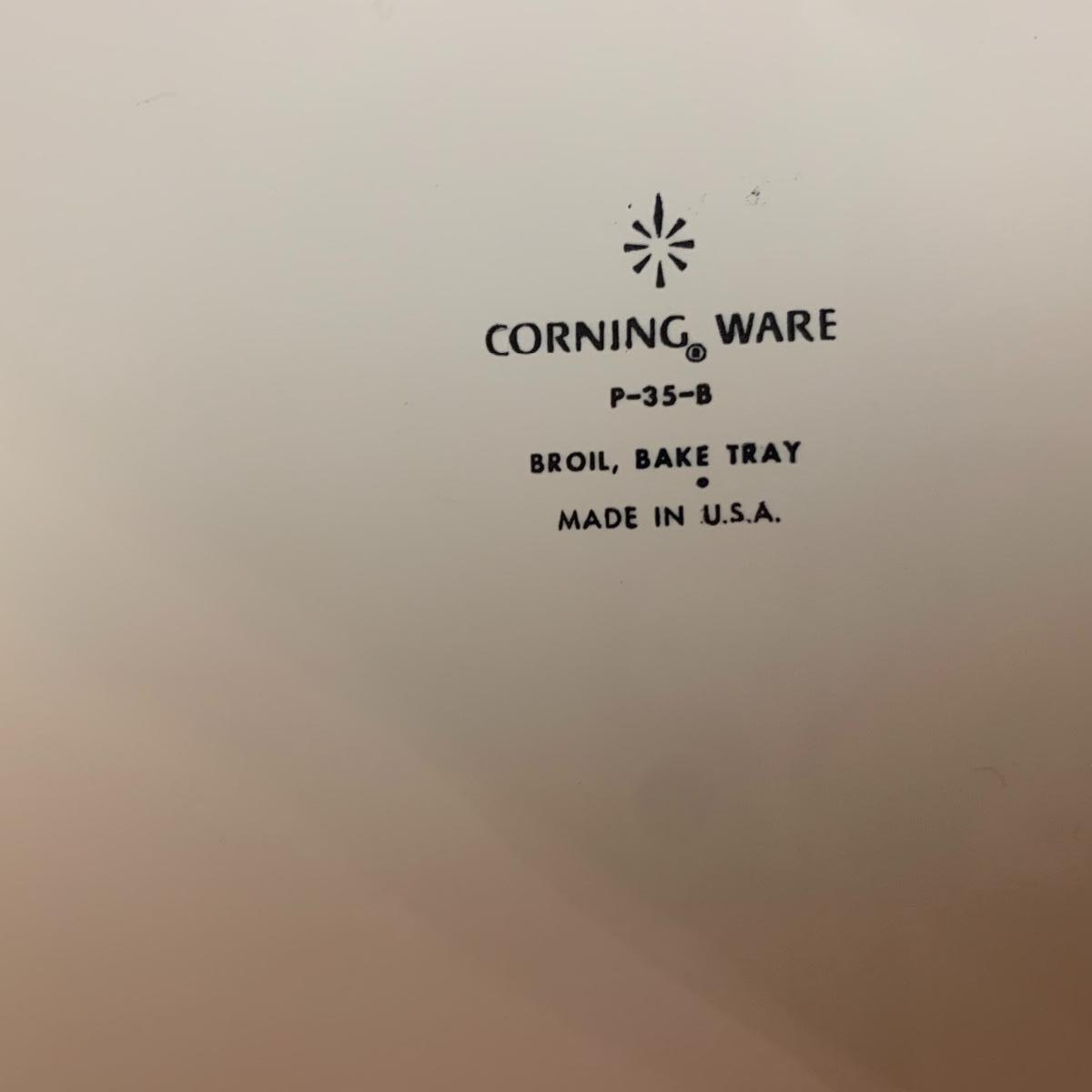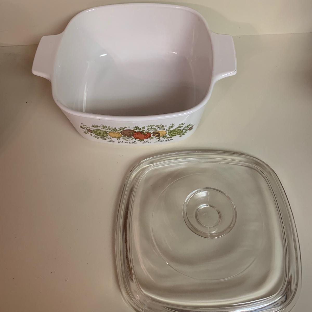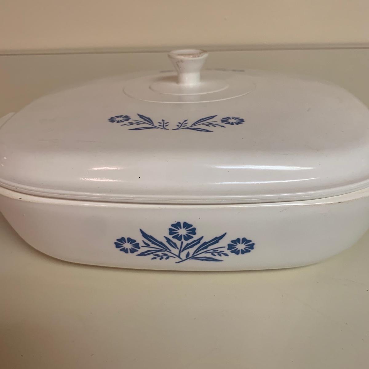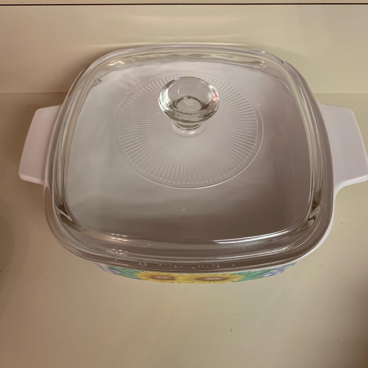 This lot includes 3 miscellaneous casserole dishes with lids, a set of 3 casserole dishes with lids, a set of 6 teacups, a set of 2 teacups, a coffee pot with two lids, casserole dish holders, and more. The coffee pot has staining at the bottom. Everything in this lot is Corning brand. The largest casserole dish measures about 12in x 10in. The serving plate measures about 16in x 10in without the holding rack.