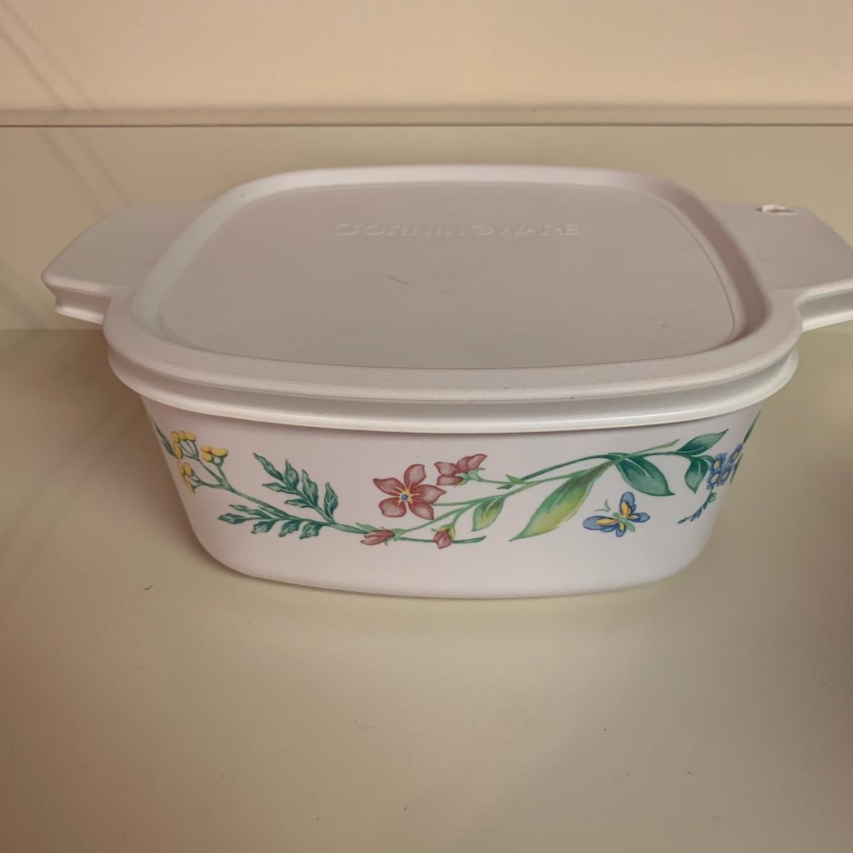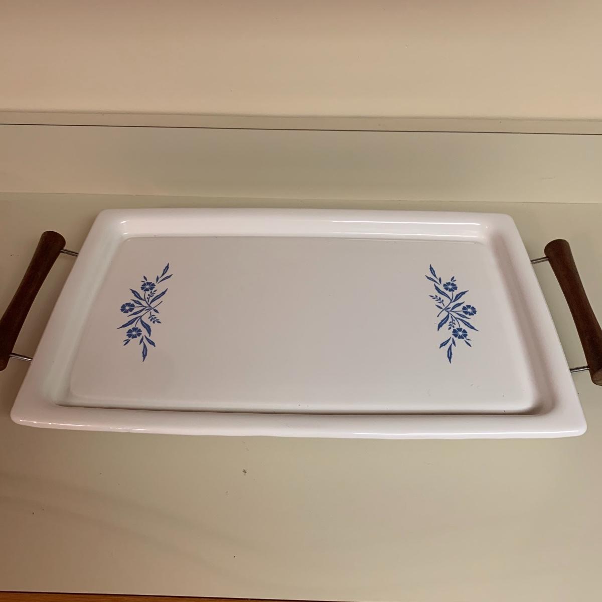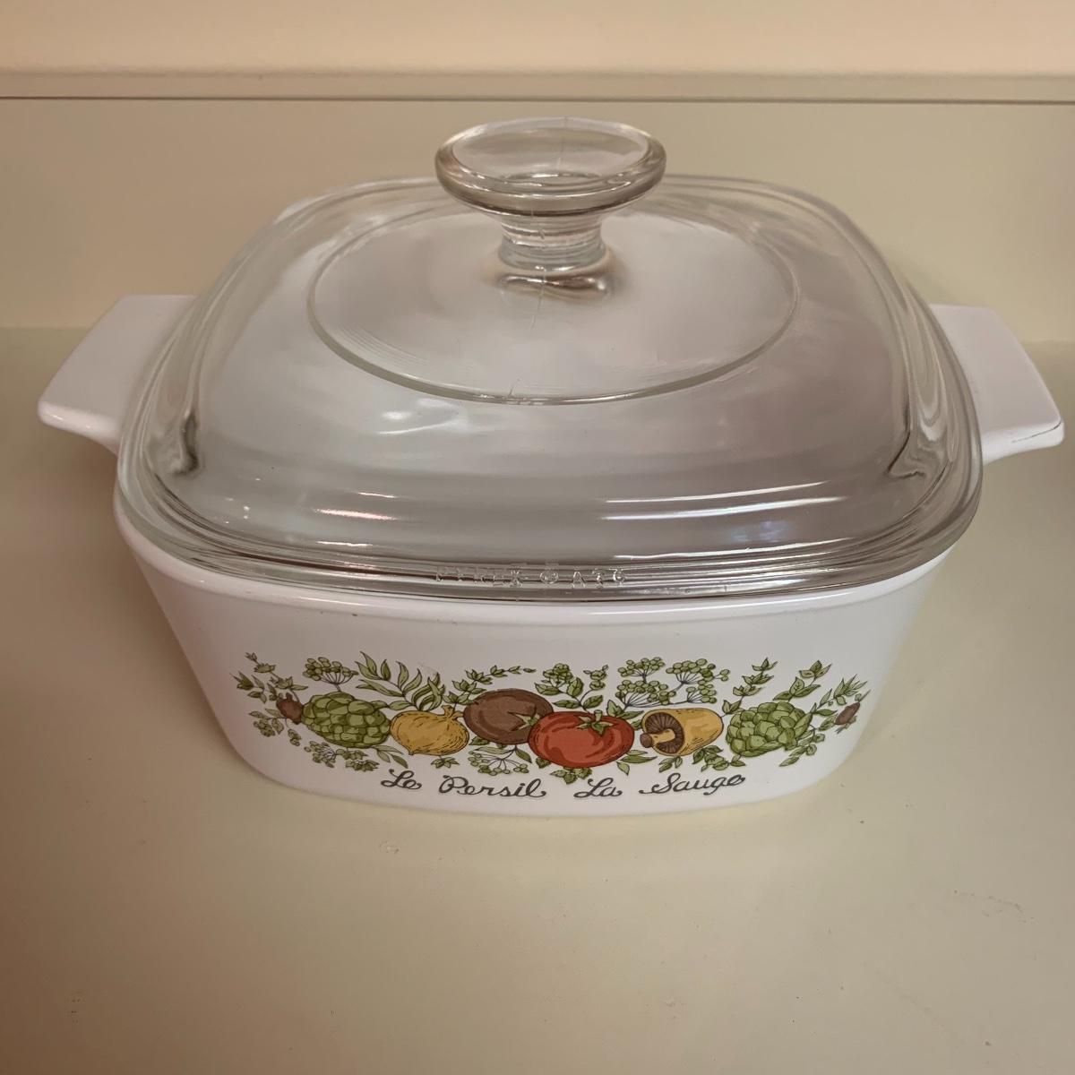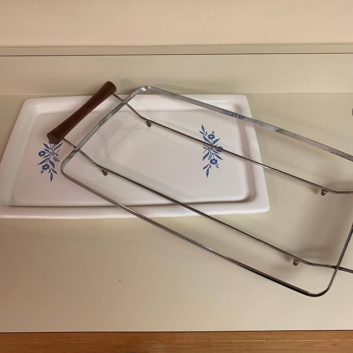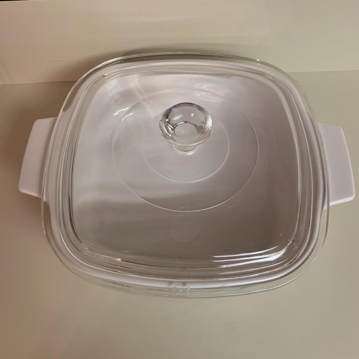 This lot includes 3 miscellaneous casserole dishes with lids, a set of 3 casserole dishes with lids, a set of 6 teacups, a set of 2 teacups, a coffee pot with two lids, casserole dish holders, and more. The coffee pot has staining at the bottom. Everything in this lot is Corning brand. The largest casserole dish measures about 12in x 10in. The serving plate measures about 16in x 10in without the holding rack.