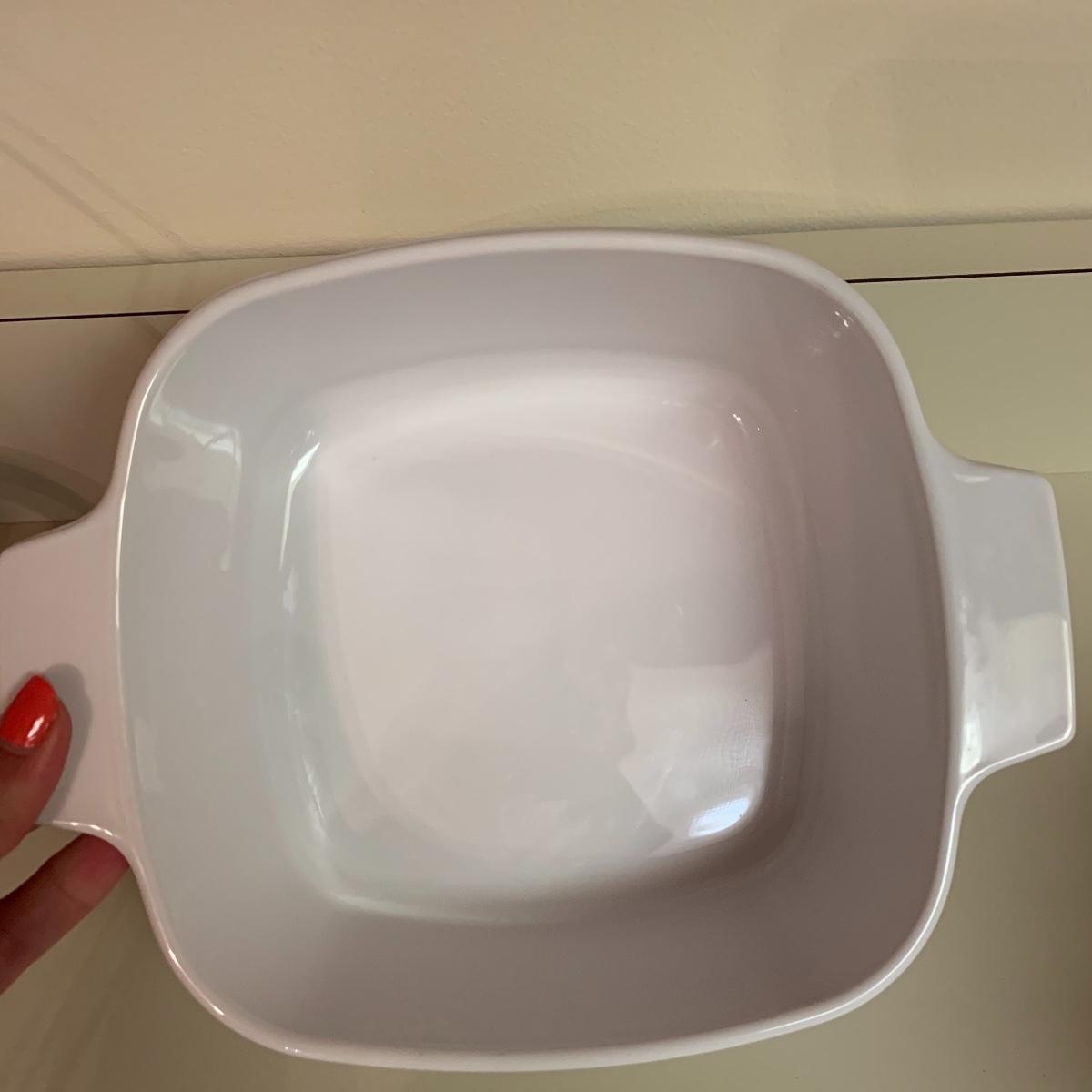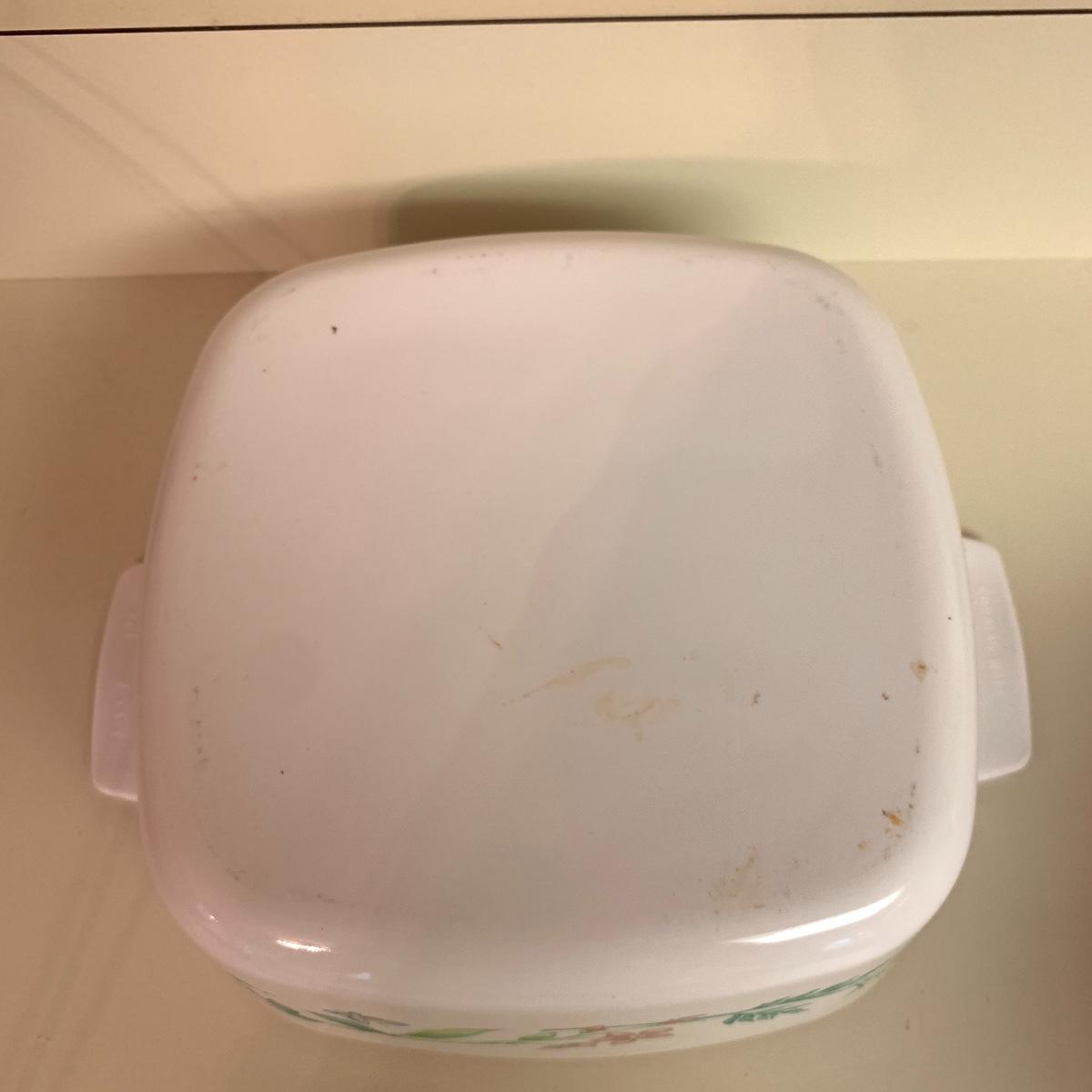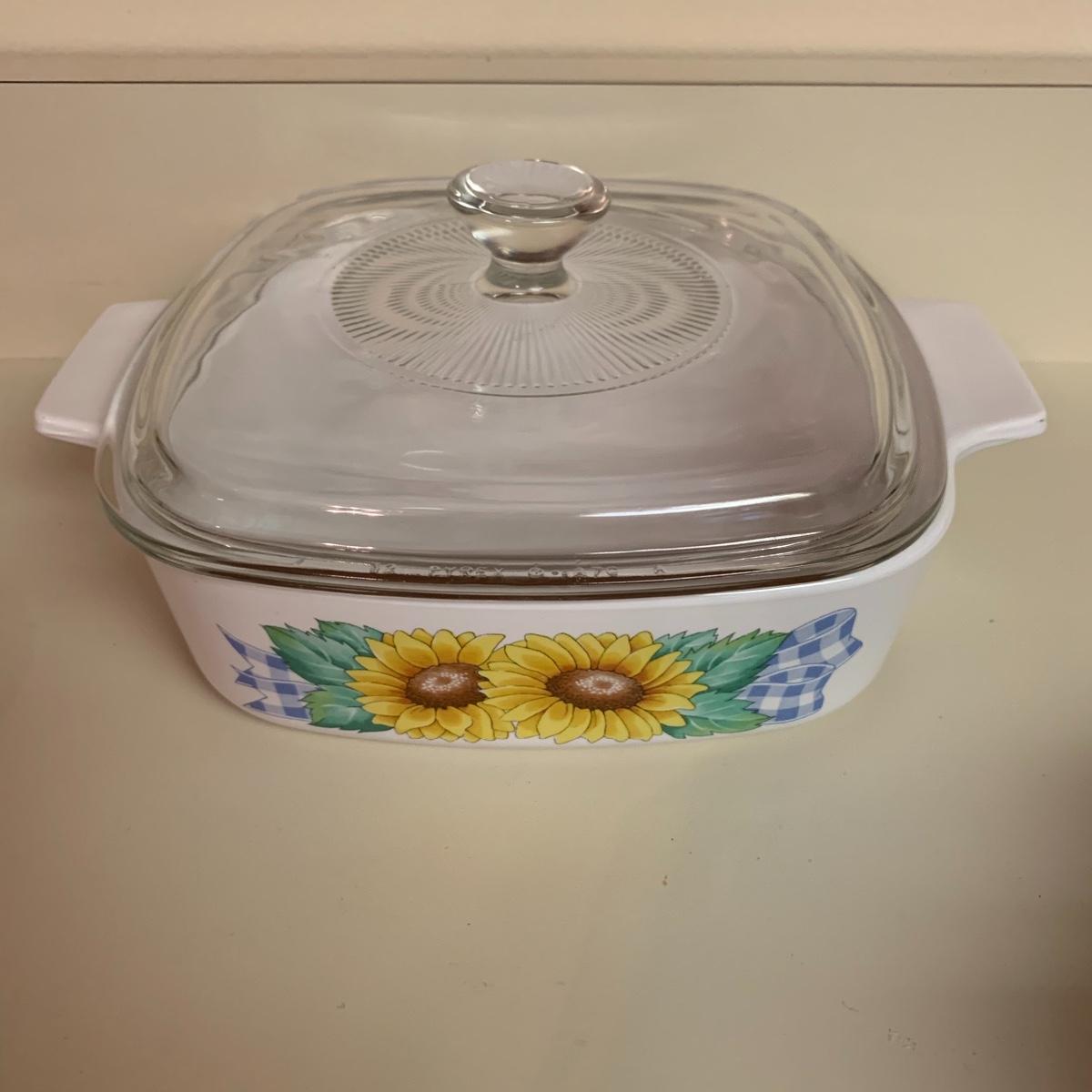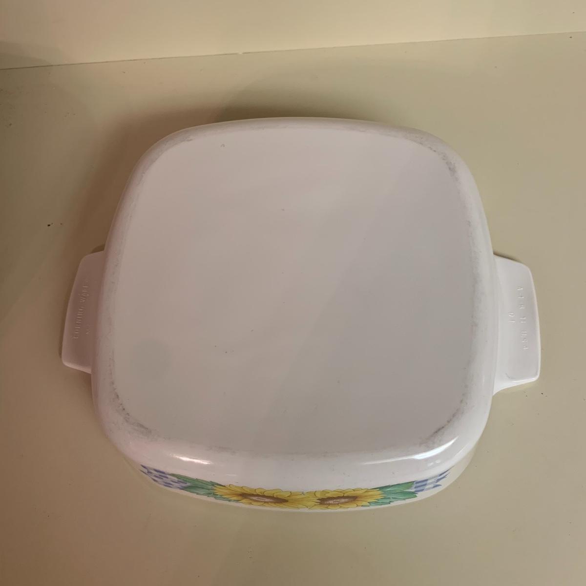 This lot includes 3 miscellaneous casserole dishes with lids, a set of 3 casserole dishes with lids, a set of 6 teacups, a set of 2 teacups, a coffee pot with two lids, casserole dish holders, and more. The coffee pot has staining at the bottom. Everything in this lot is Corning brand. The largest casserole dish measures about 12in x 10in. The serving plate measures about 16in x 10in without the holding rack.