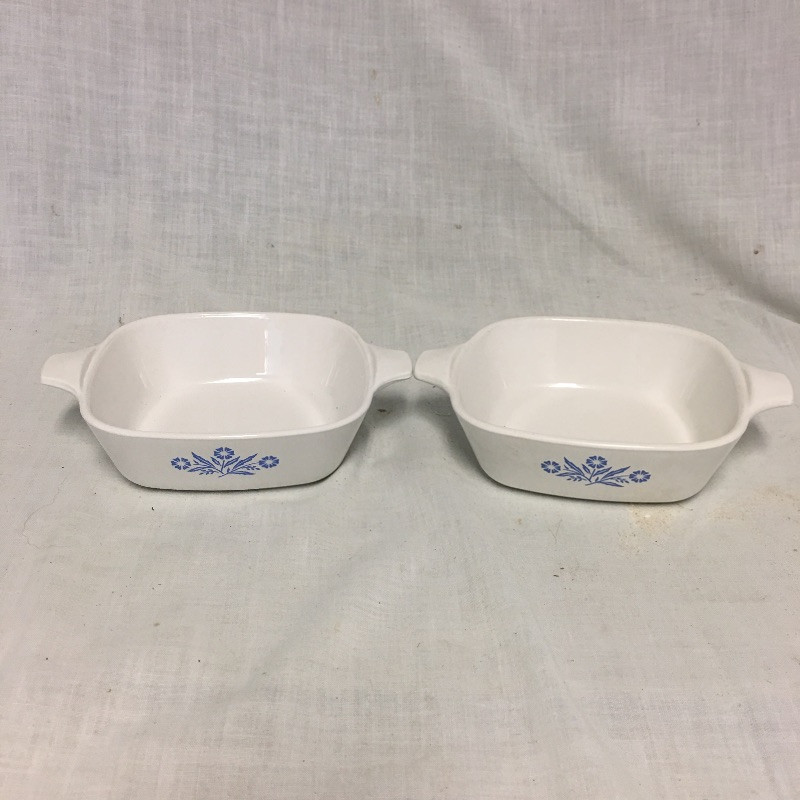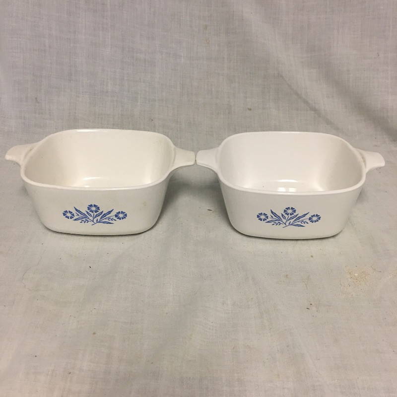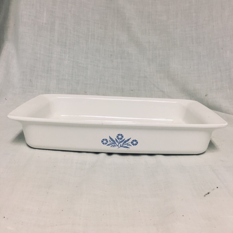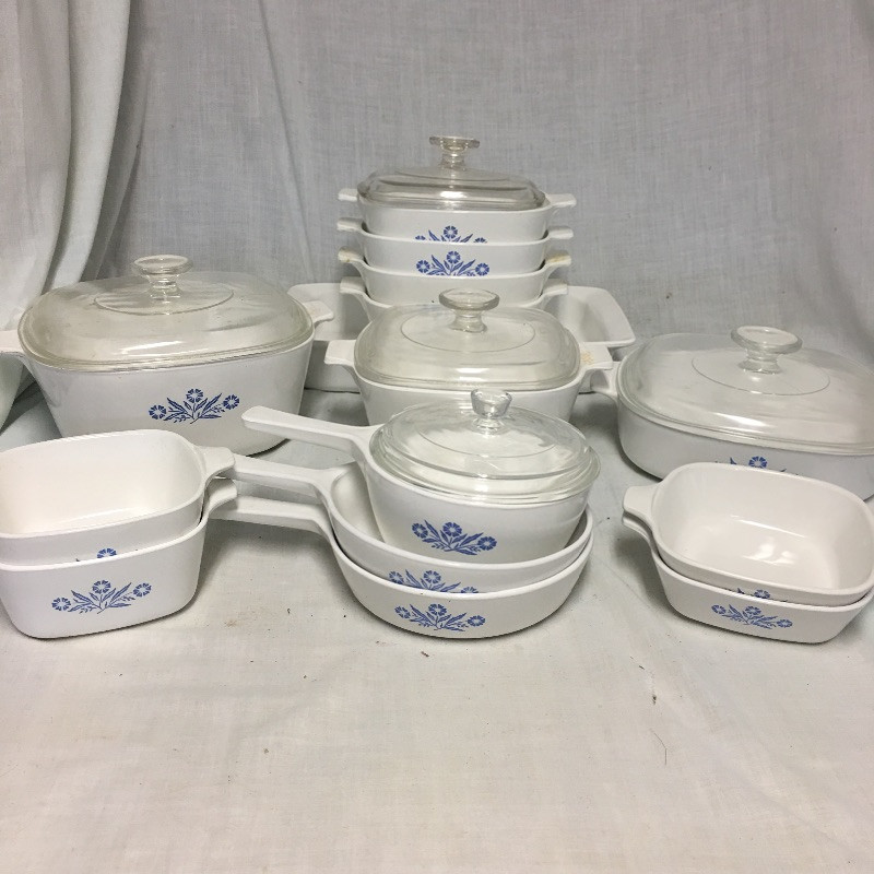 There are twenty three pieces altogether here with this collection of Corning Ware that includes six lids, thirteen square dishes, three dishes with handle, two pot holder metal handles and one rectangular dish. All but two dishes have the matching blue pattern. Longest piece measures 8.5” x 13.5” x 2”.