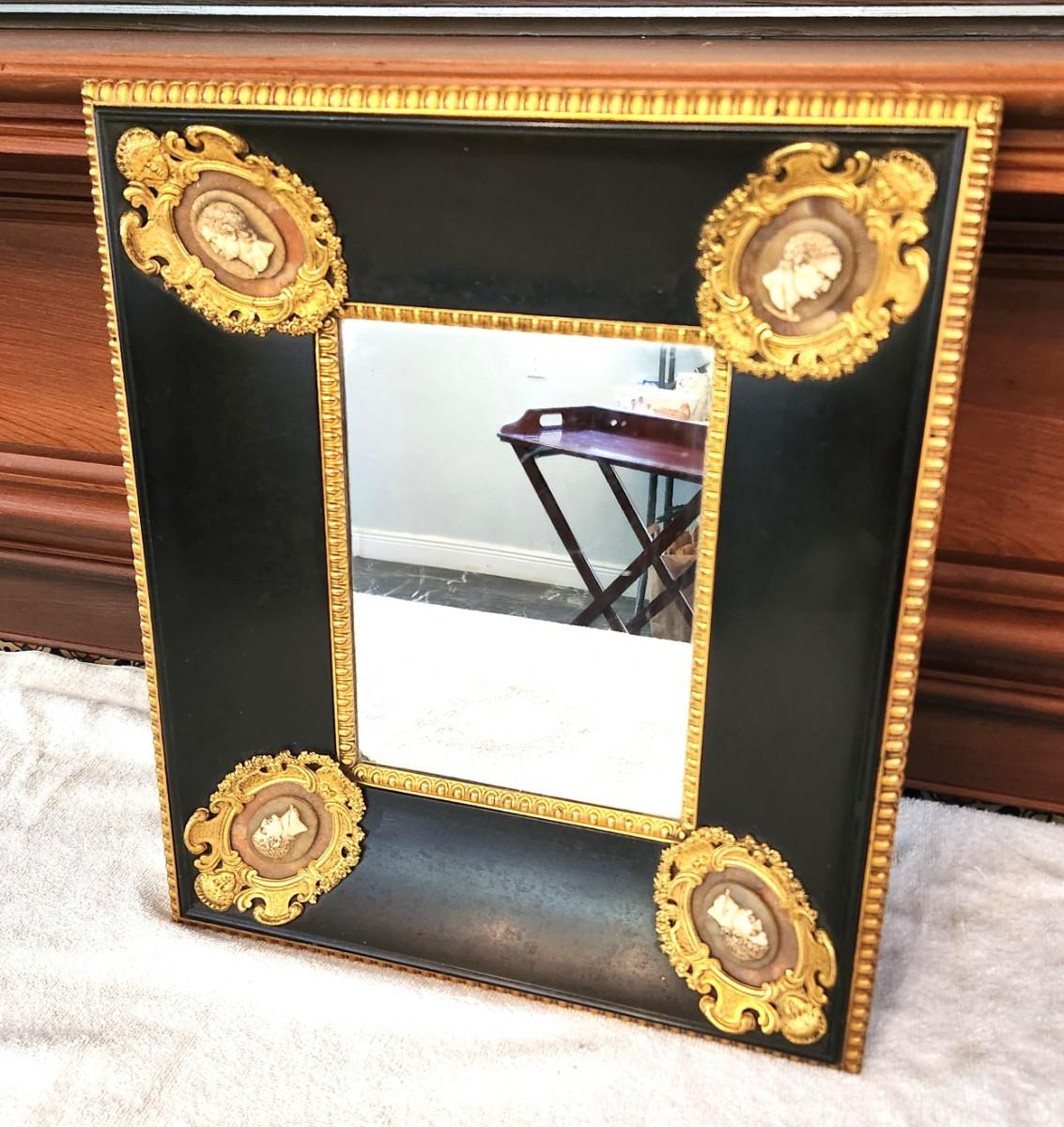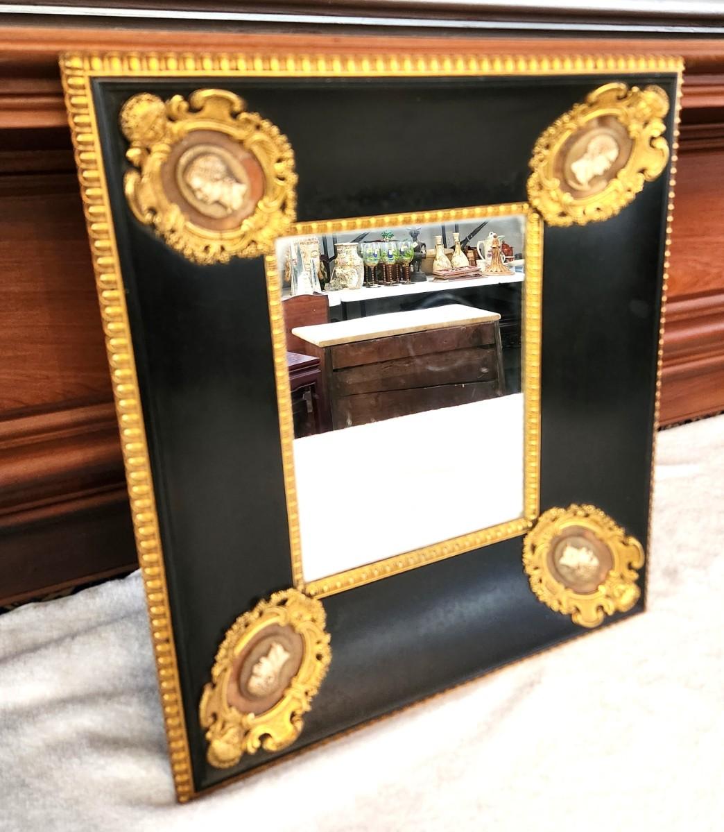 Contemporary Decorative mirror with "cameo" style accents at the four corners. Cameos are heavy resin. - gently used condition. 13" x 15.5". Heavy.