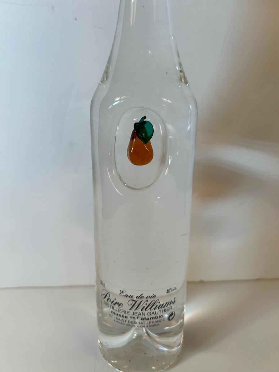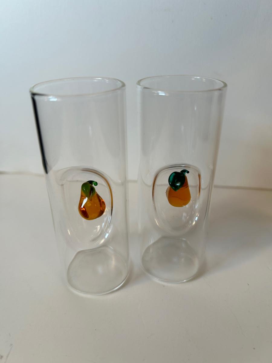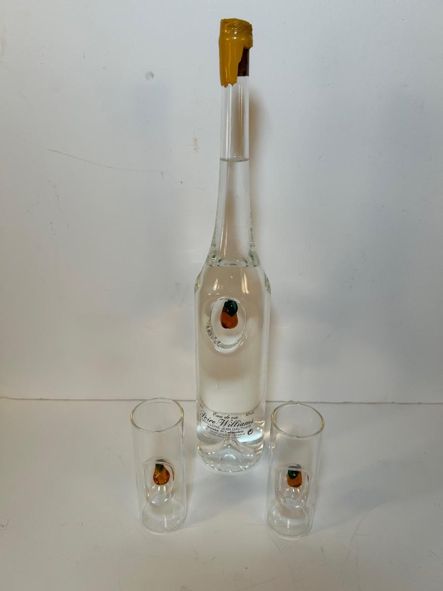 Glass bottle with colored glass pear in center with matching shot style glasses