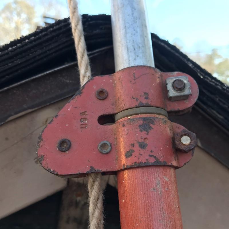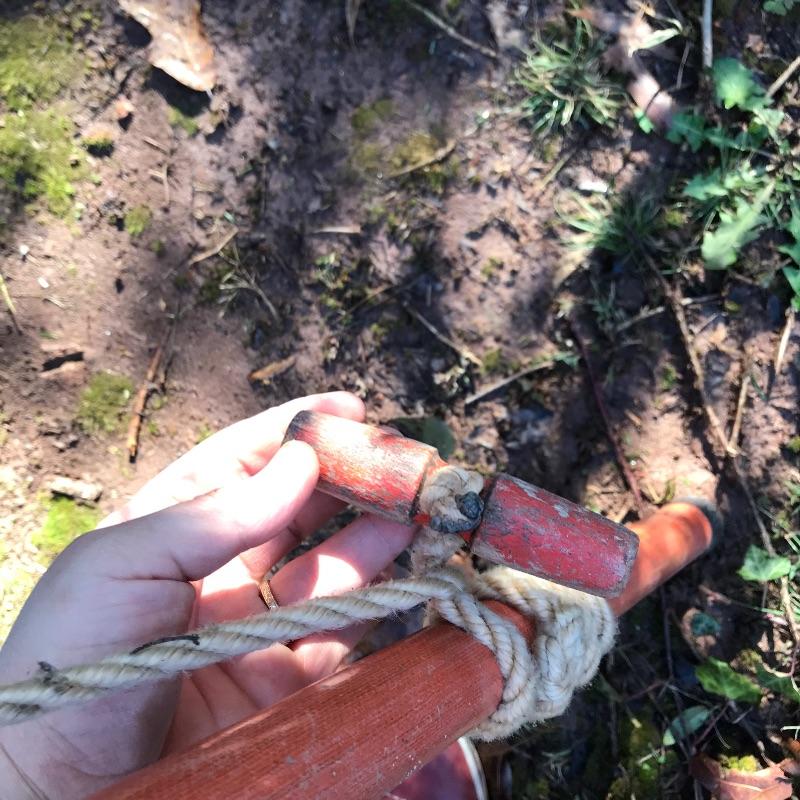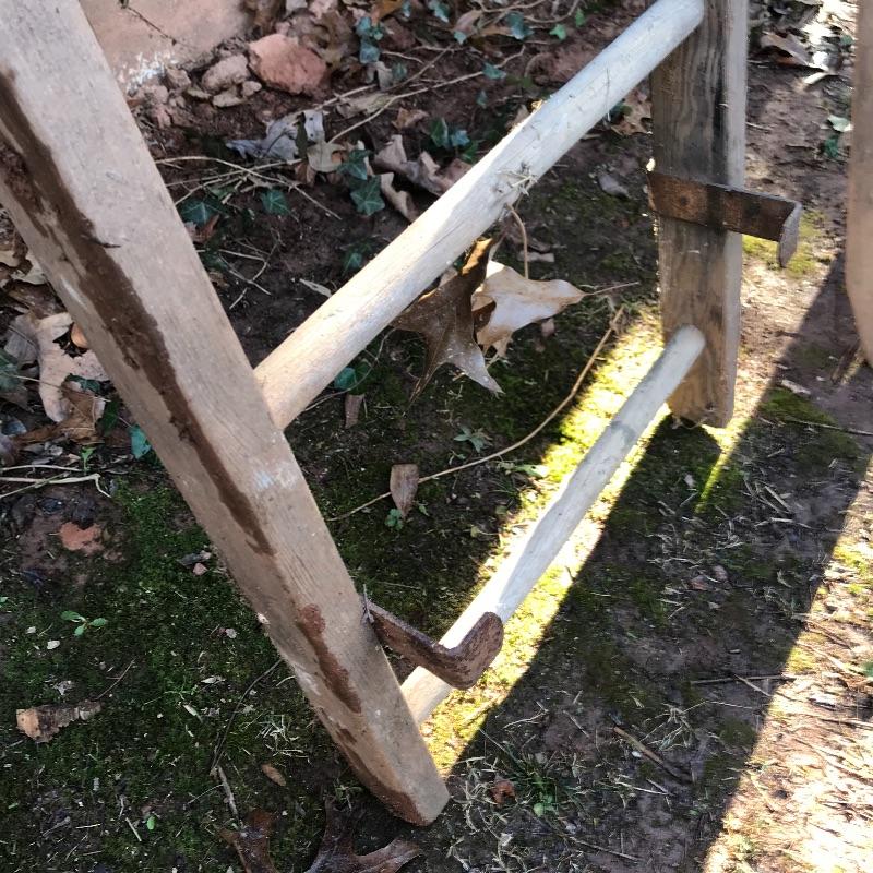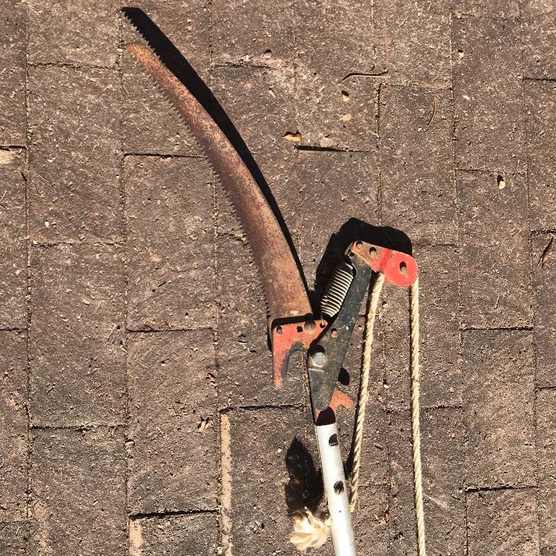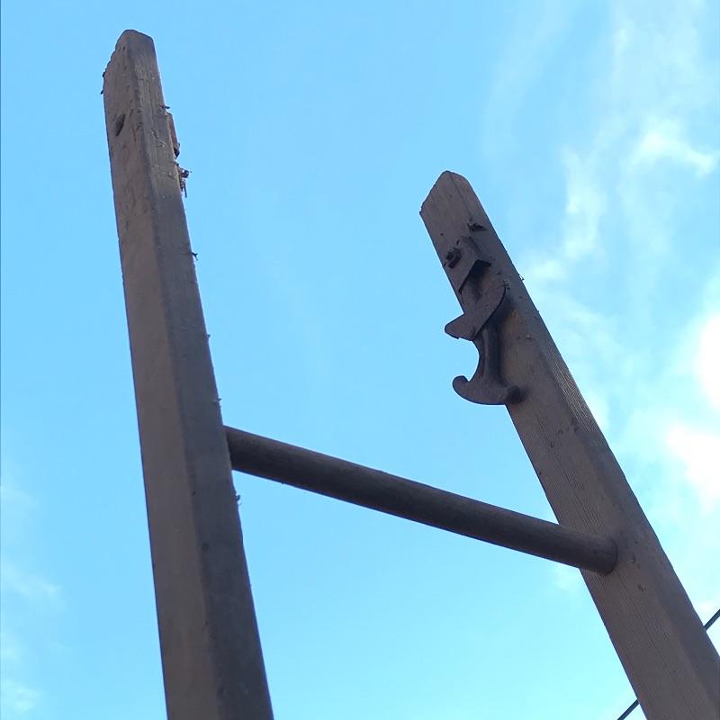 We found another hidden dual-purpose gem! A wooden extension ladder with each piece measuring 10’ x 16”. This ladder lacks newer safety features and has been stored under a roof overhang outside, therefore we suggest it is used as decorations only. This lot also features a tree limb lopper. Lopper appears to be secured at about 8’6”. See photos. Local pick up only.