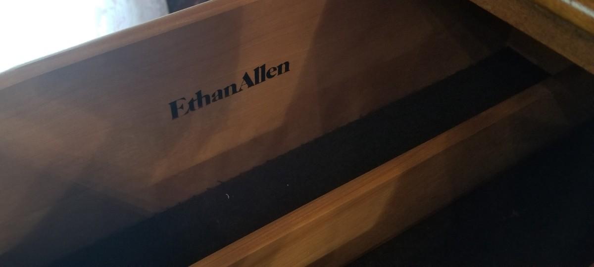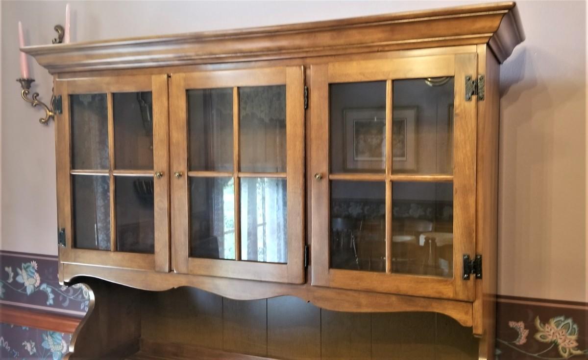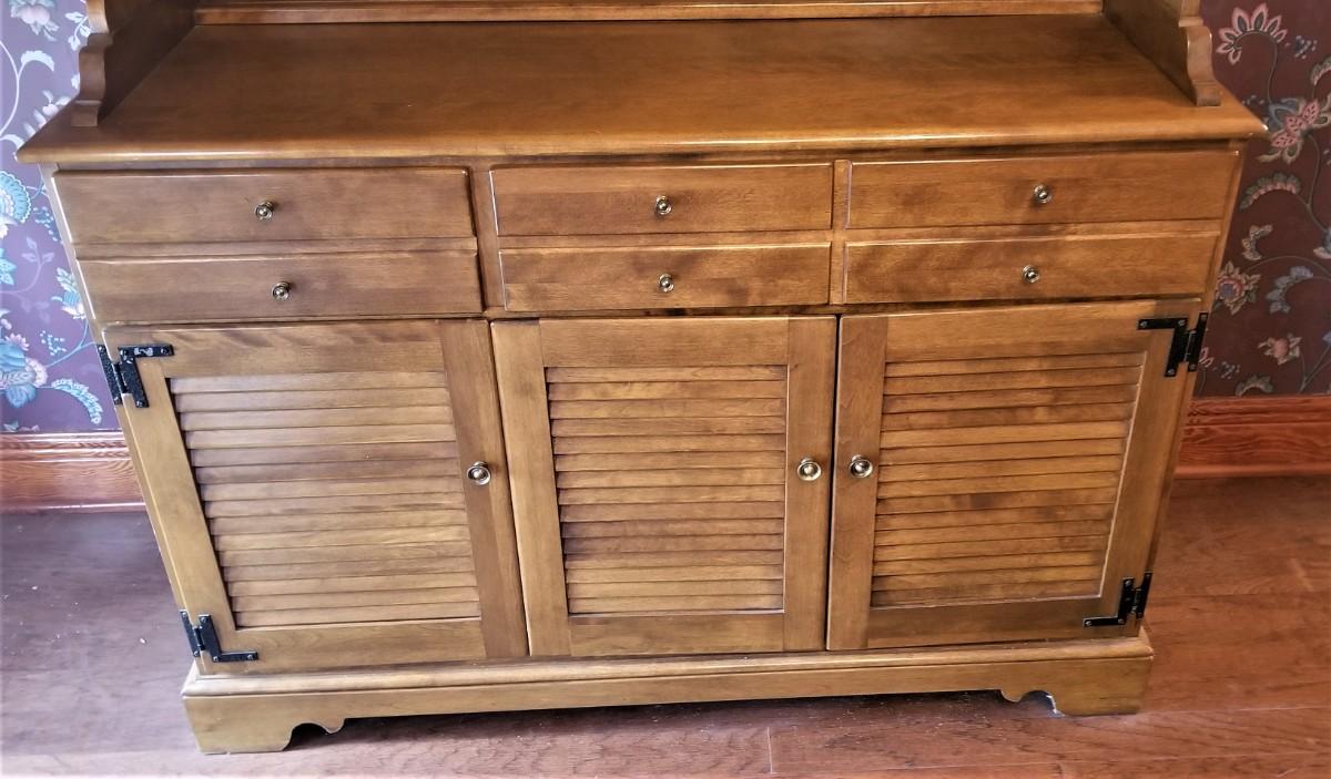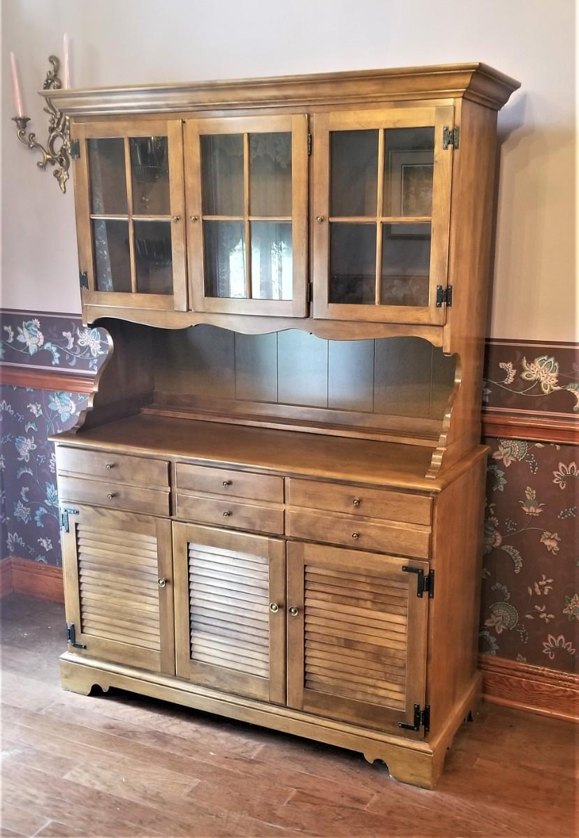 Colonial style Ethan Allen Mid Century china cabinet - adjustable shelves on top, lots of storage underneath, drawers. 70.5" tall, 48" across, 18.5" deep. Solid wood. Good vintage condition.