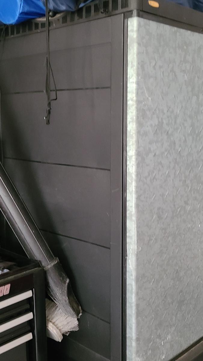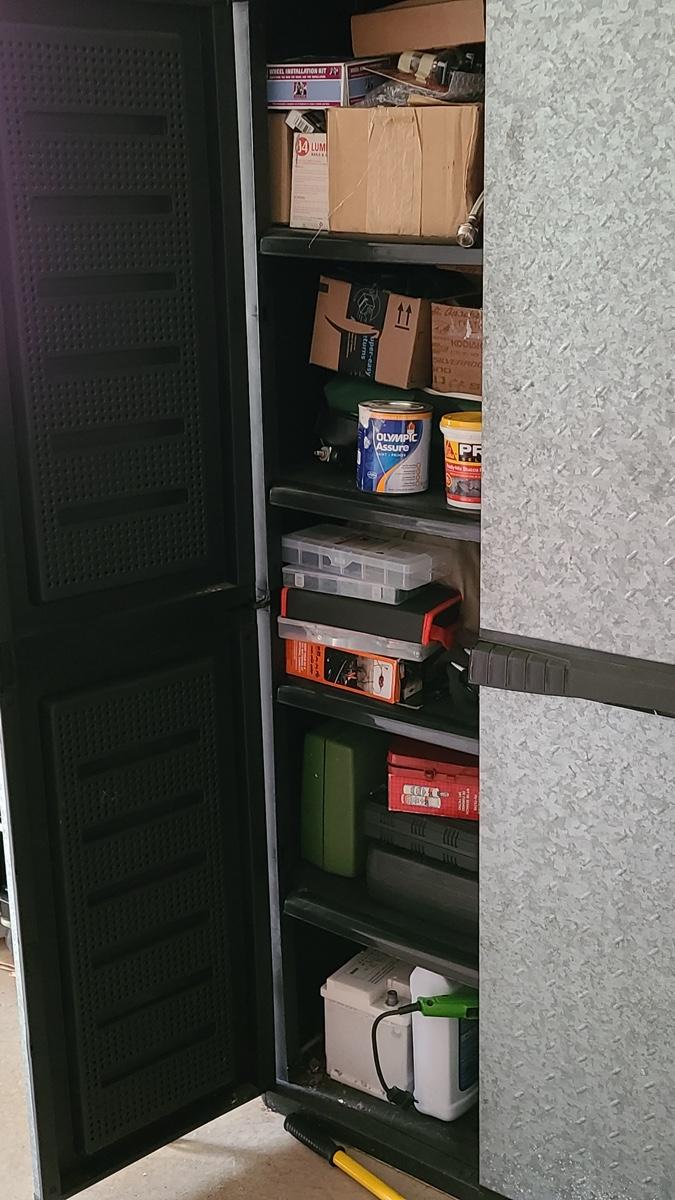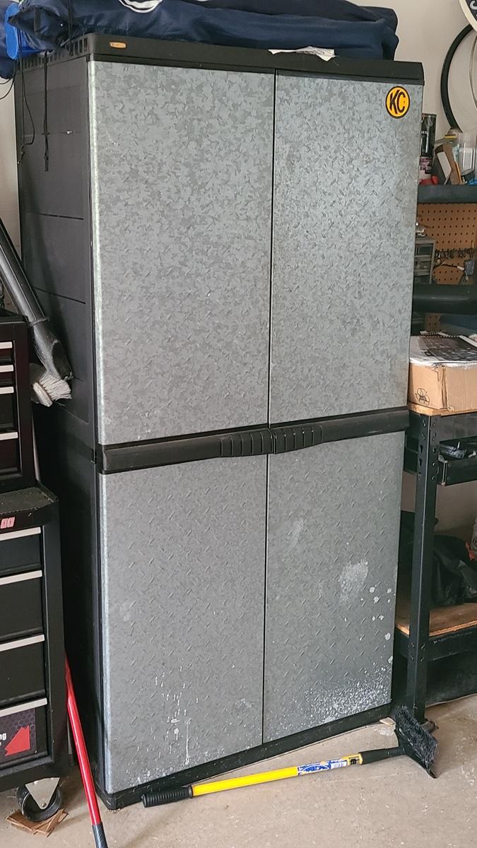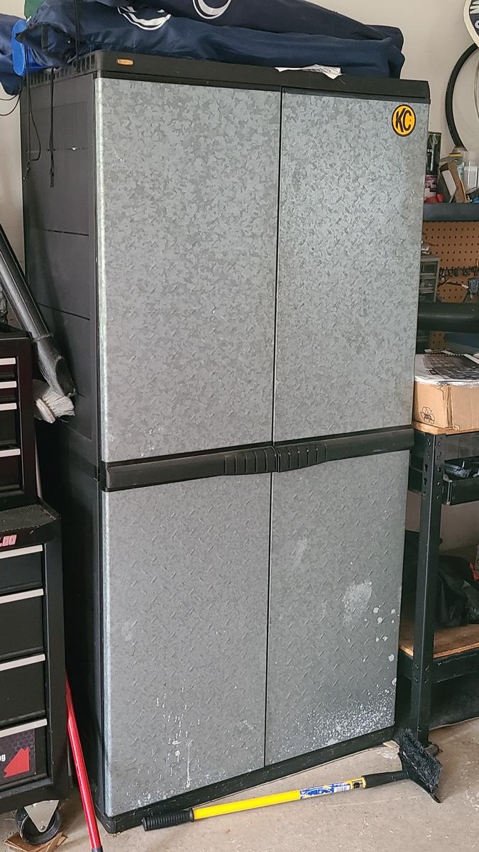 This large storage cabinet is designed to look like metal but is actual not, it is hard plastic so easier to move and hold a lot of items, Measures 35x21x71. The contents inside are not included. Please see all pictures for content of the lot, condition of the lot, and measurements if taken. Pictures are the best representation of the items listed and items are untested unless indicated in description. Thank you for looking and have fun bidding!