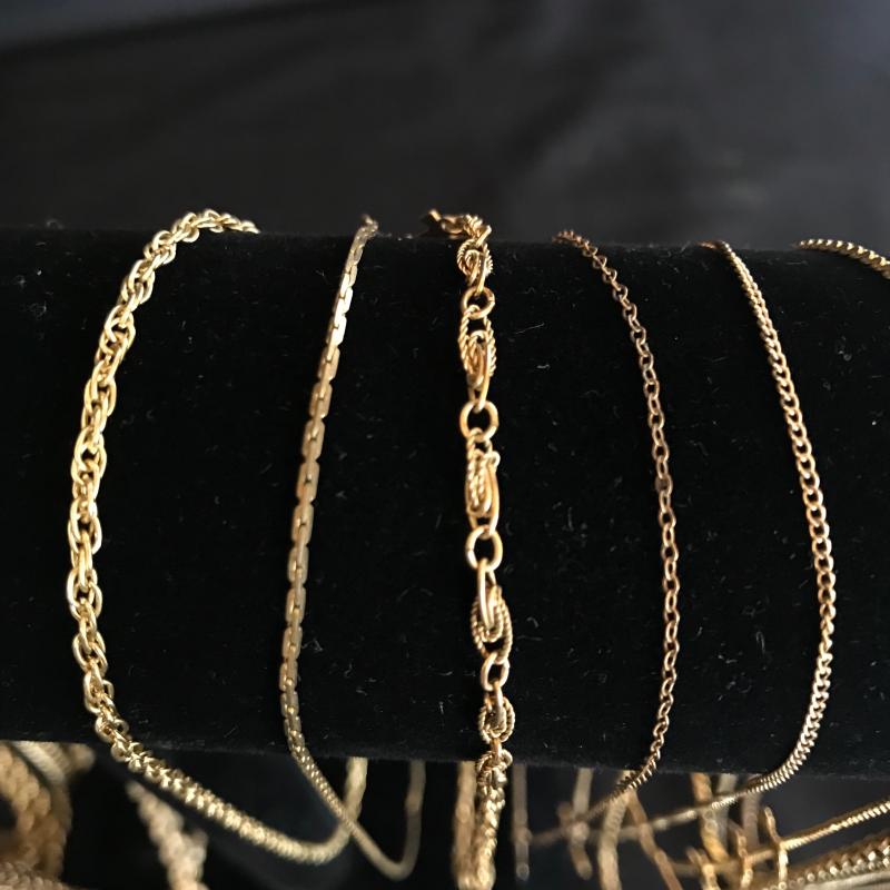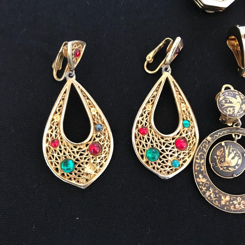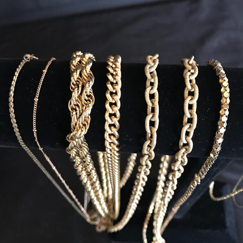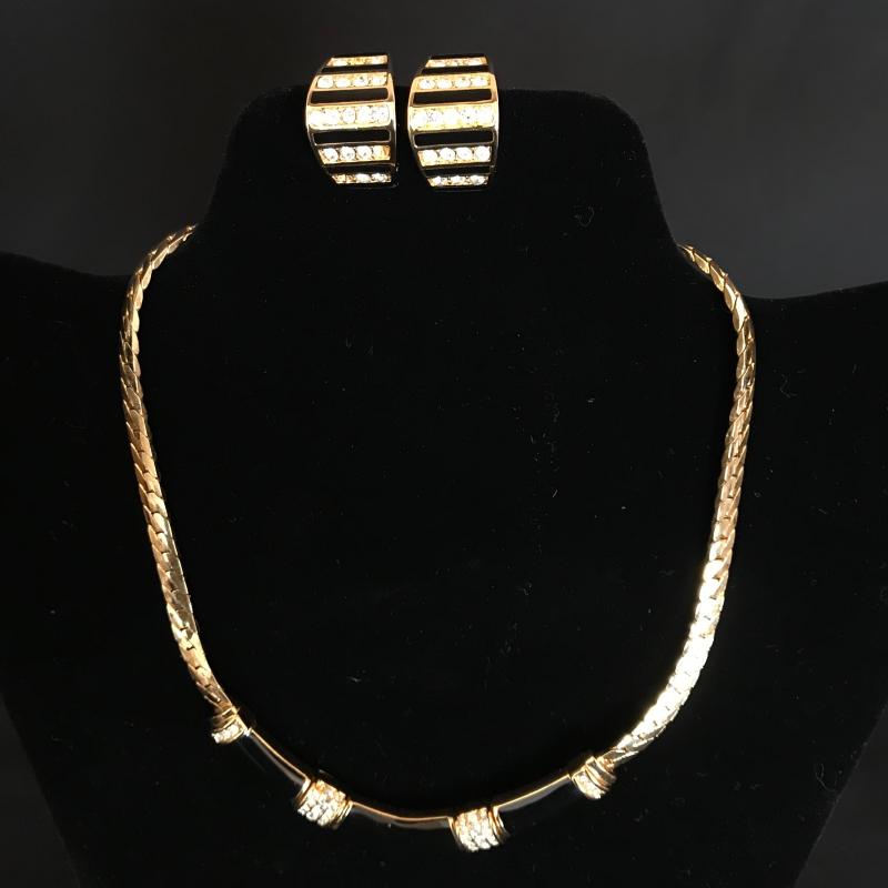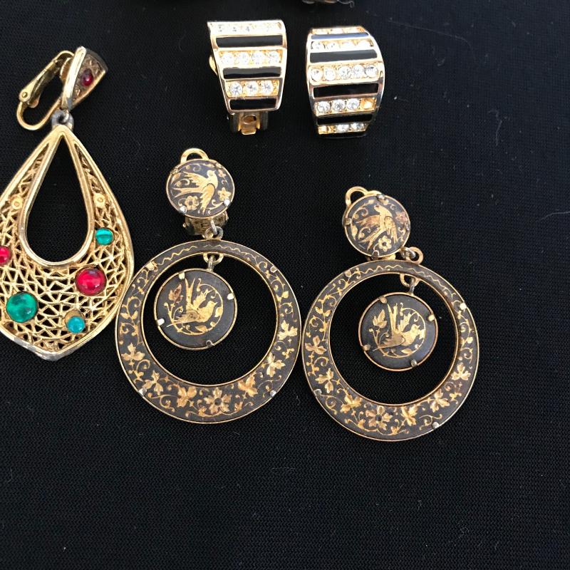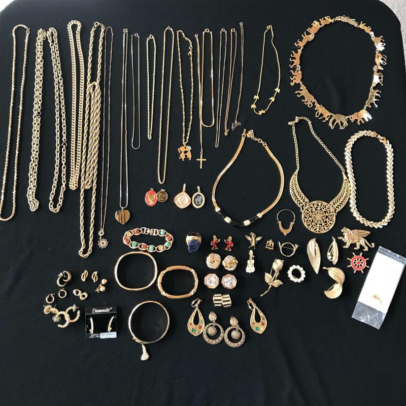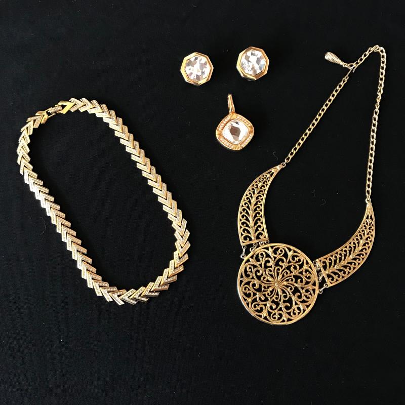 Large collection of golden chains, some with pendants and some separate pendants. Black and crystal necklace with matching clip on earrings is marked Chr. Dior. Fun pairs of crystal earrings for pierced ears and some clip ons. All four bracelets have clasps. Ring size is almost 9.5. Shipping available.