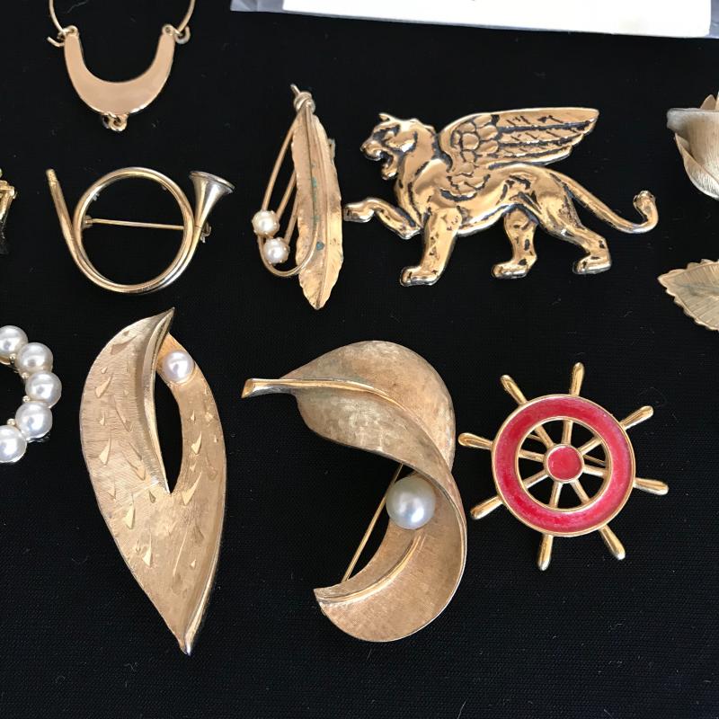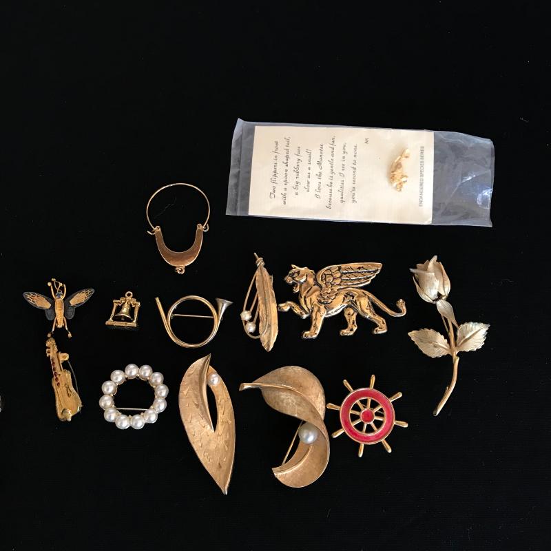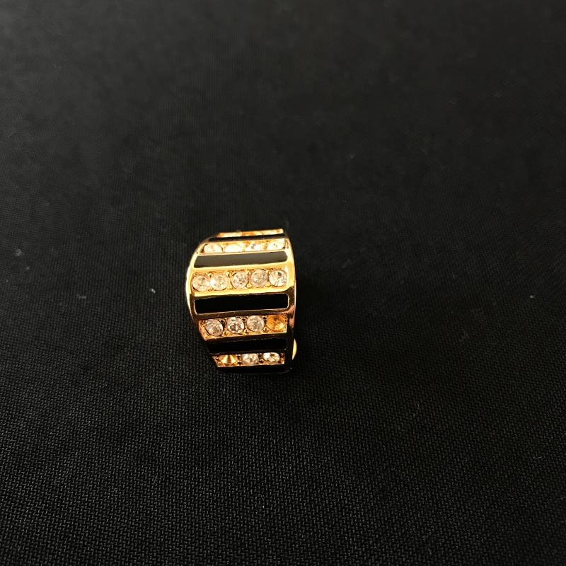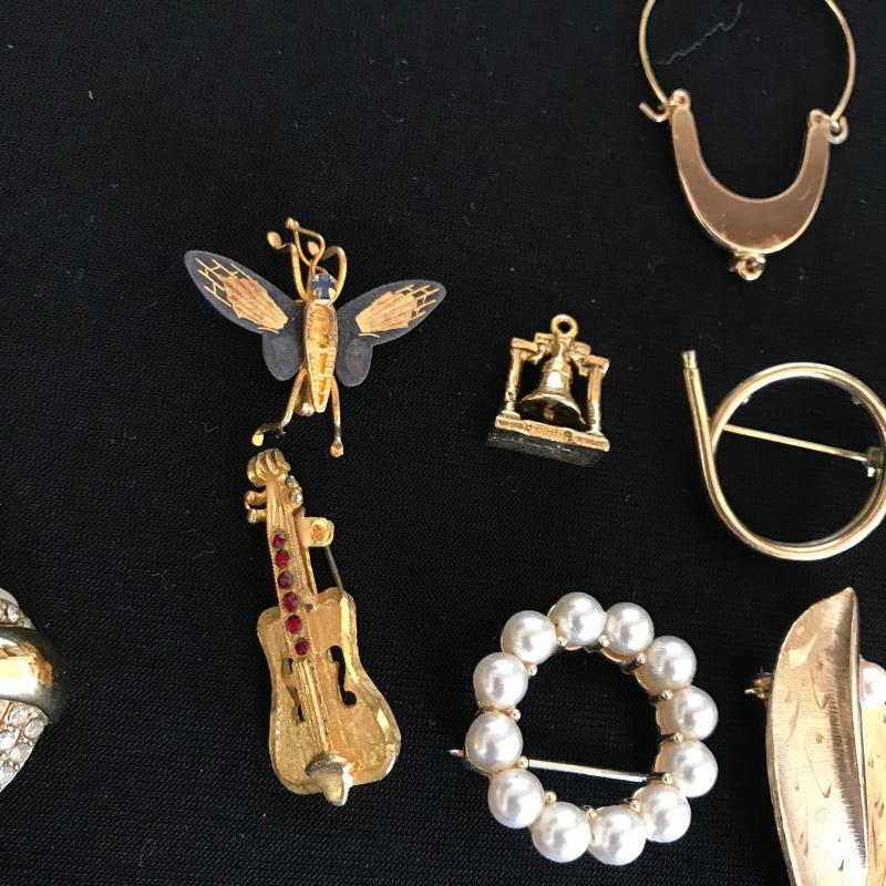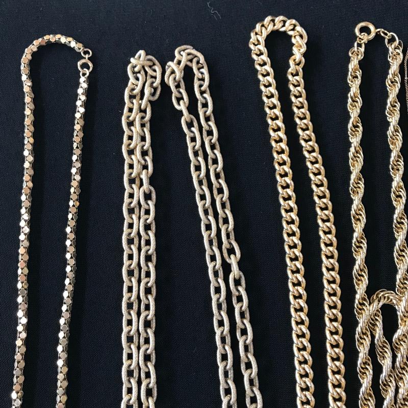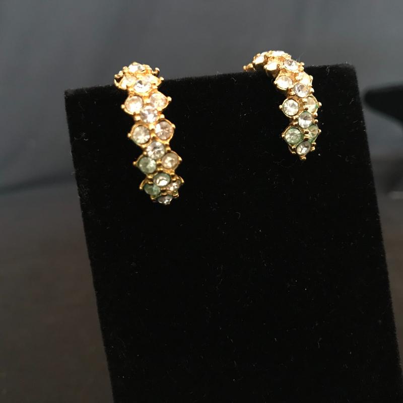 Large collection of golden chains, some with pendants and some separate pendants. Black and crystal necklace with matching clip on earrings is marked Chr. Dior. Fun pairs of crystal earrings for pierced ears and some clip ons. All four bracelets have clasps. Ring size is almost 9.5. Shipping available.