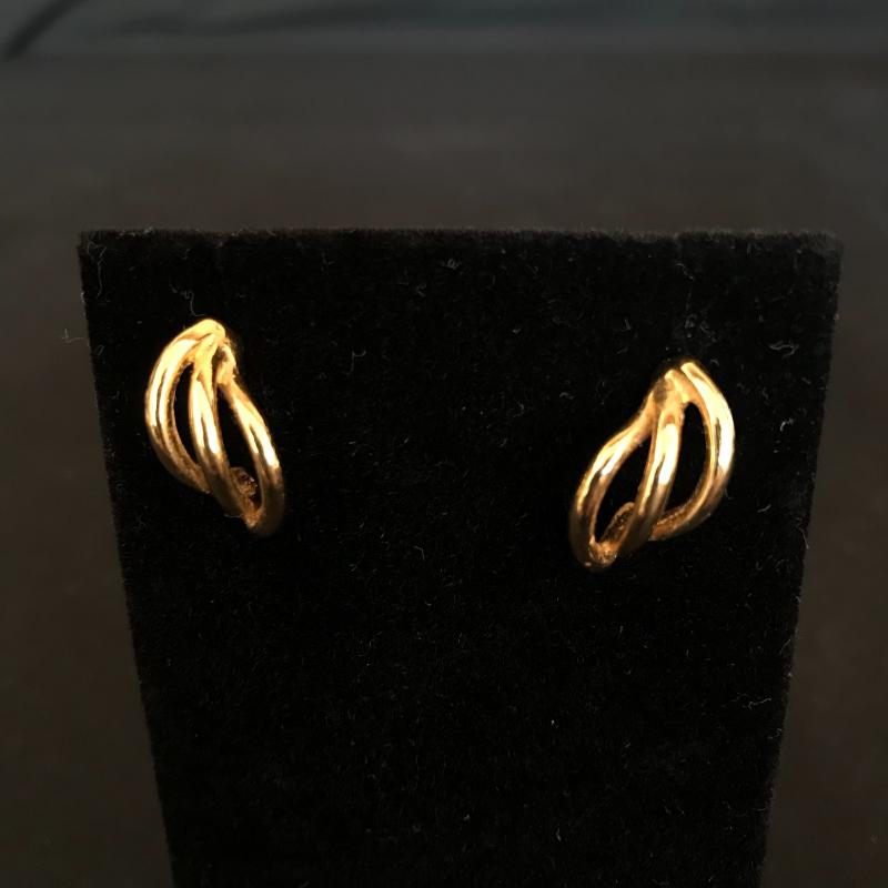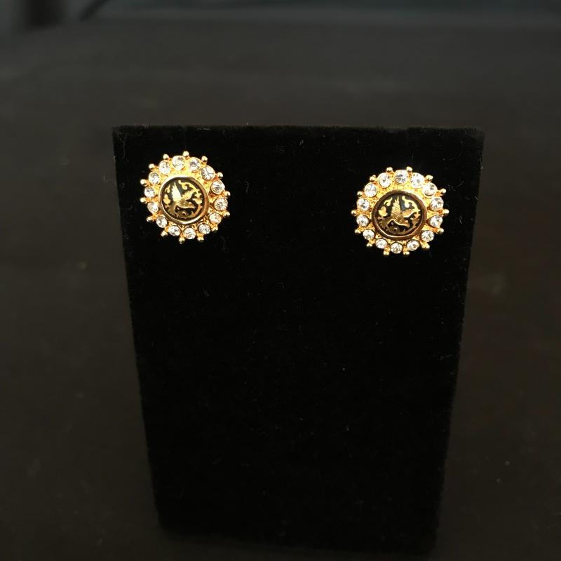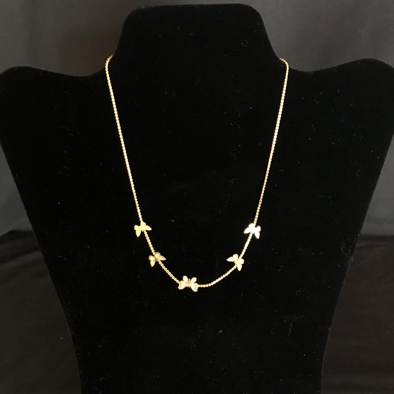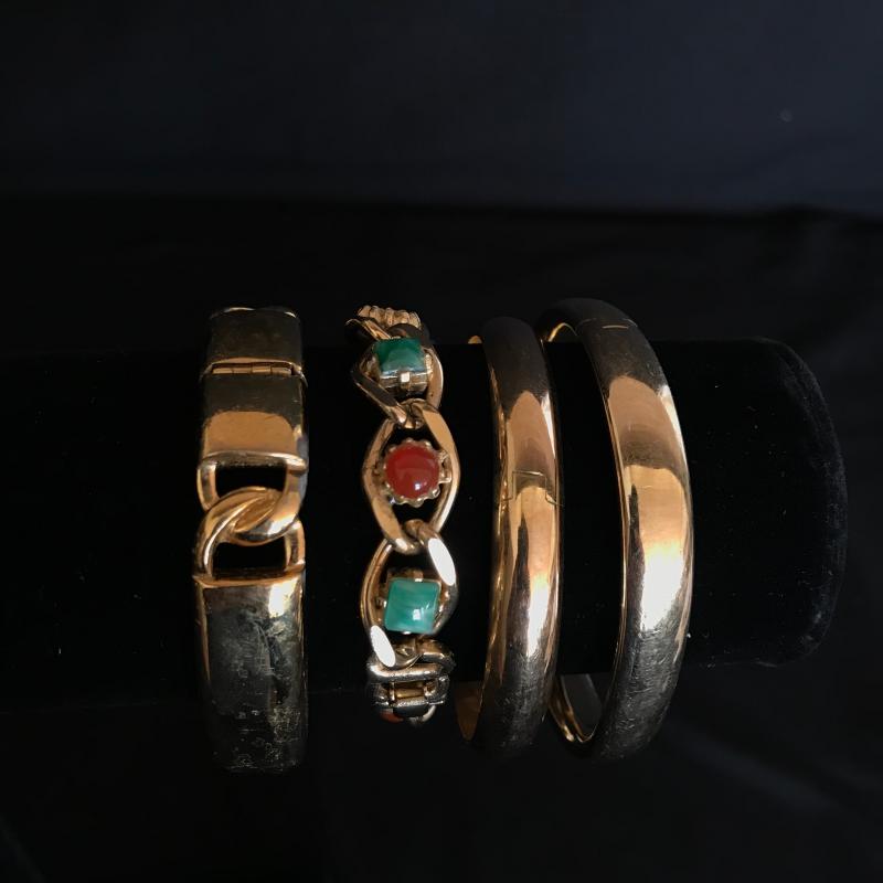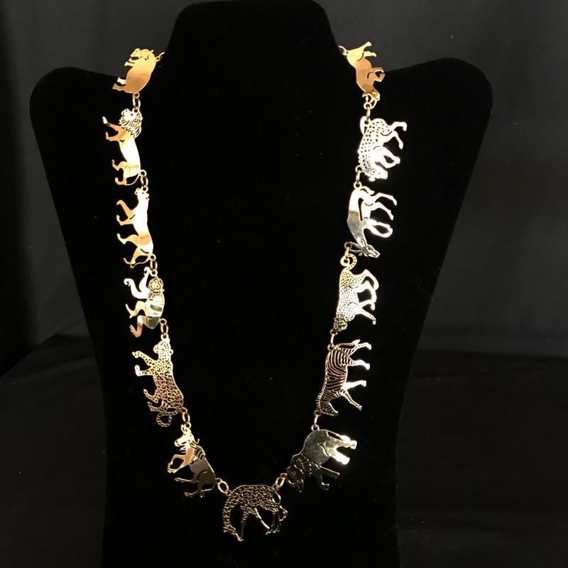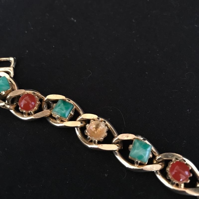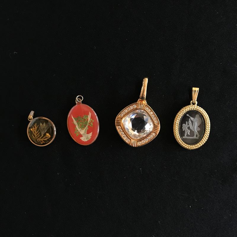 Large collection of golden chains, some with pendants and some separate pendants. Black and crystal necklace with matching clip on earrings is marked Chr. Dior. Fun pairs of crystal earrings for pierced ears and some clip ons. All four bracelets have clasps. Ring size is almost 9.5. Shipping available.