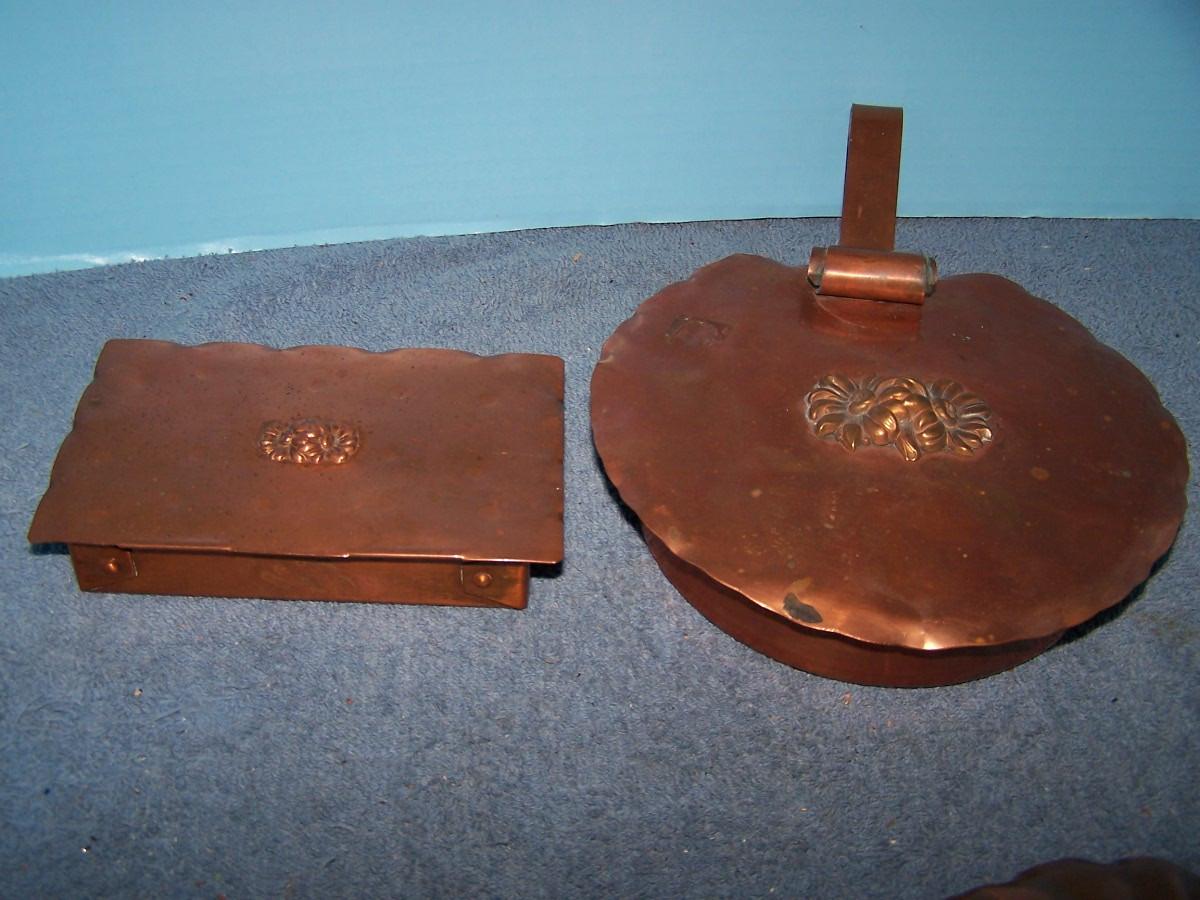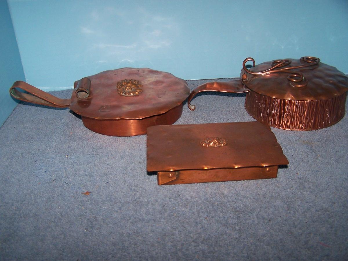 THESE ARE GORGEOUS VINTAGE MCM COPPER BOXES!!! MATCHING BOXES(1 IS HANDLES) ARE MARKED DRUMGOLD.. THE OTHER IS GREGORIAN.. SMALL BOW IS 6'' LONG.. LIGHT WEAR/SPOTS...
