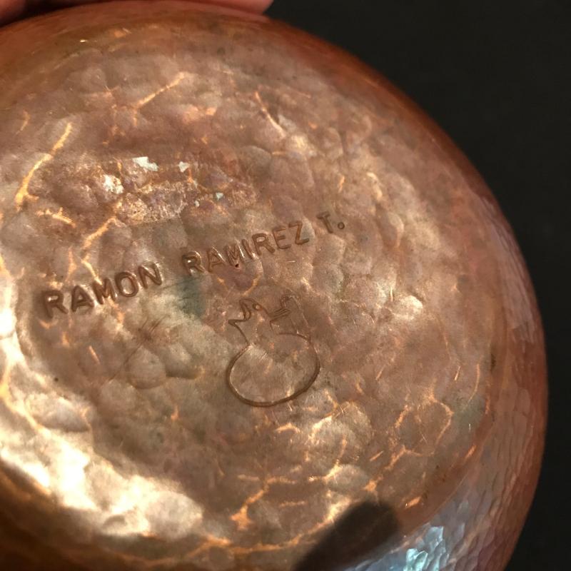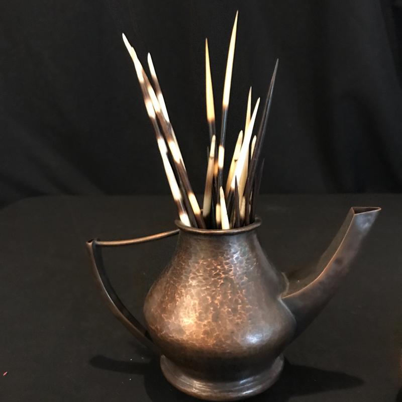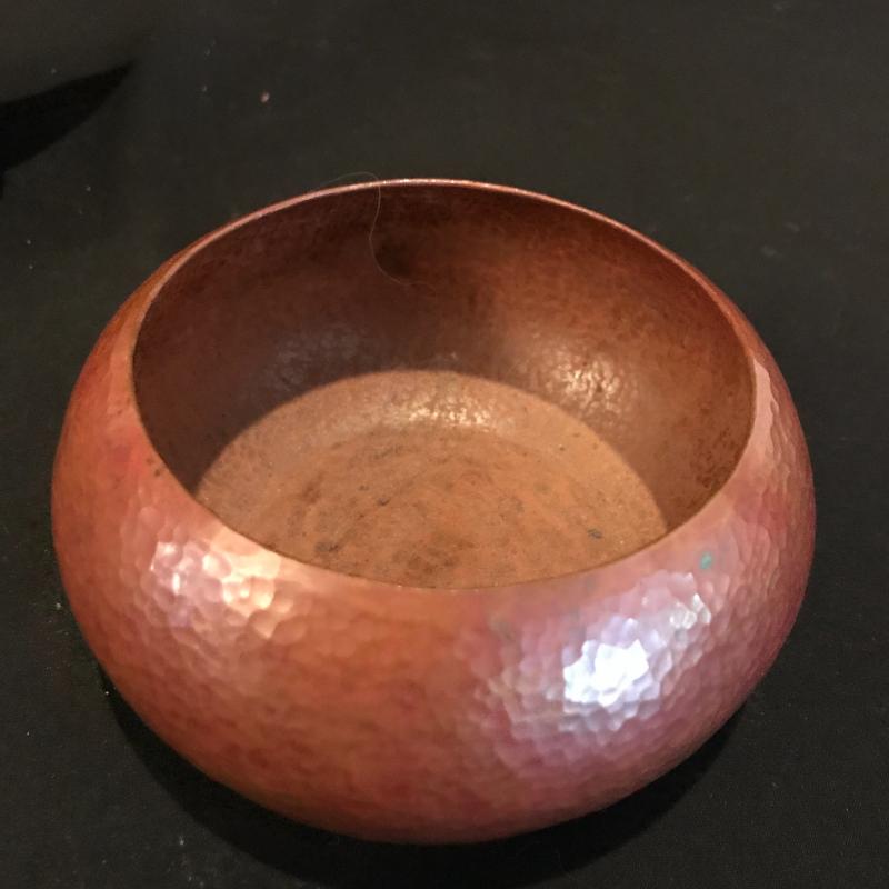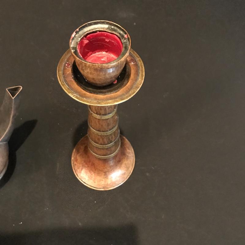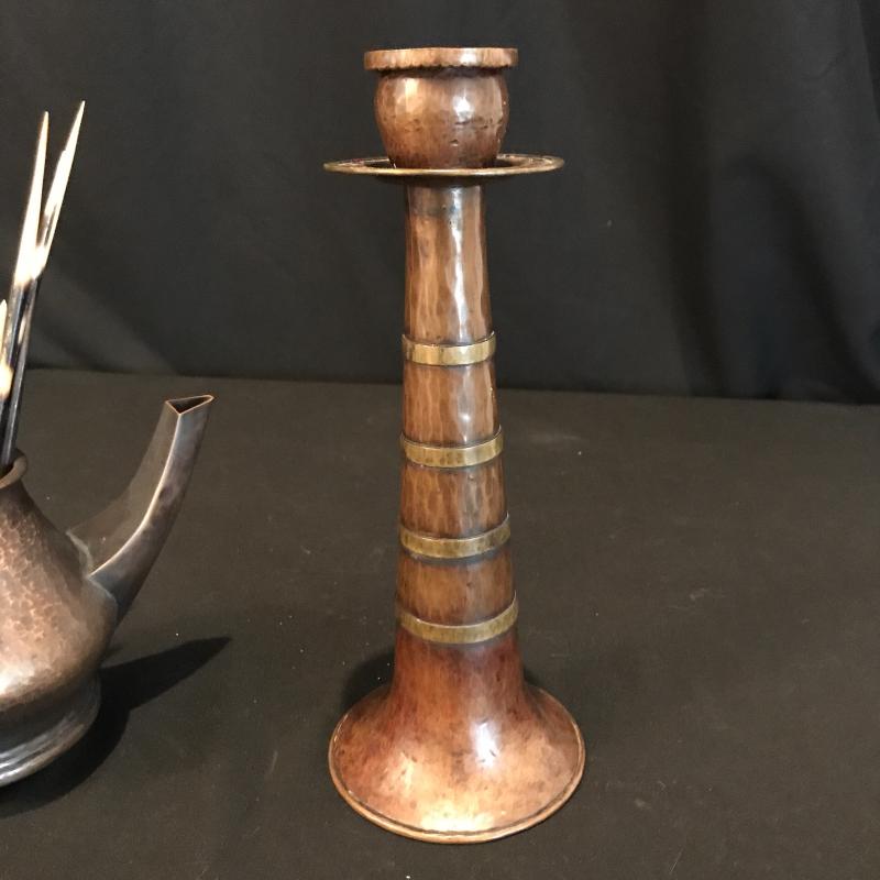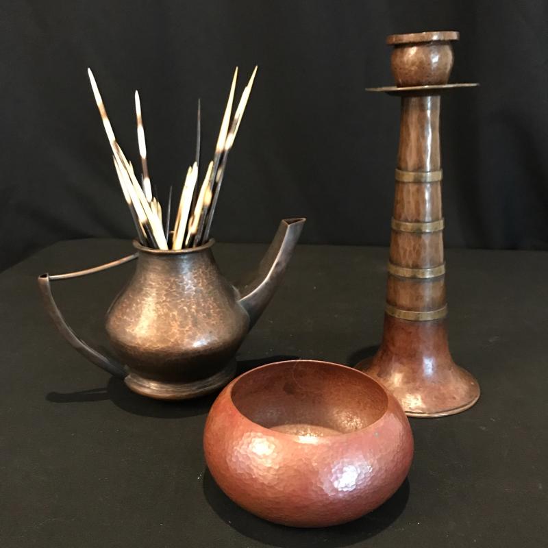 Beautiful Copper Pieces handmade by various artists. Candlestick has two metals and measures 10.5”l x 4”w. Small bowl is 5”d x 2.5”h. Pitcher is 8”l x 3.5”w x 5”h. Porcupine quills are great decoration. Shipping or local pick up in Asheville