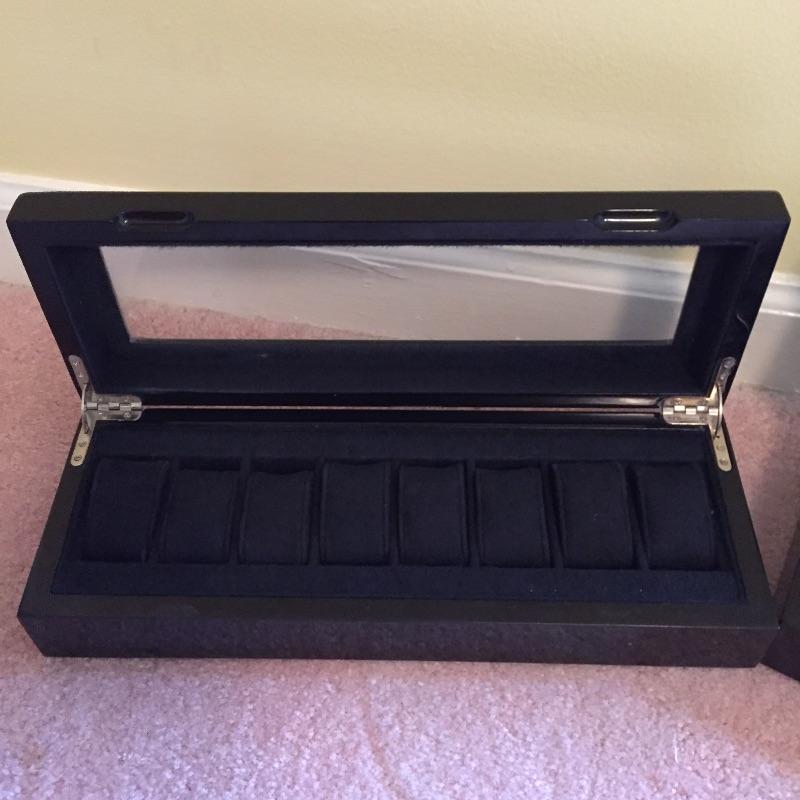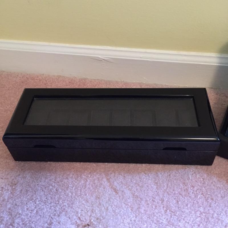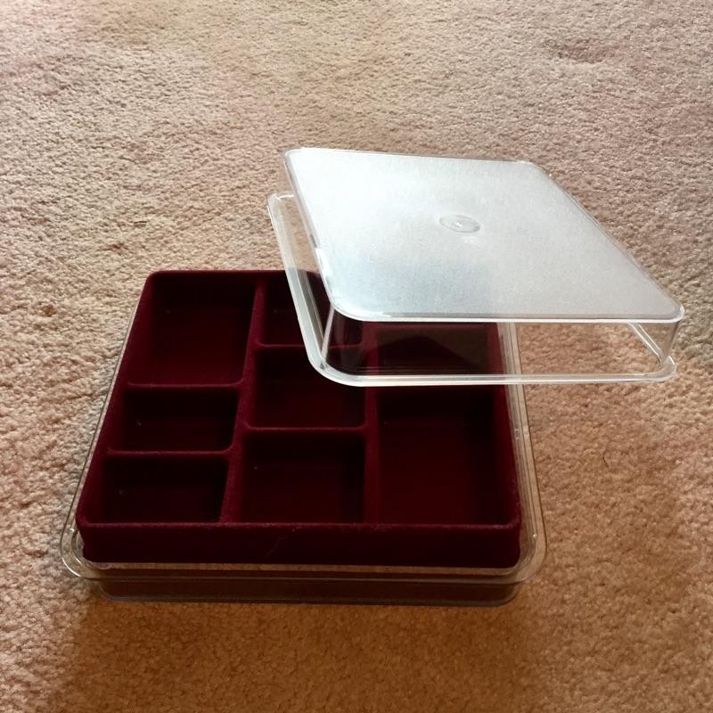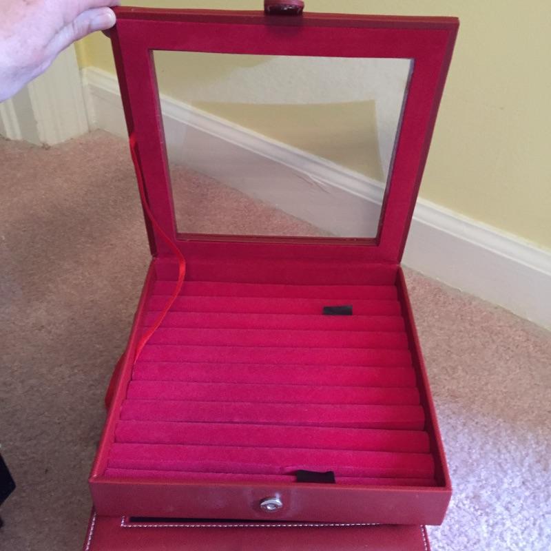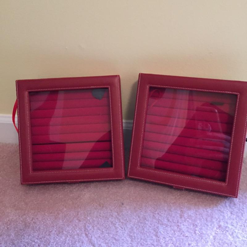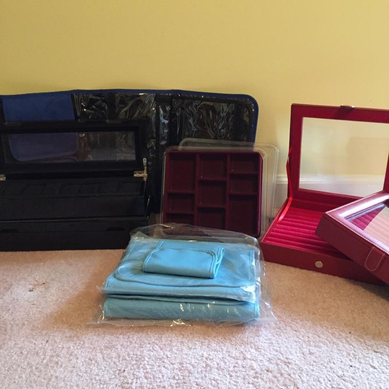 Nice selection of storage options for your precious jewelry pieces here. Multiple storage options include 2 black cases that could hold bracelets or possibly watches, two red ring holder cases and an assortment of soft travel style storage cases. Some of these items are still in original wrapping or have barely been used.