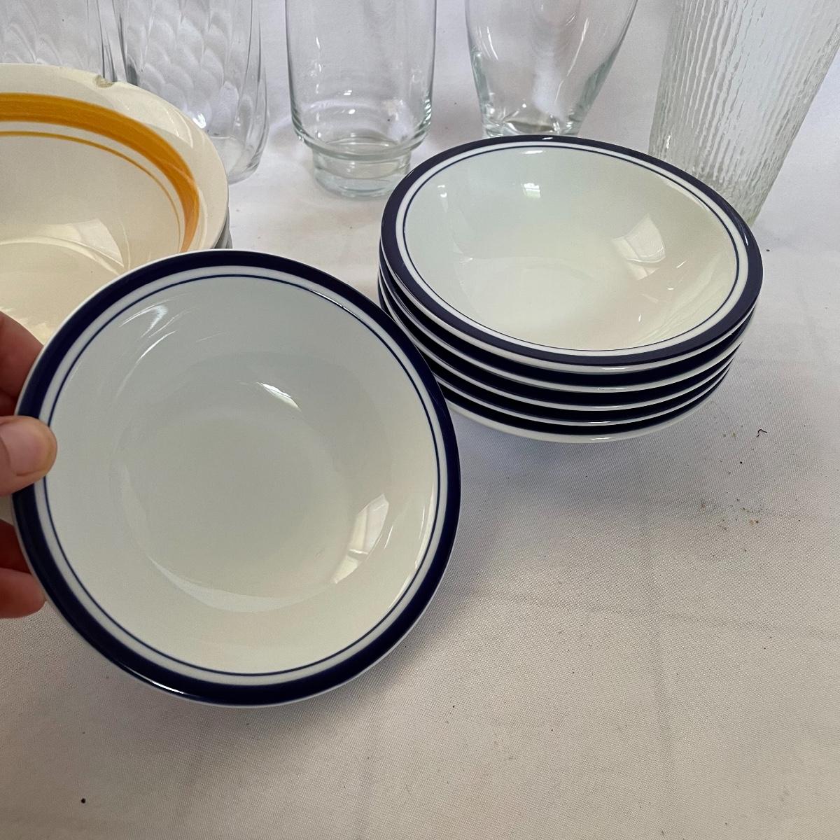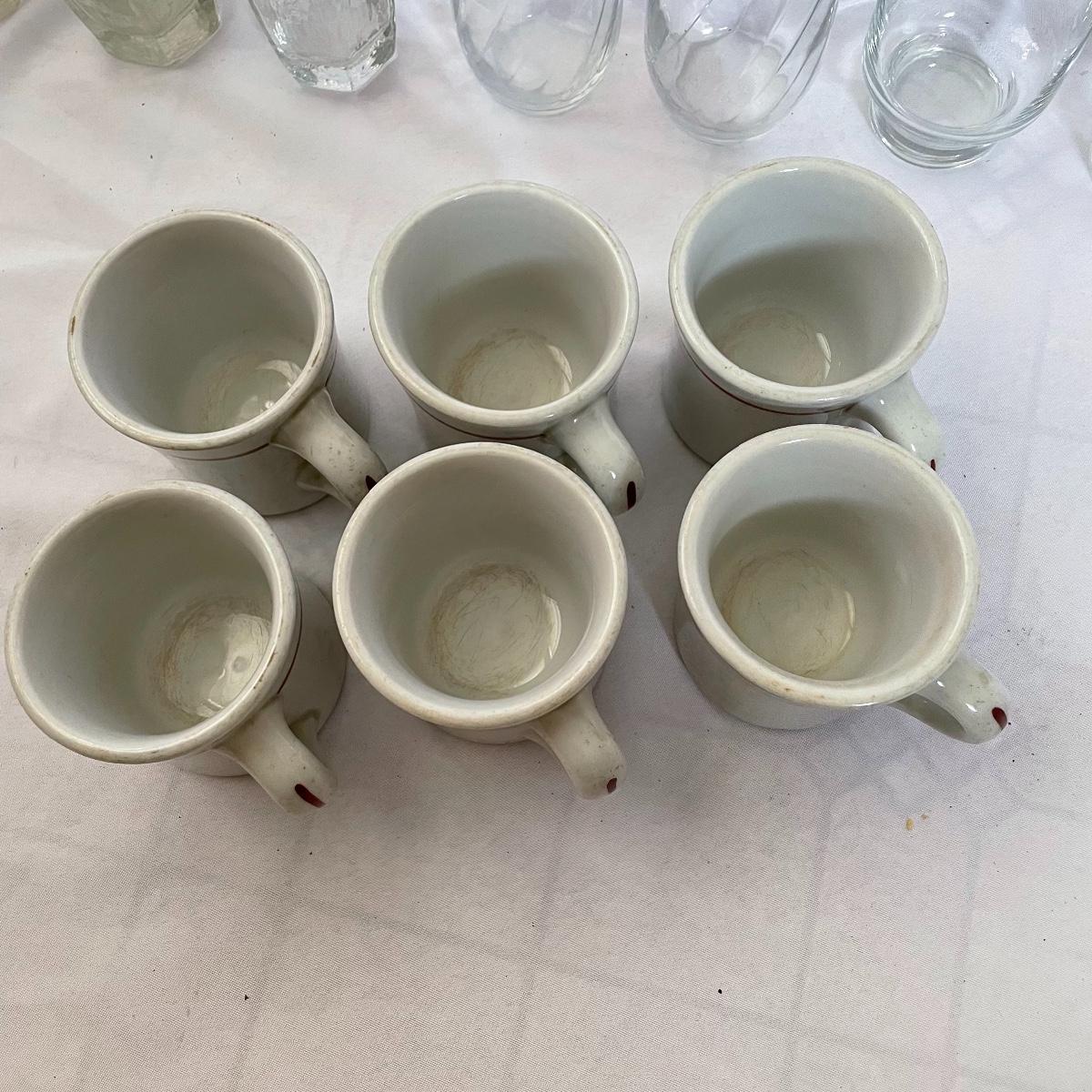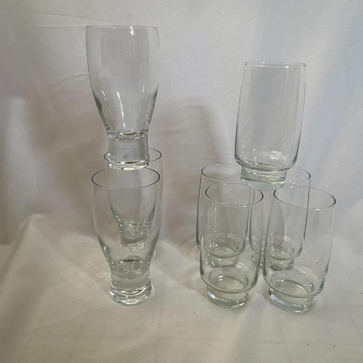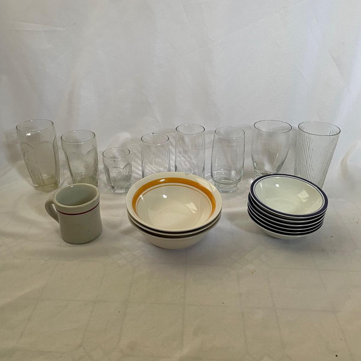 This is a great start to a new kitchen. Lot includes six small bowls and three larger (one has a chip). Six heavy mugs, and a plethora of glassware for your favorite beverages. Lot also includes five elusive ice tea spoons with a neat design. The final image with glasses in images (the image with the tea spoons) are 6.5” tall. Local pick up only.