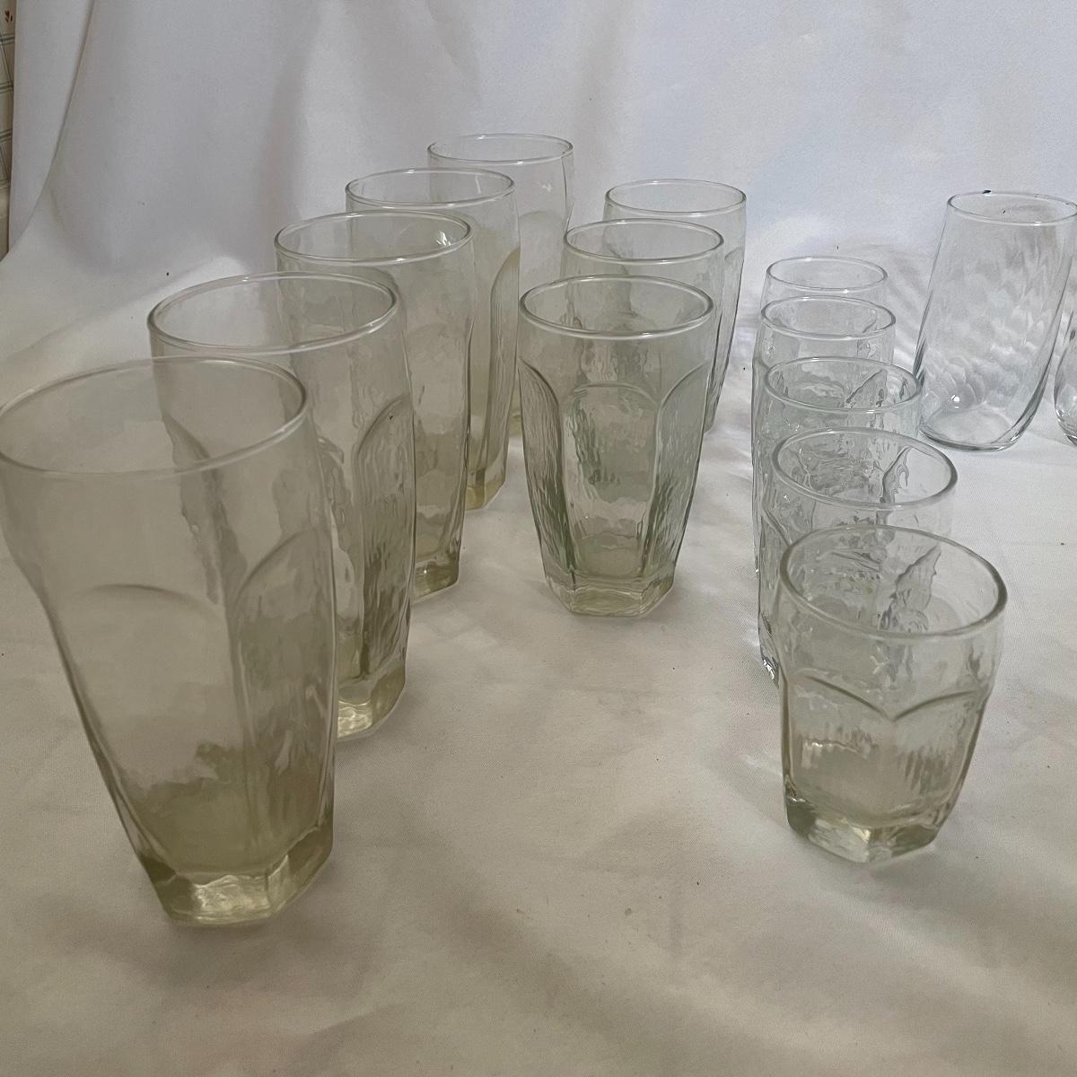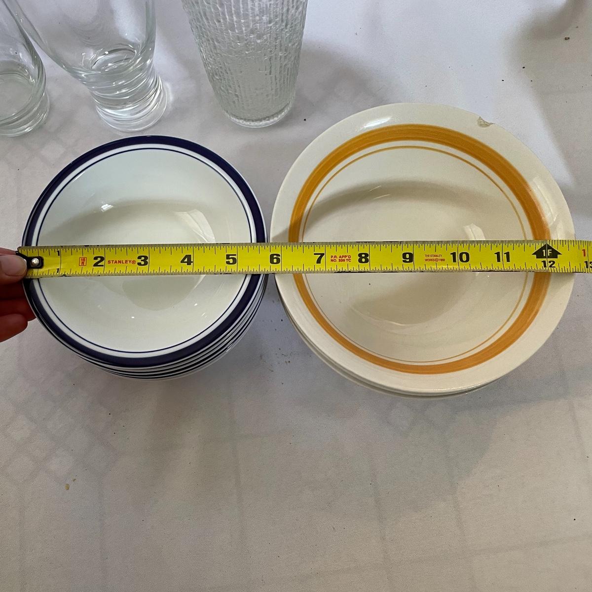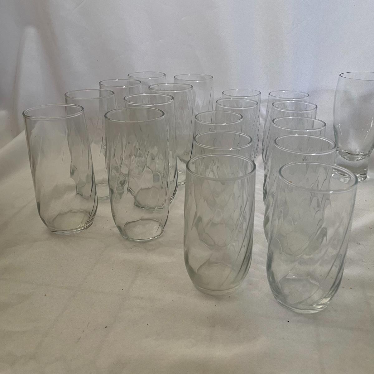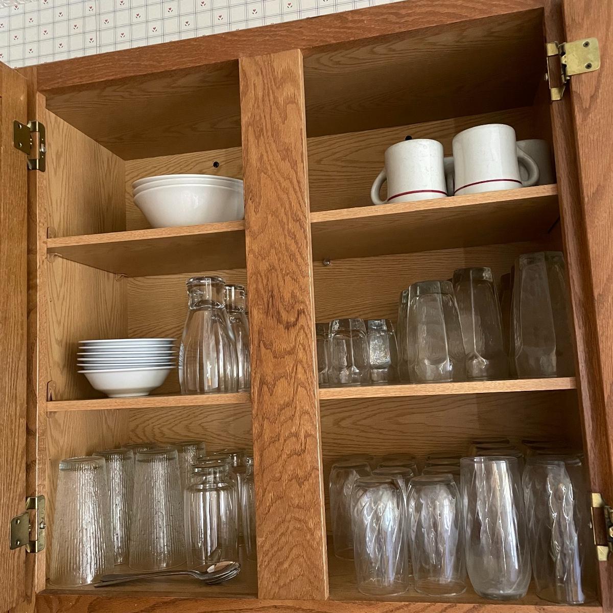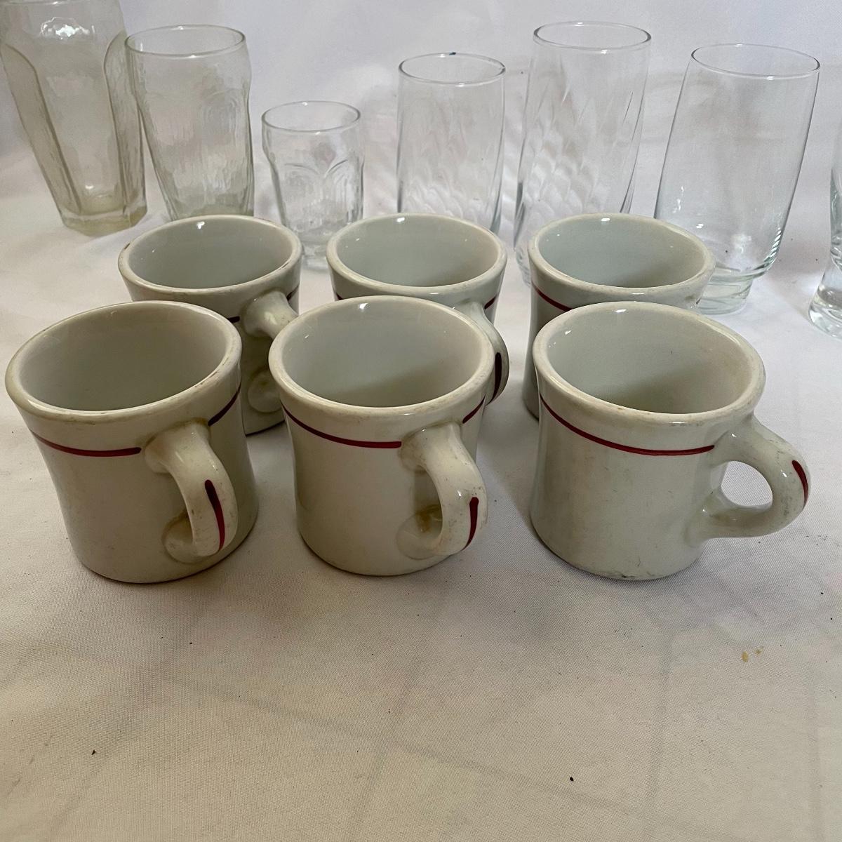 This is a great start to a new kitchen. Lot includes six small bowls and three larger (one has a chip). Six heavy mugs, and a plethora of glassware for your favorite beverages. Lot also includes five elusive ice tea spoons with a neat design. The final image with glasses in images (the image with the tea spoons) are 6.5” tall. Local pick up only.