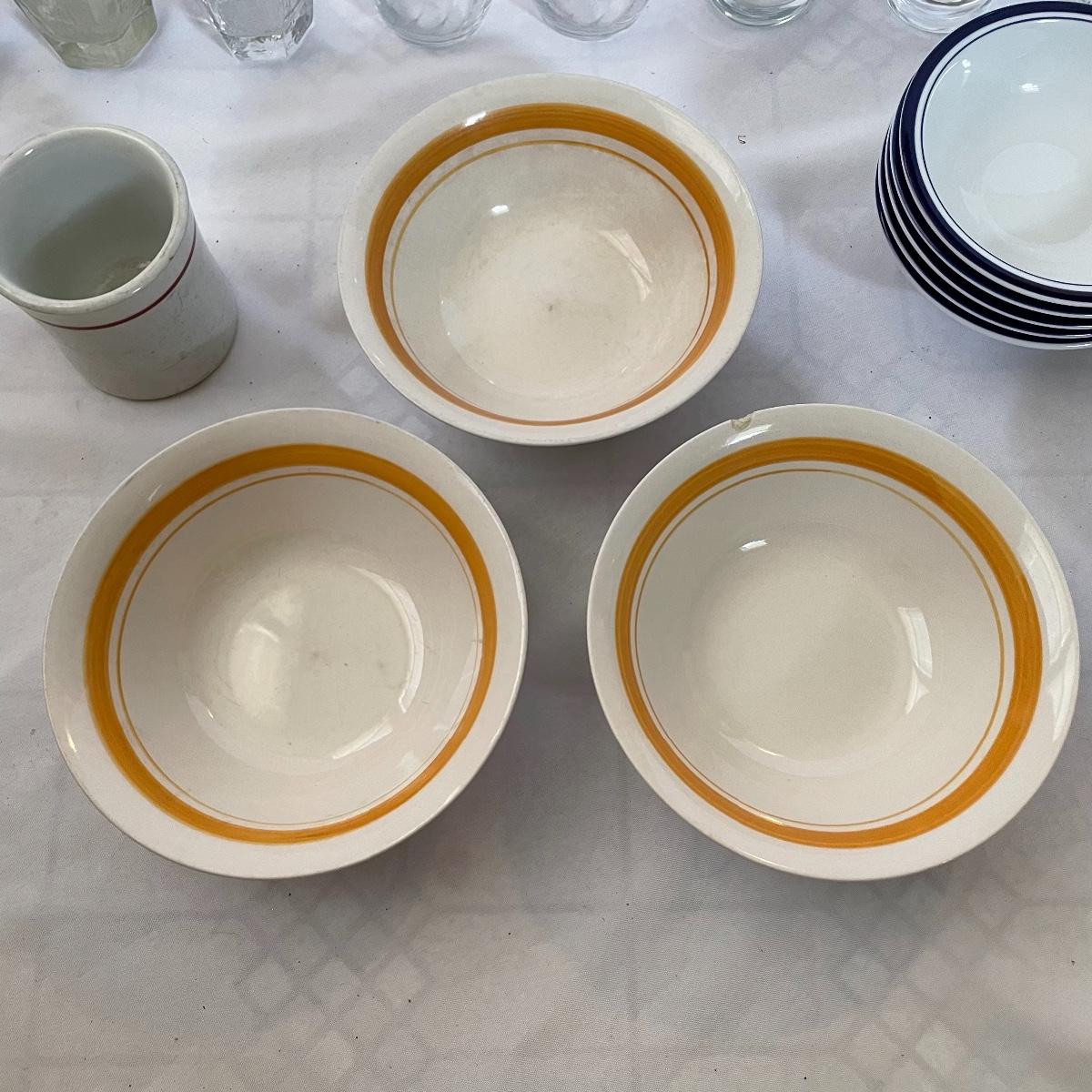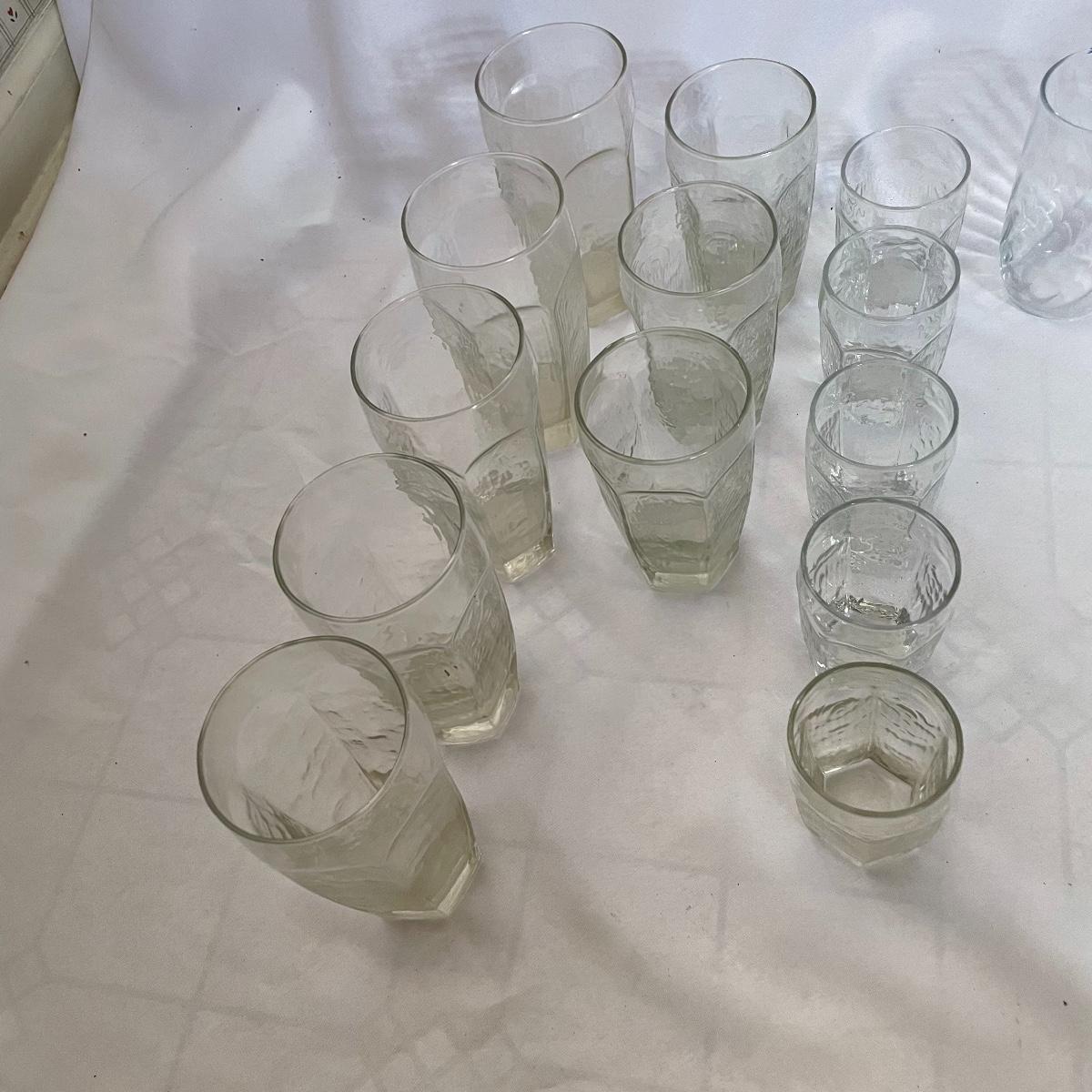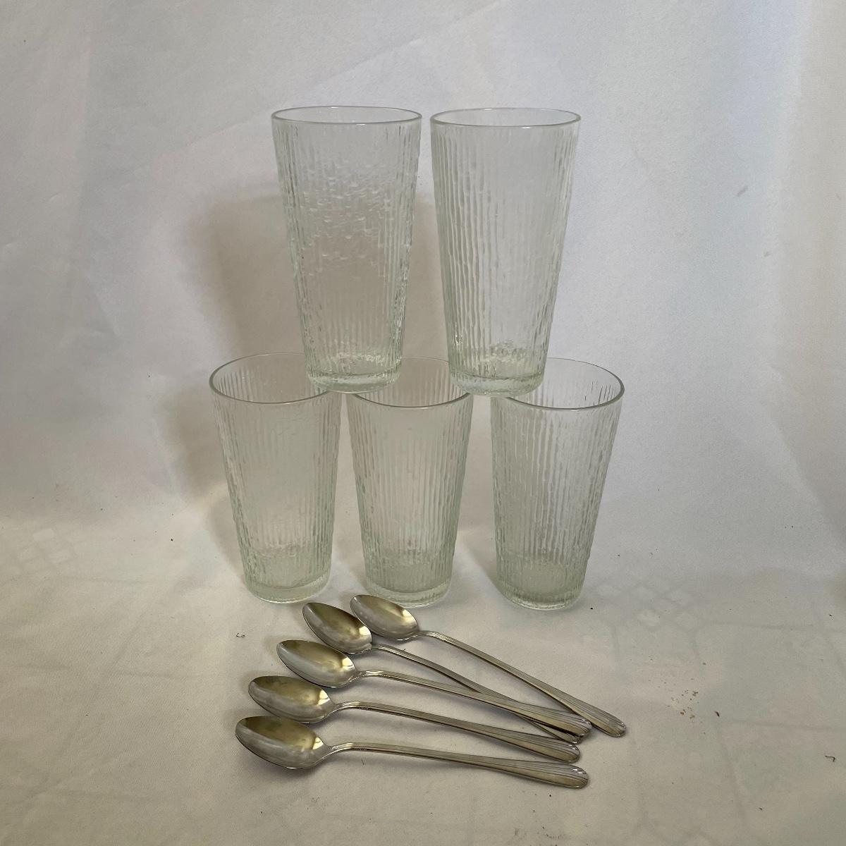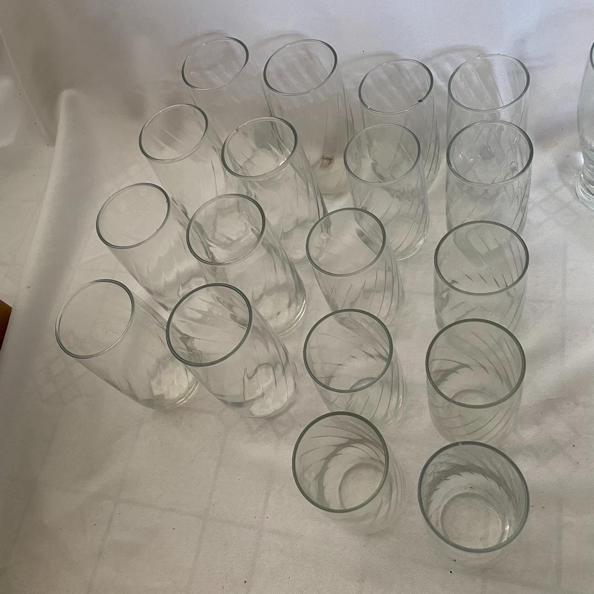 This is a great start to a new kitchen. Lot includes six small bowls and three larger (one has a chip). Six heavy mugs, and a plethora of glassware for your favorite beverages. Lot also includes five elusive ice tea spoons with a neat design. The final image with glasses in images (the image with the tea spoons) are 6.5” tall. Local pick up only.