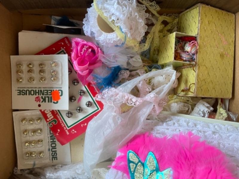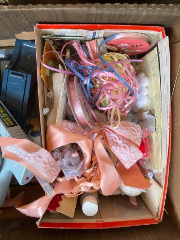 Lot 131. Large lot of crafting supplies, glue gun and sticks, spools of lace, belts, cotton floss patterns for crafts, bells, ribbon, etc.--$7