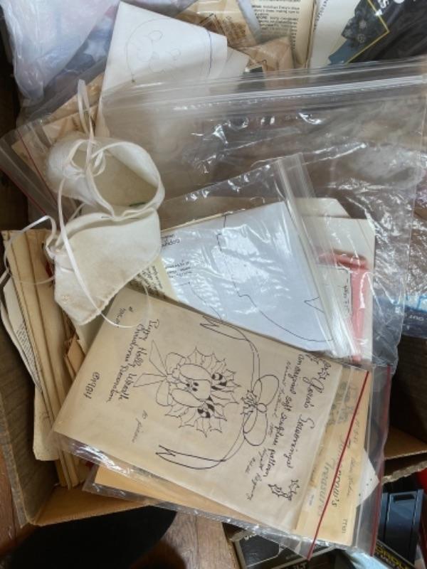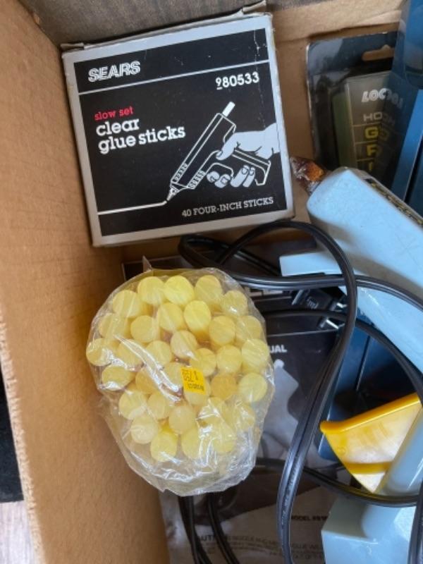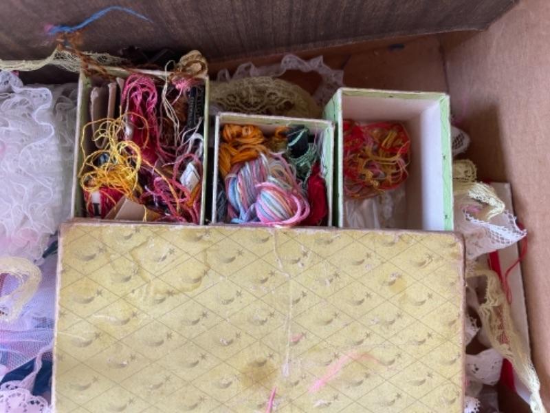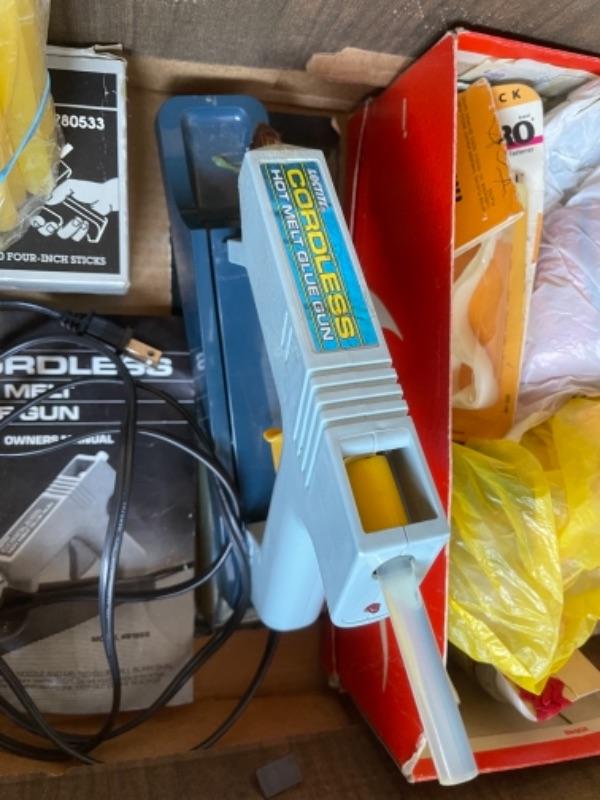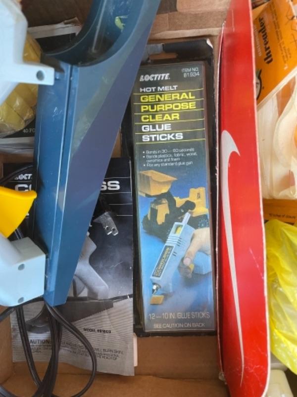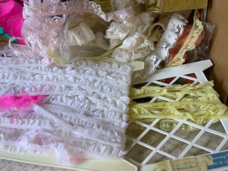 Lot 131. Large lot of crafting supplies, glue gun and sticks, spools of lace, belts, cotton floss patterns for crafts, bells, ribbon, etc.--Was $15 - -Now $7