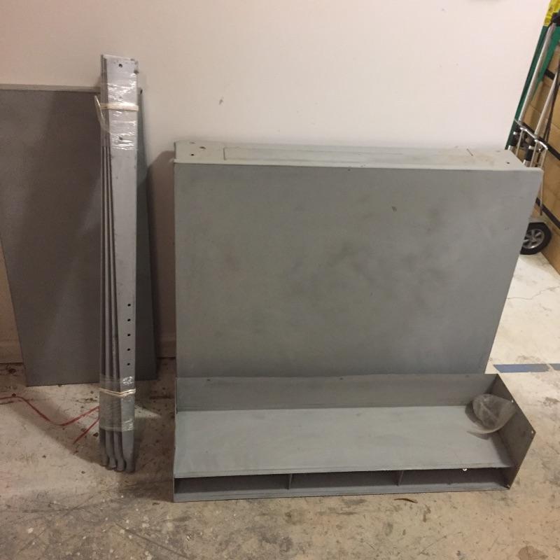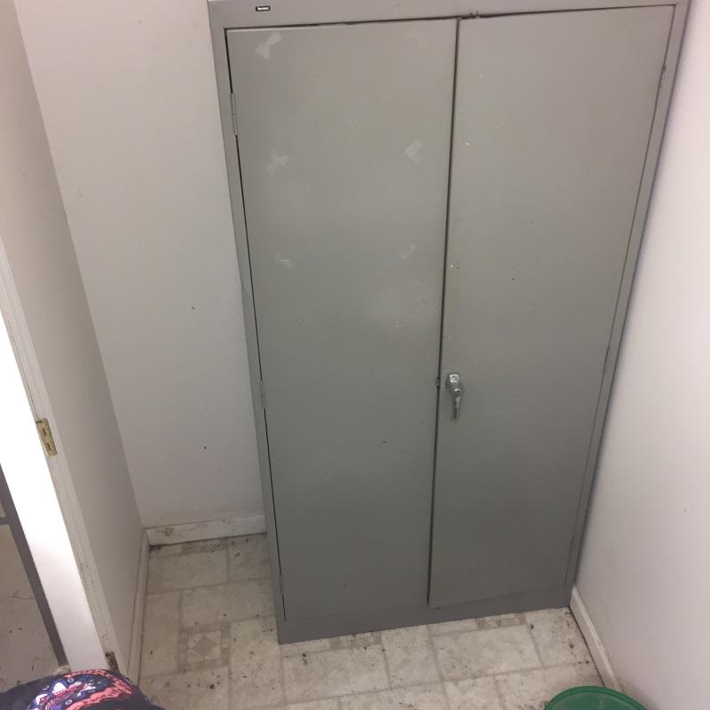 Large metal desk and cabinet. This heavy duty desk has a large drawer and letter slots. Cabinet has 4 shelves and measures 72” x 36” x 18”.