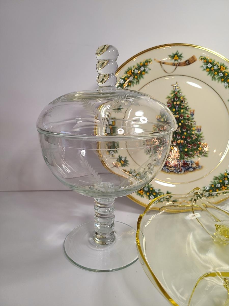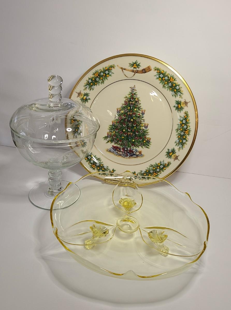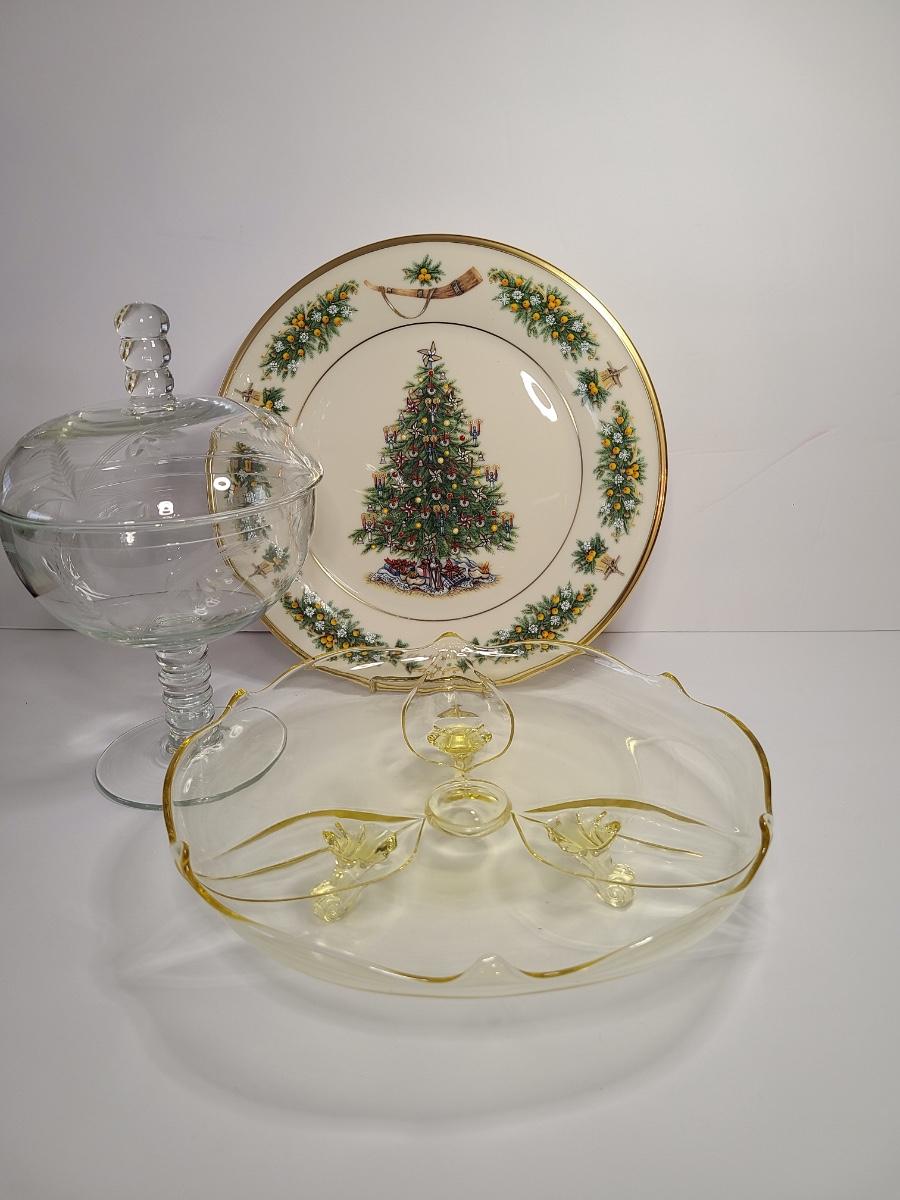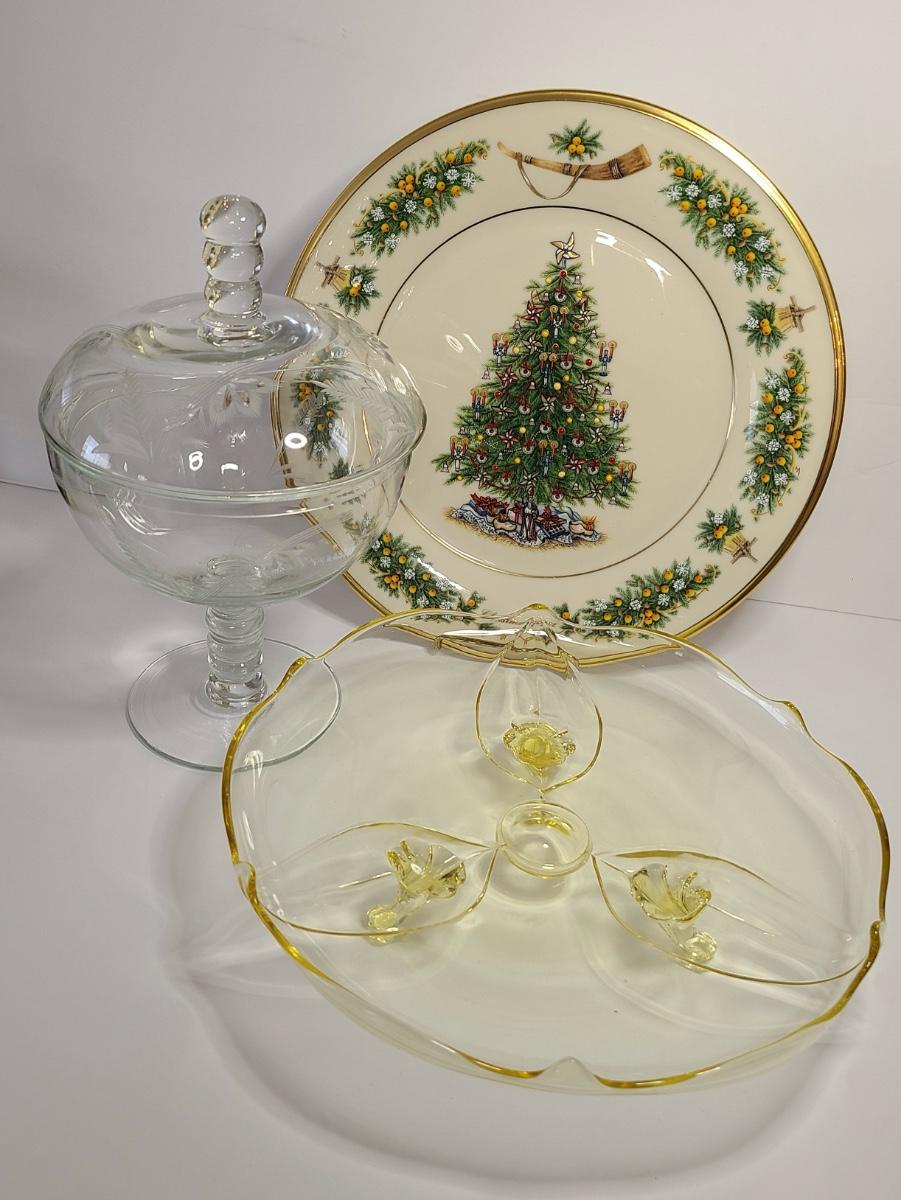 Lot 131: Lenox Holiday Plate, Yellow Depression Glass Footed Cake Plate & Elegant Lidded Candy